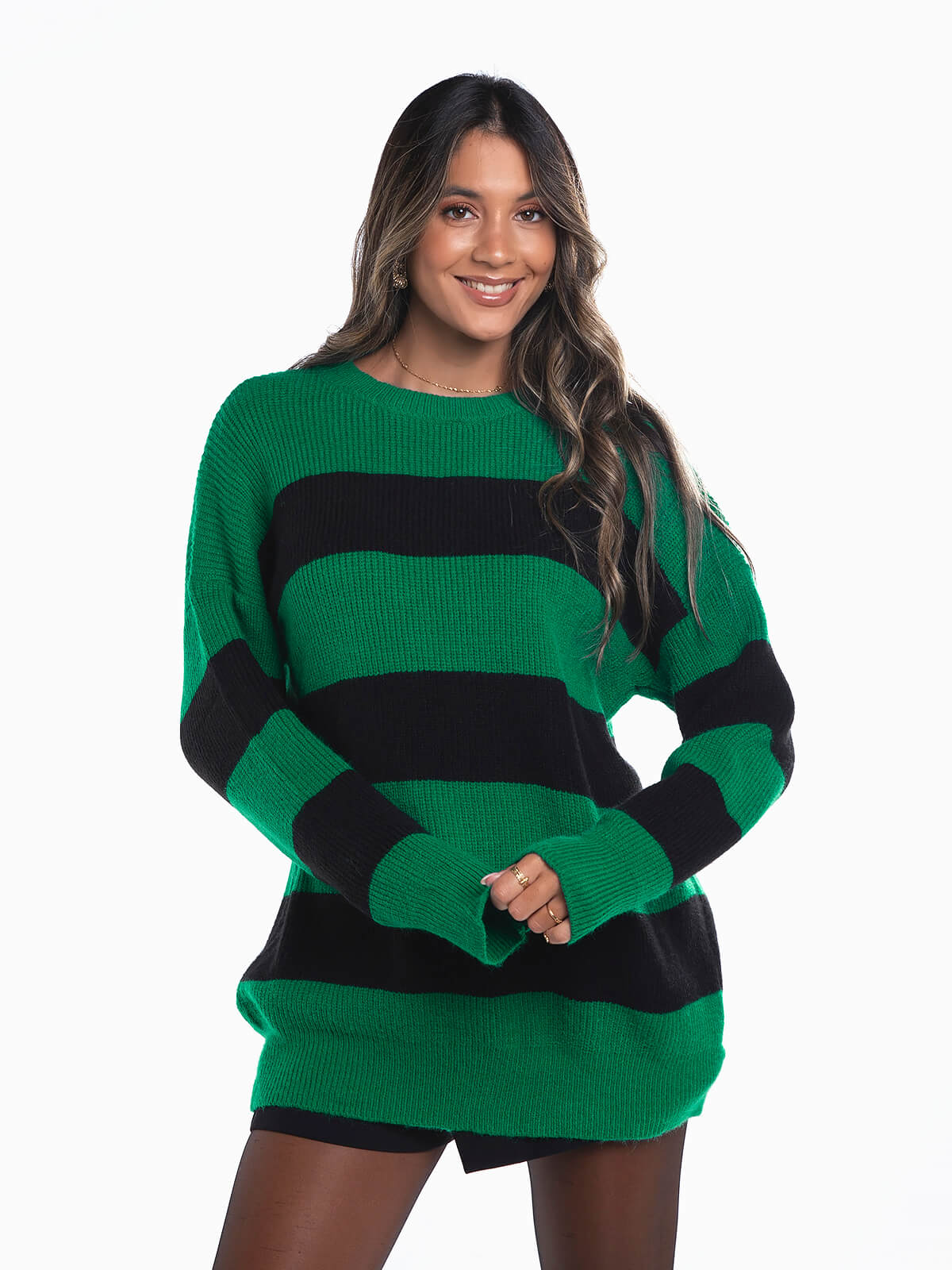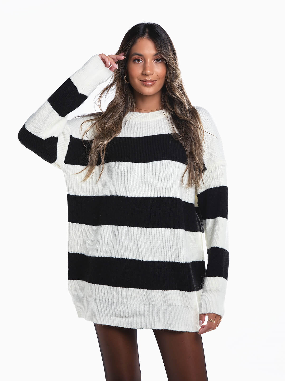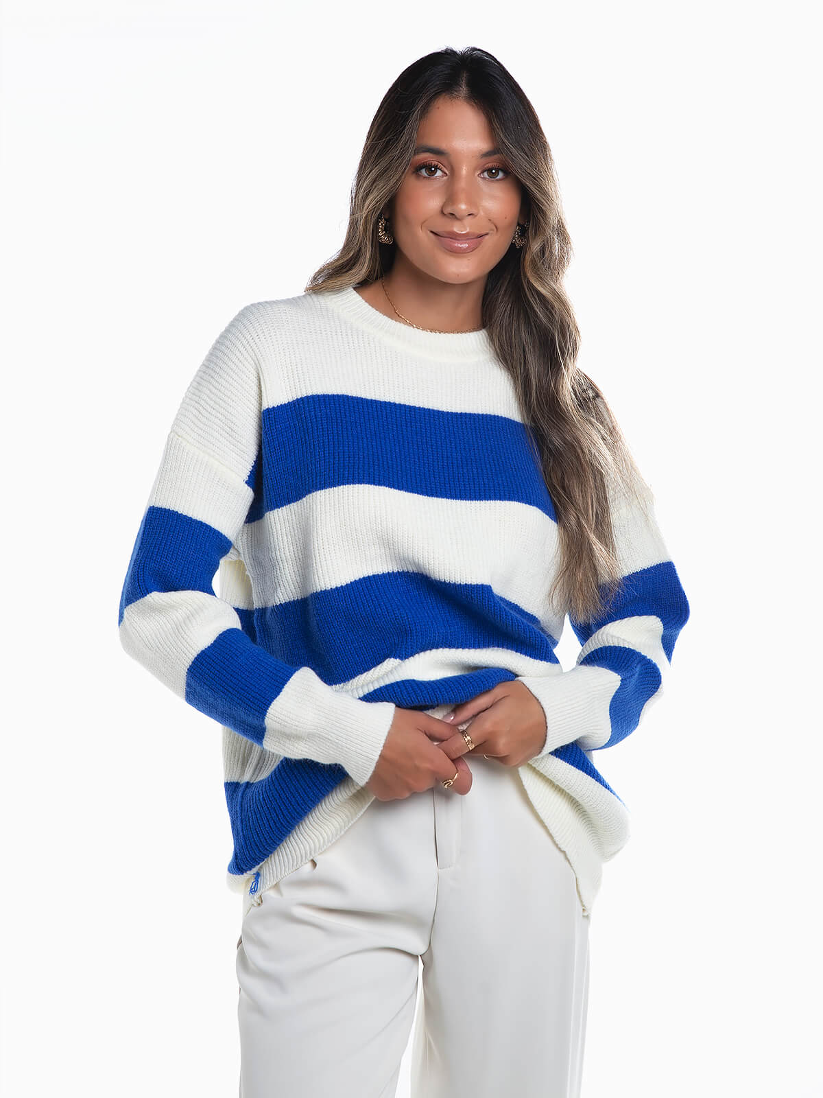 Camisola oversize em malha mistura lã com riscas para senhora. Camisola manga comprida com decote redondo.