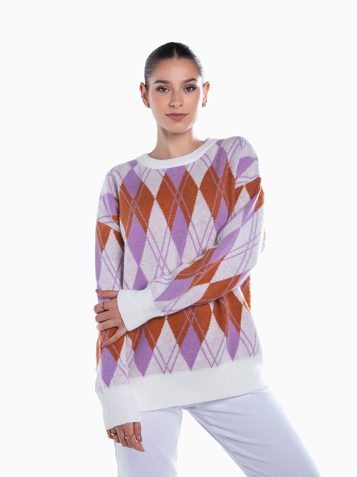 Camisola oversize de malha com losangos para senhora. Camisola de manga comprida com decote redondo. Extremidades caneladas.