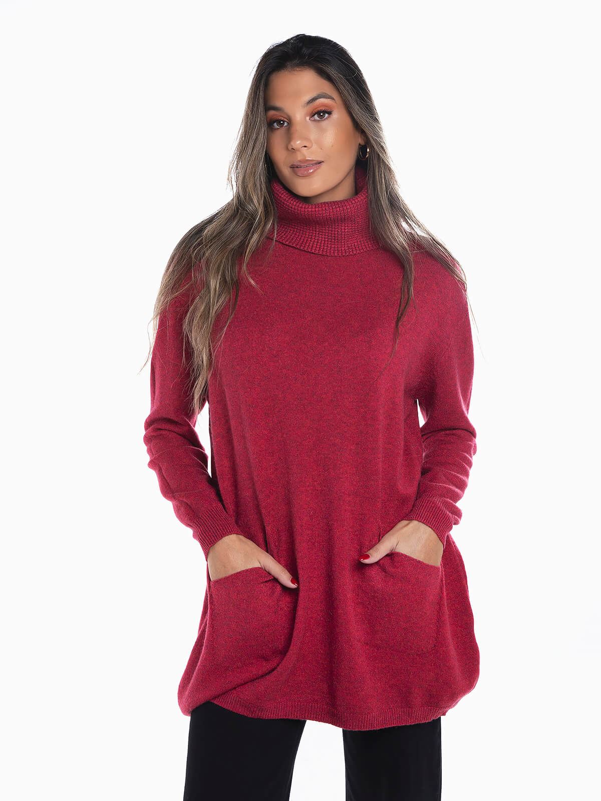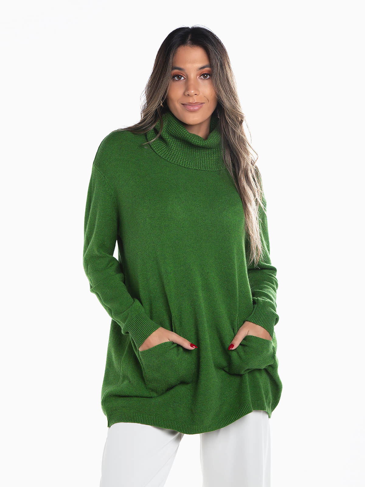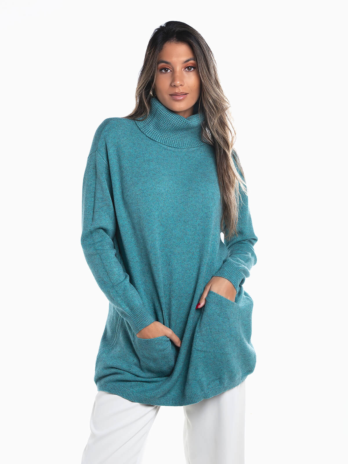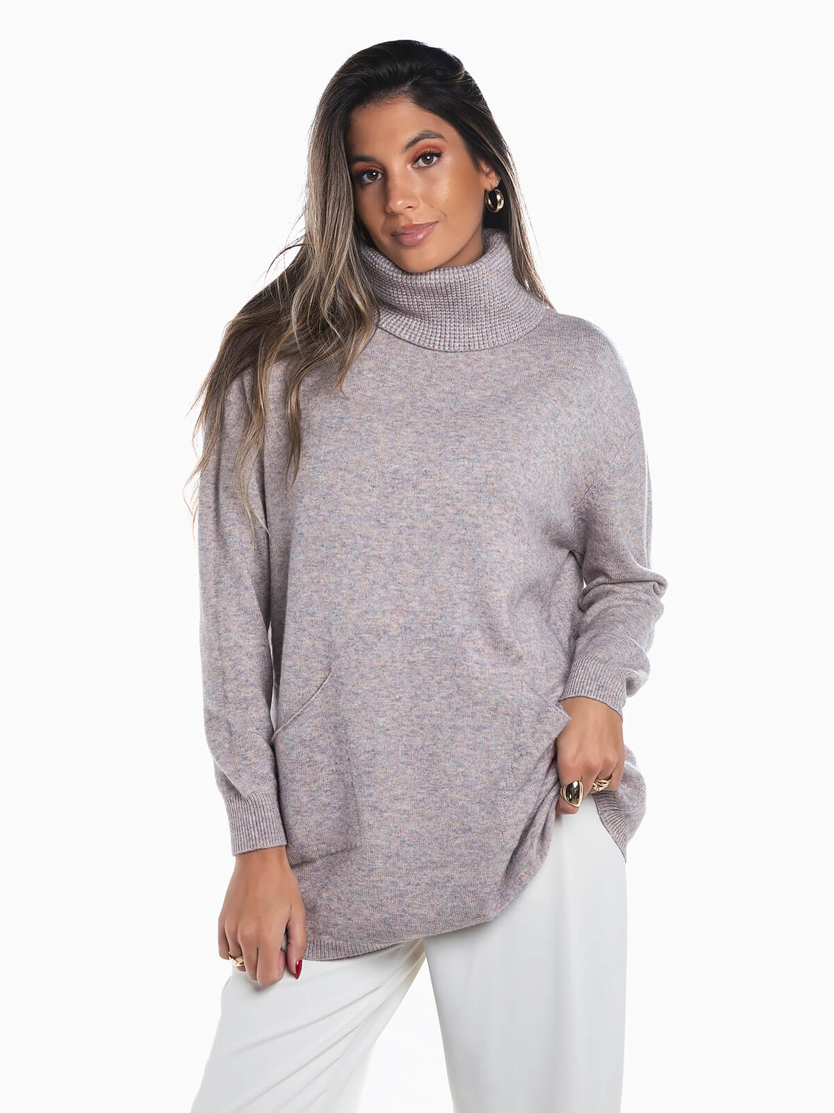 Camisola oversize em malha mesclada para senhora. Camisola manga comprida com gola alta estruturada. 2 bolsos. Acabamentos canelados.