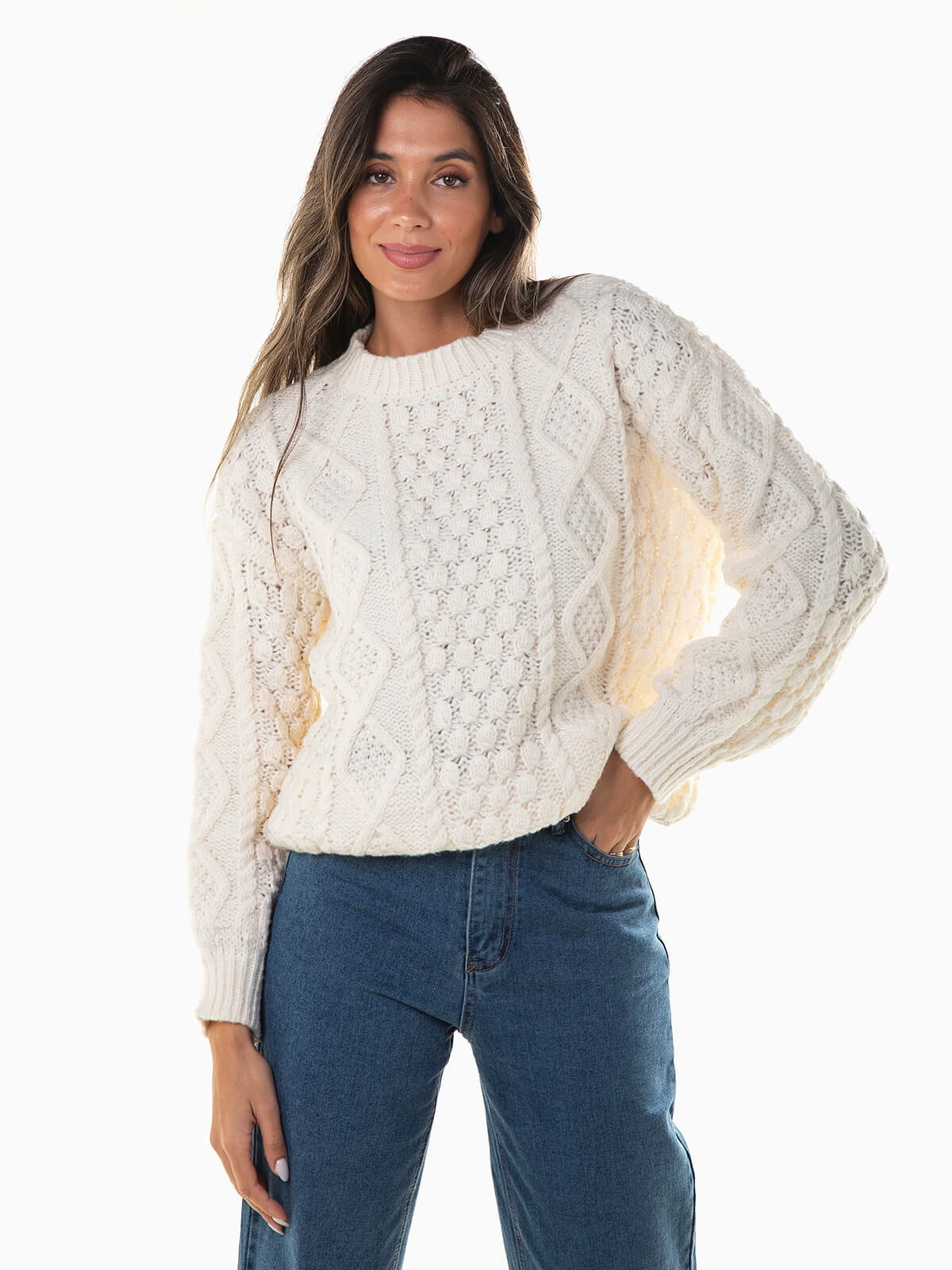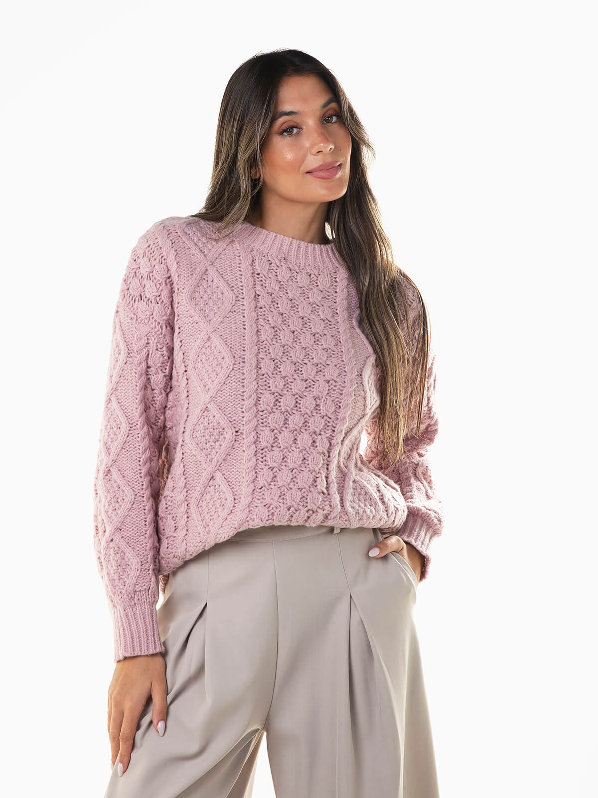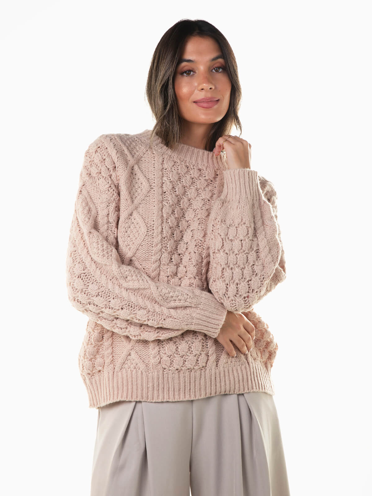 Camisola oversize em malha com torcidos e losangos. Camisola manga comprida confecionada em tecido com lã para maior conforto térmico. Decote redondo e acabamentos canelados.