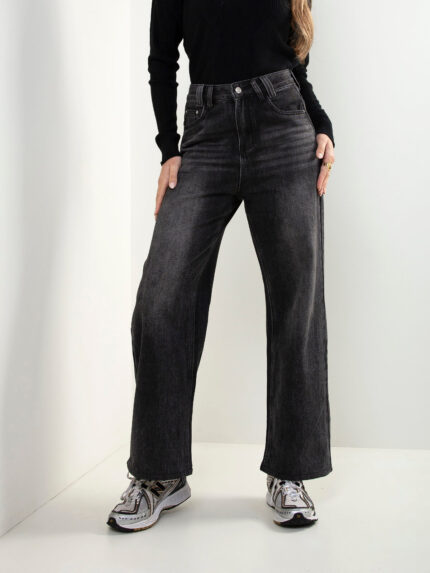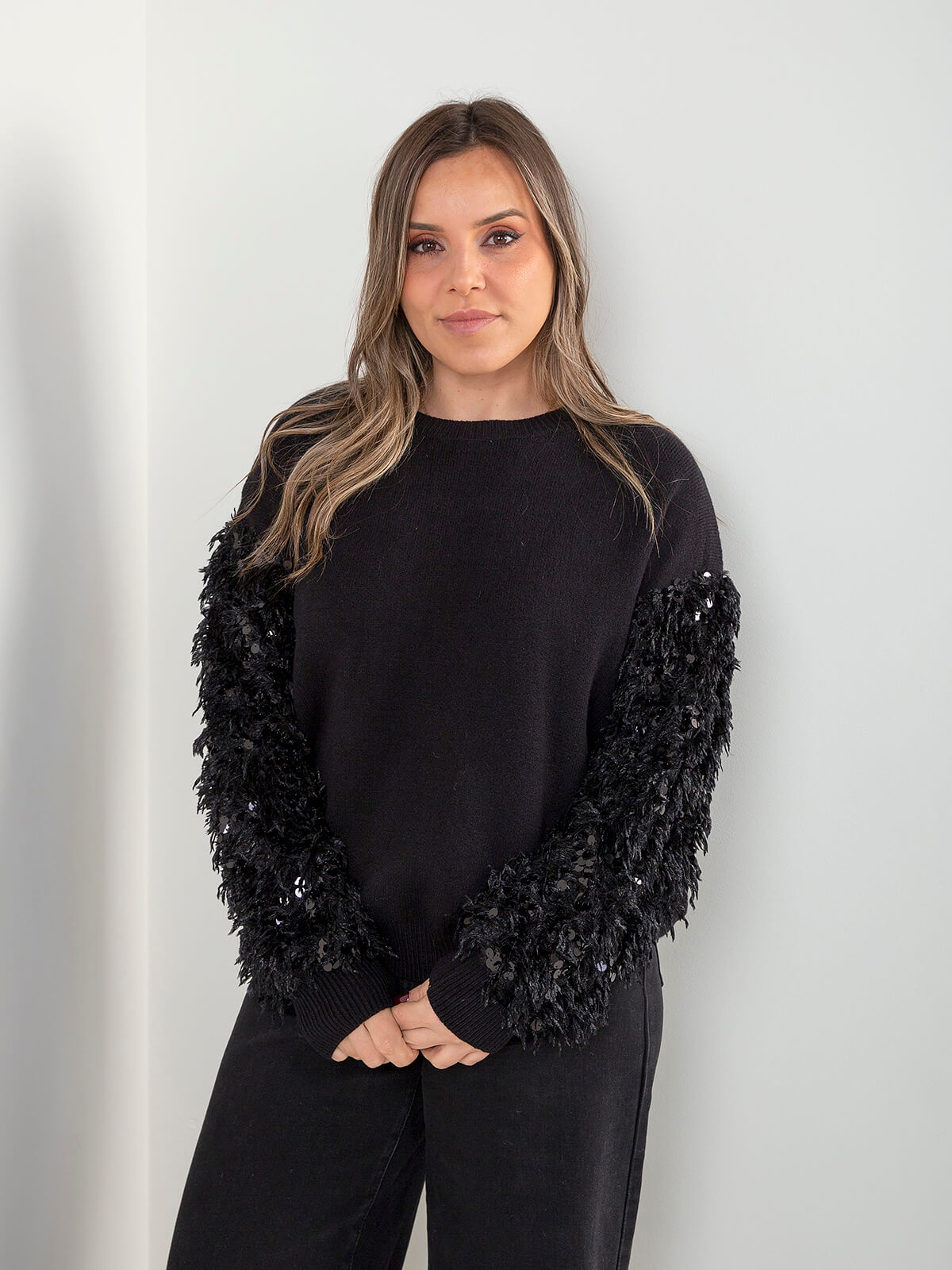 Camisola de malha lisa com decote redondo e manga comprida. Mangas trabalhadas com aplicação de lantejoulas e penas, criando contraste e detalhe visual. Acabamentos canelados na gola, punhos e base.