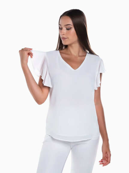 Camisola preta em malha canelada para senhora. Camisola manga balão combinada com tule. Gola alta. Corte justo.