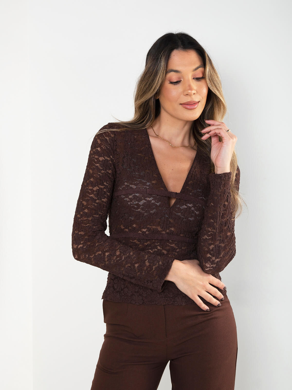 Camisola em malha rendilhada de toque delicado, com decote em V e detalhe central que estrutura a peça. Modelo de manga comprida, elegante e feminino, ideal para looks mais cuidados sem perder leveza. Perfeita para conjugar com peças lisas e tons neutros.