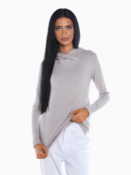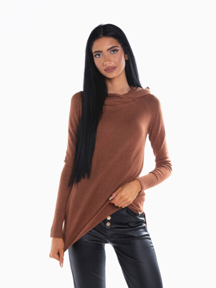 Camisola verde clara em malha com pelo de toque suave. Camisola manga comprida com decote redondo acabado em corrente dourada. Detalhe aberto à frente.