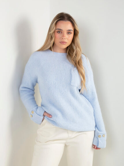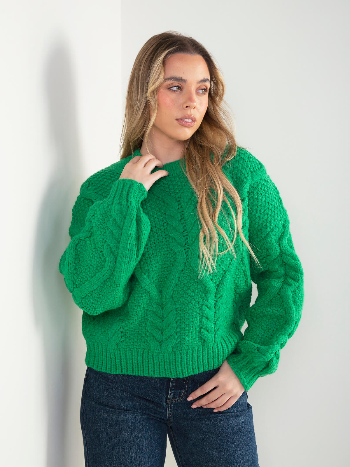 Camisola de malha verde com padrão entrançado, gola redonda e acabamento canelado. Modelo confortável e versátil, ideal para looks de inverno com jeans ou calças de malha.