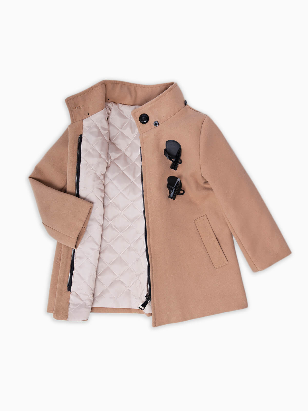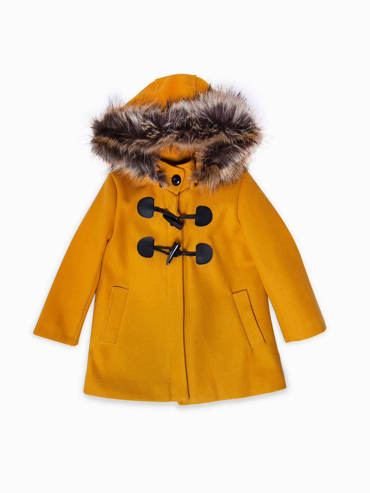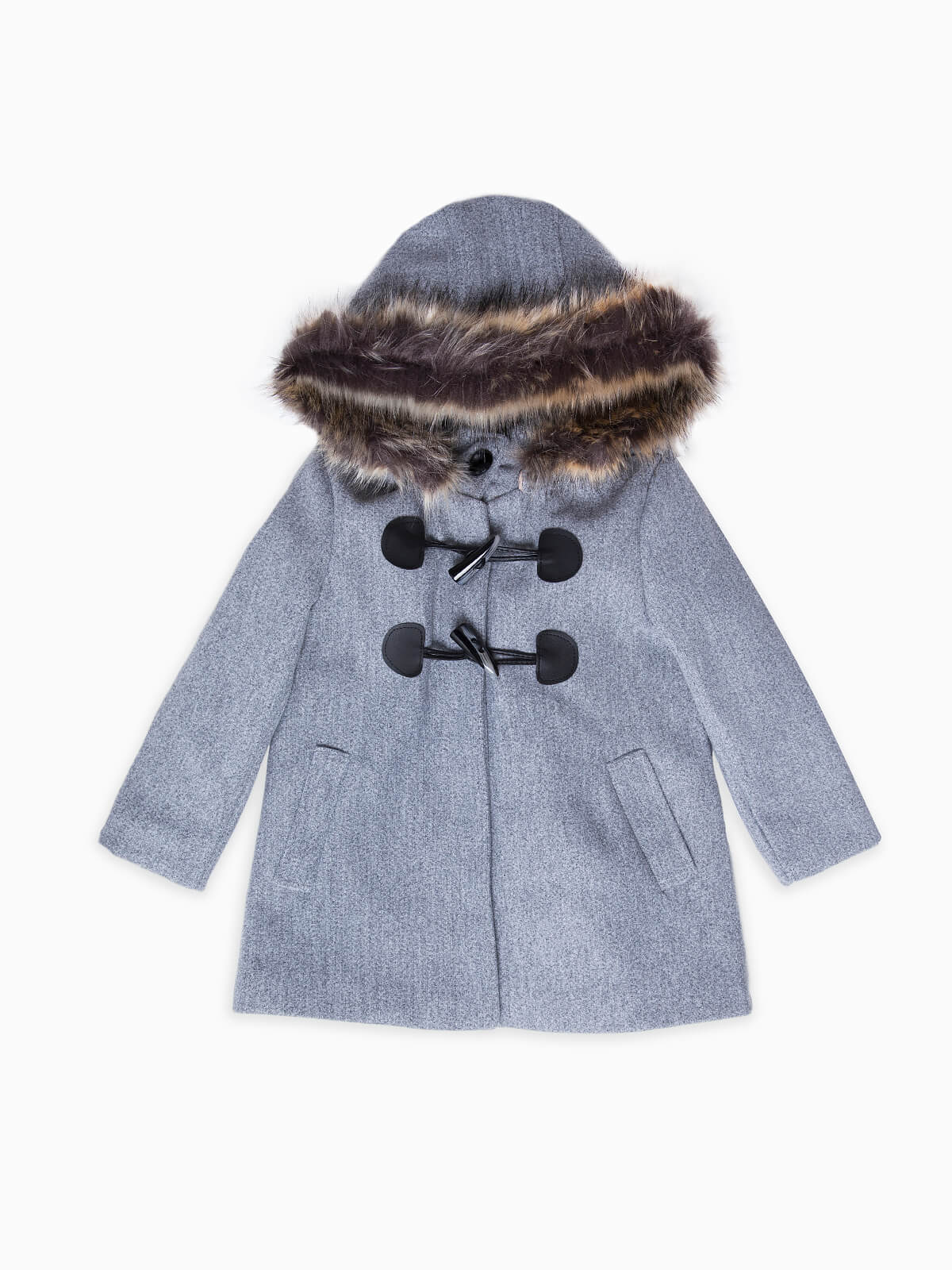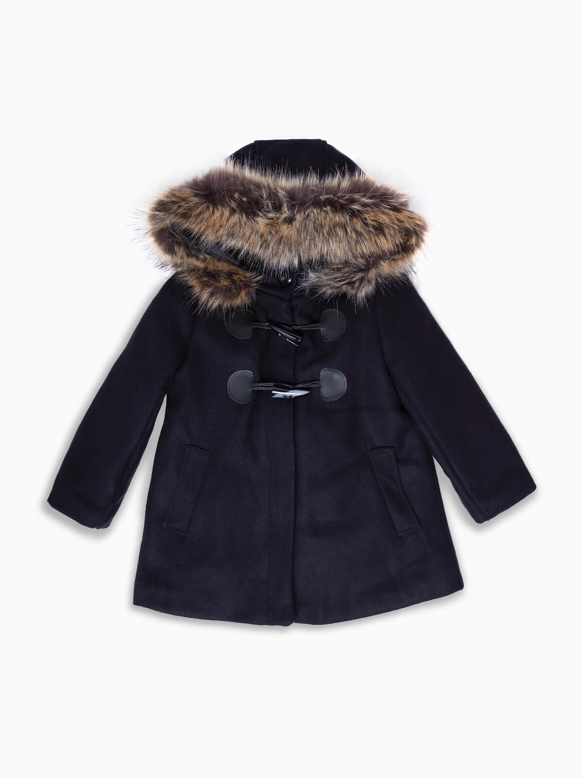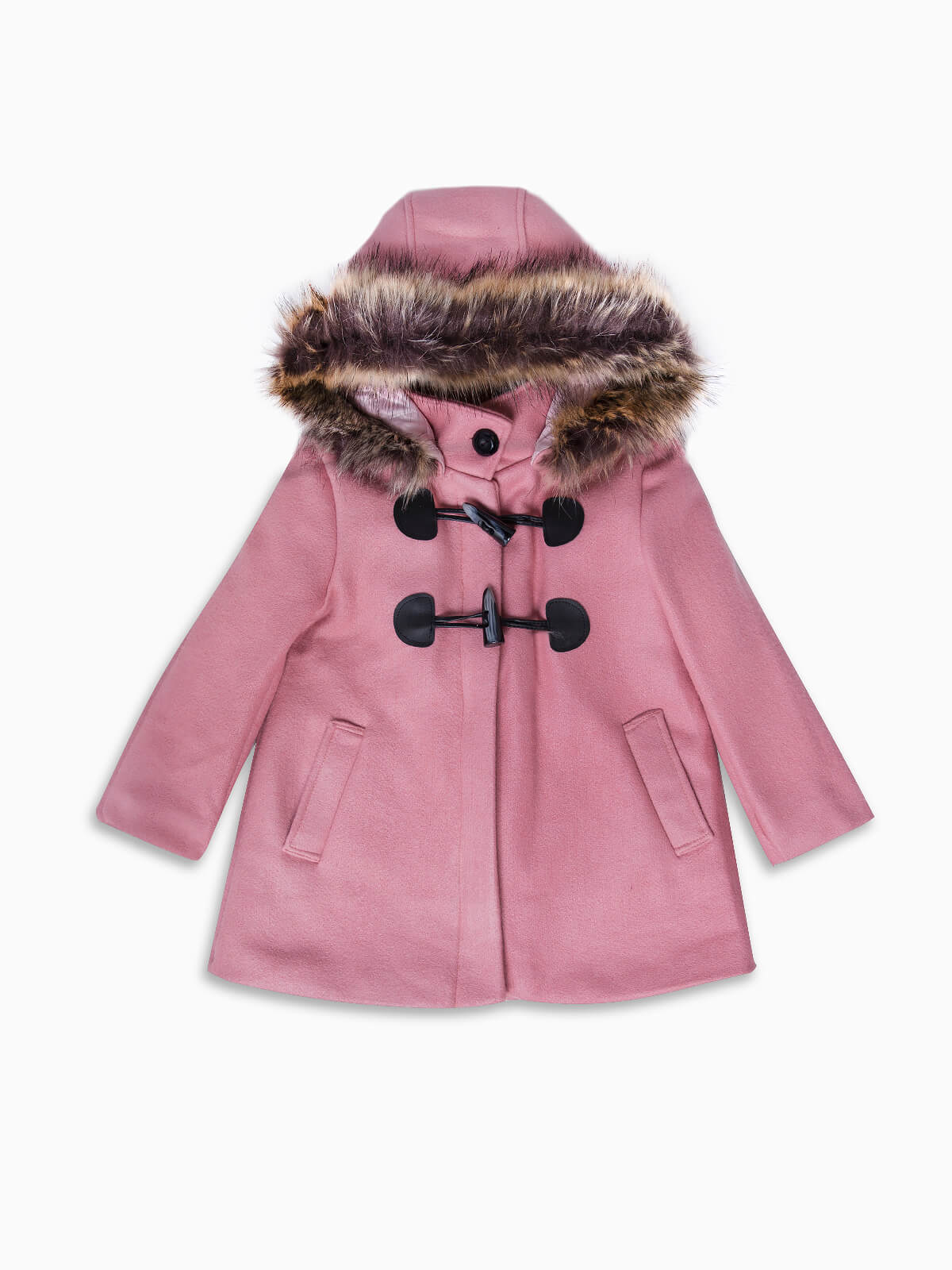 Canadiana em fazenda com capuz e alamares para menina. Capuz com pelo. Laço nas costas. Forro revestido.
