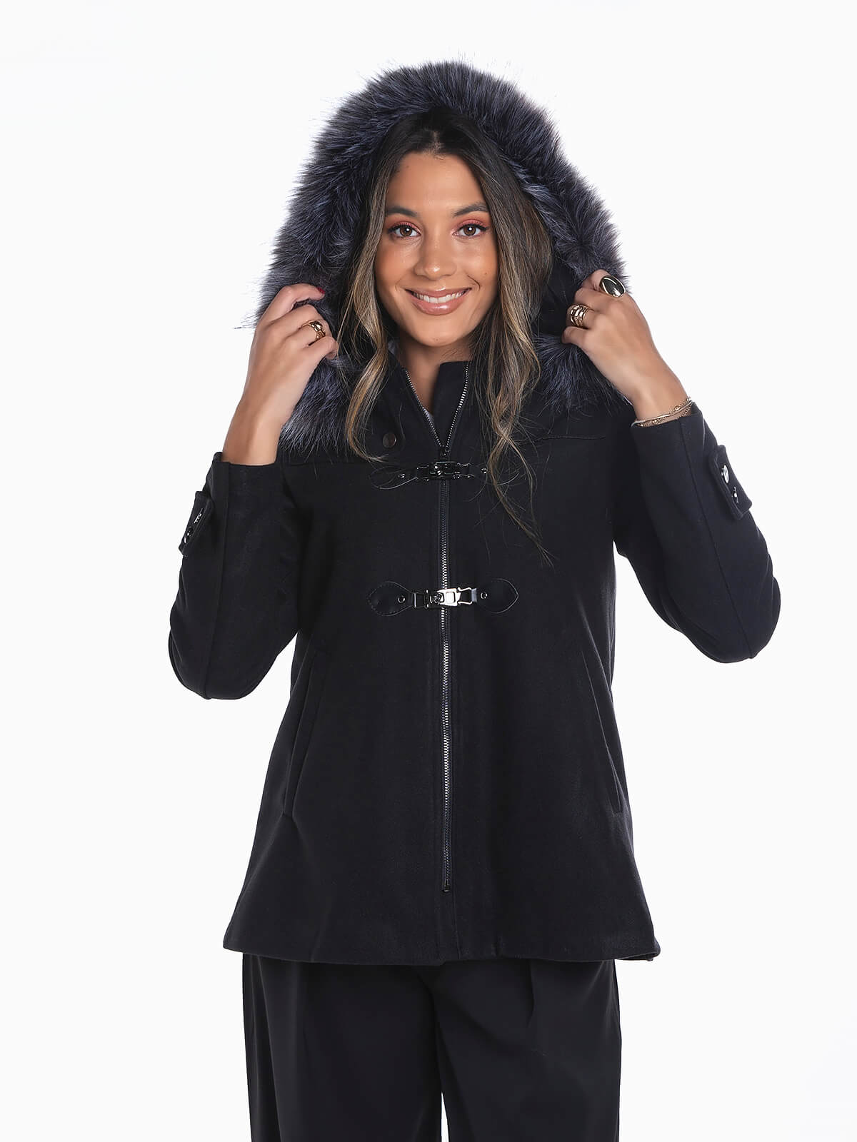Canadiana em fazenda capuz removível com pelo. Canadiana com gola subida e punhos abotoados. 2 bolsos com abertura debruada. Aperto de fecho zíper e colchetes.