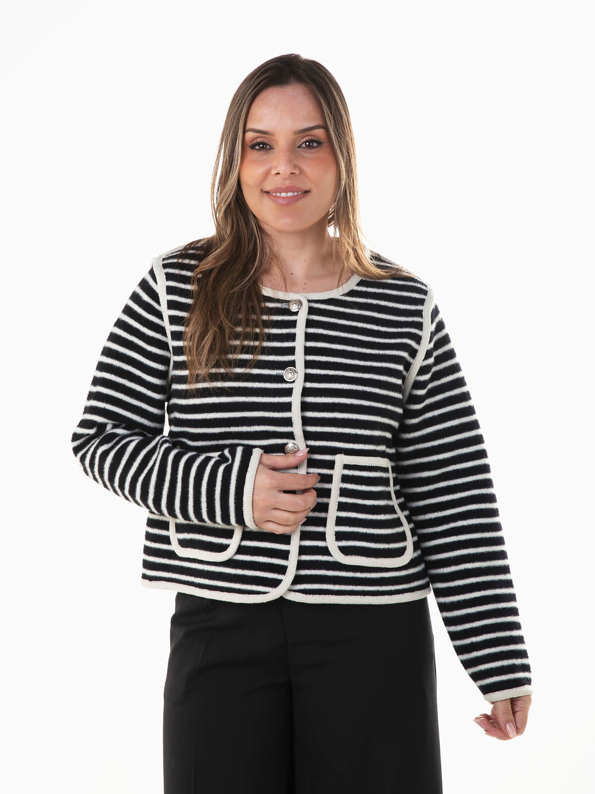 Cardigan às riscas com efeito pelo curto para mulher. Casaco malha de manga comprida com 2 bolsos quadrados. Decote redondo. Acabamentos de botões.