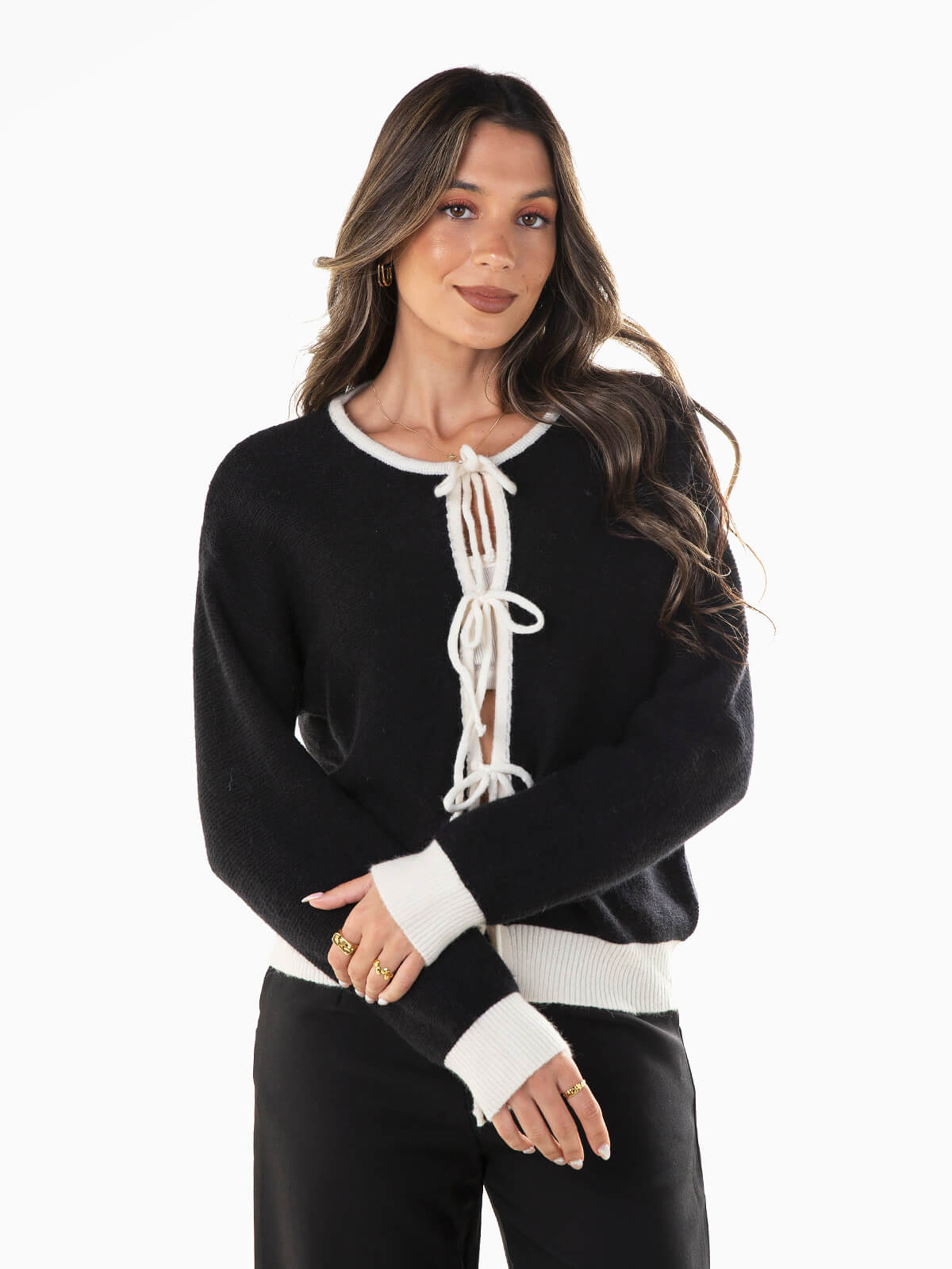 Cardigan bicolor com aperto de laços à frente. Casaco malha manga comprida com decote redondo e acabamentos canelados.