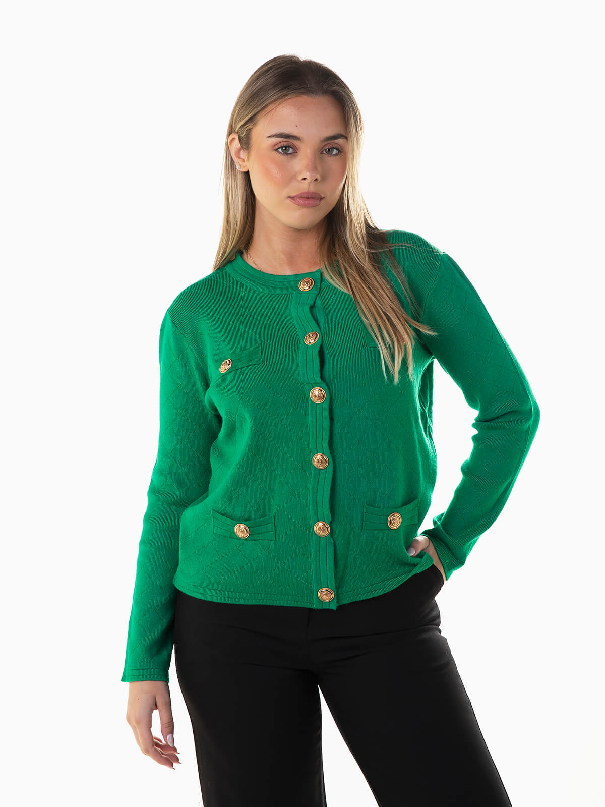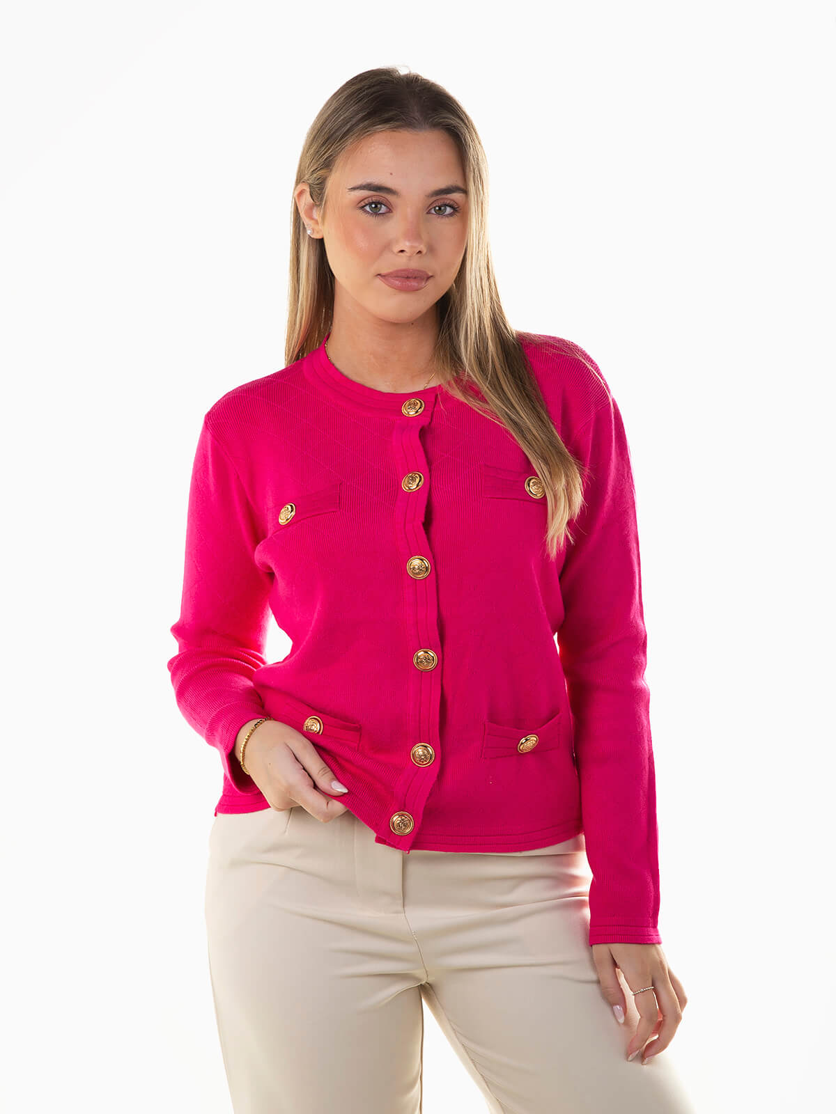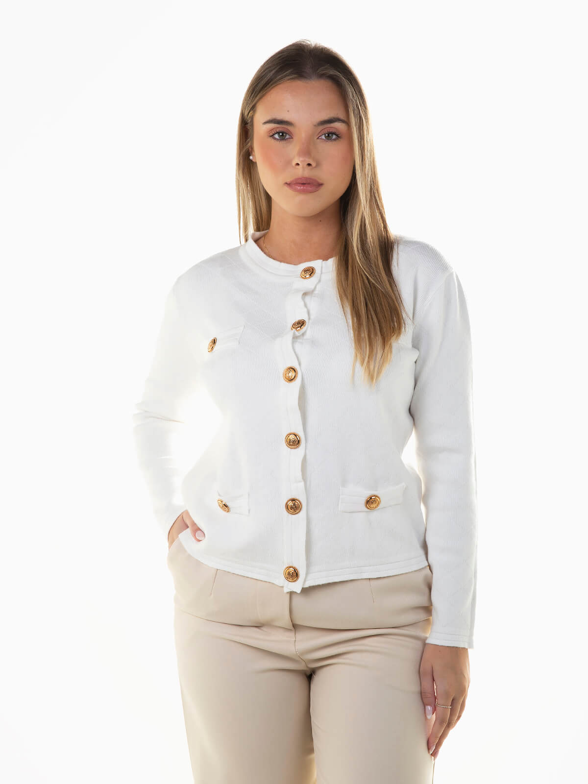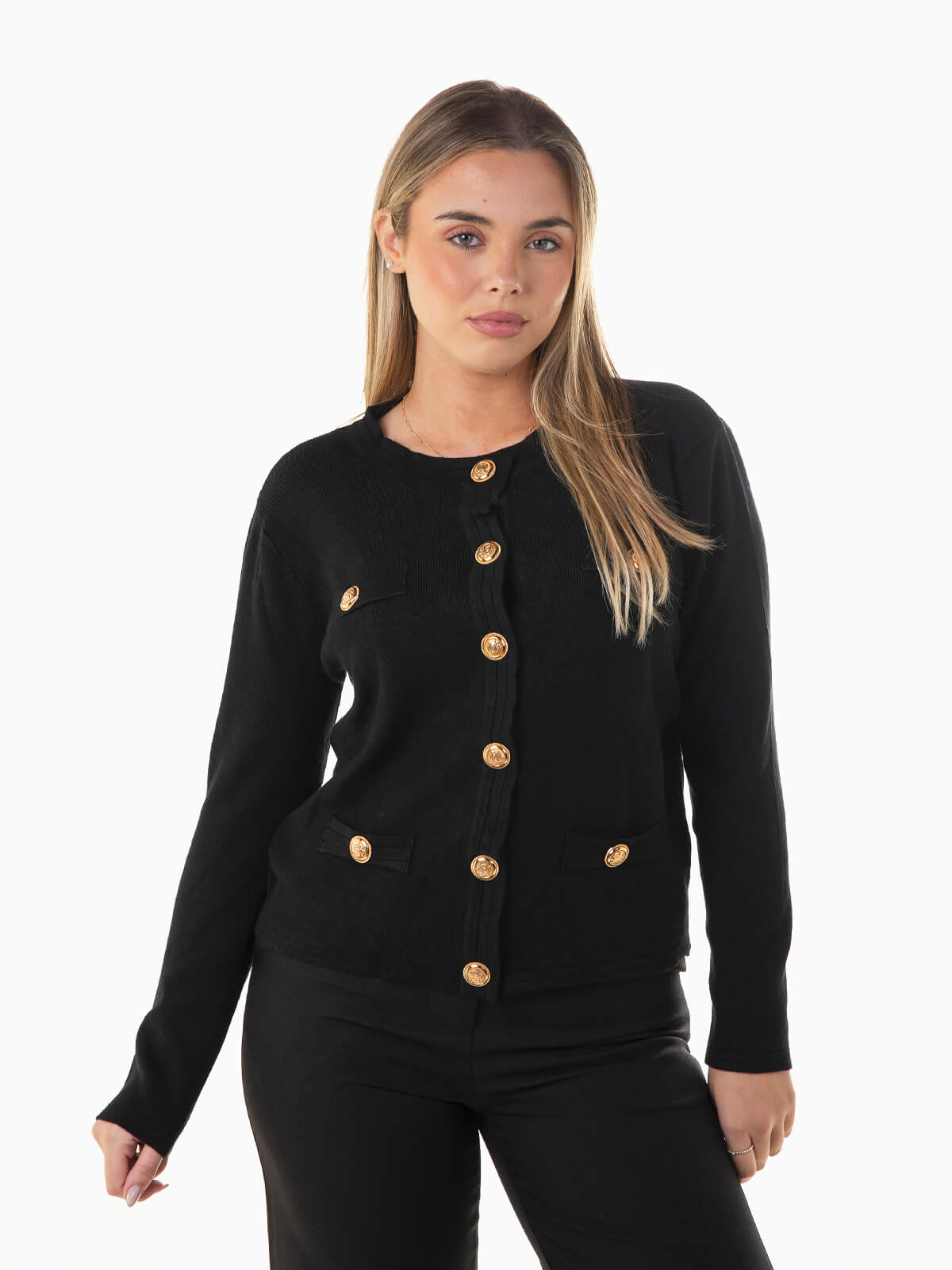 Cardigan com aperto de botões dourados. Casaco de malha manga comprida com decote redondo. Confecionada em tecido com mistura de viscose, confortável e agradável ao toque.