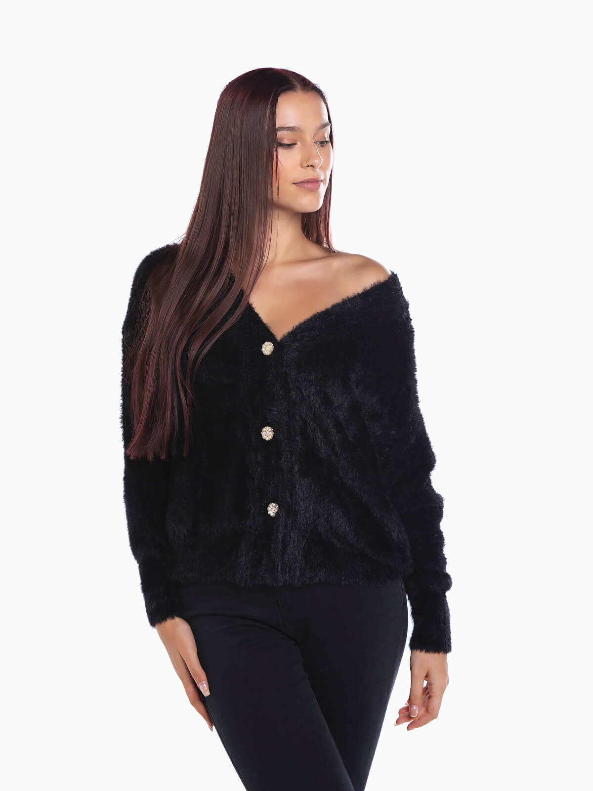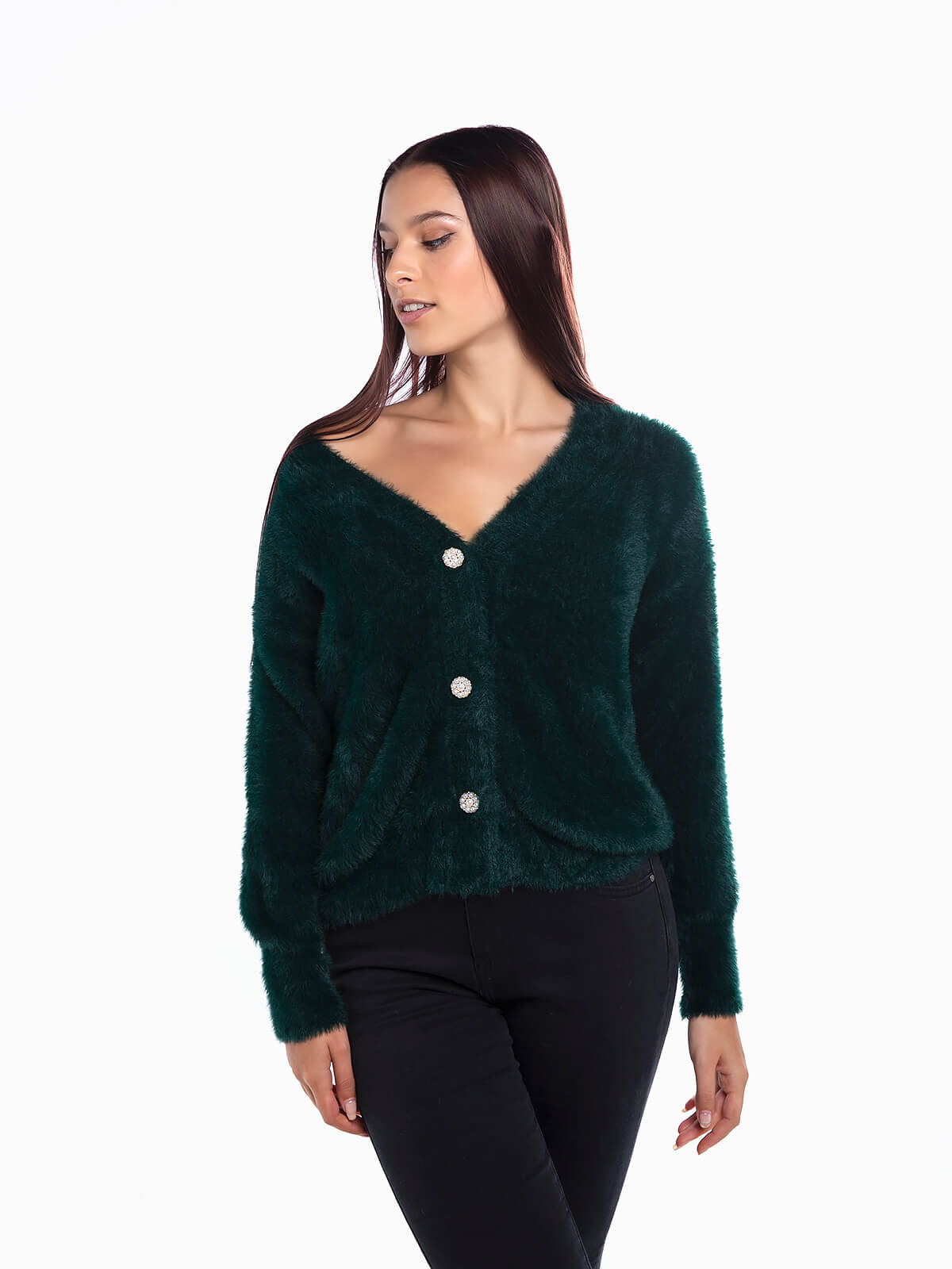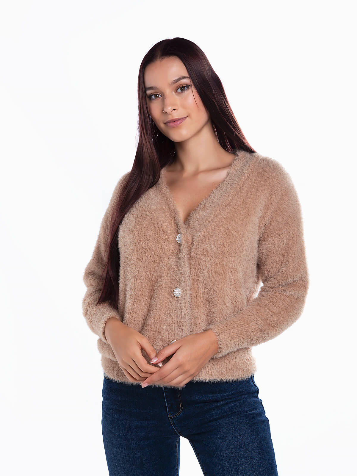 Cardigan com efeito de pelo sintético para senhora. Casaco de malha ultra suave com decote em bico. Acabamentos em nervuras. Aperto de botões.