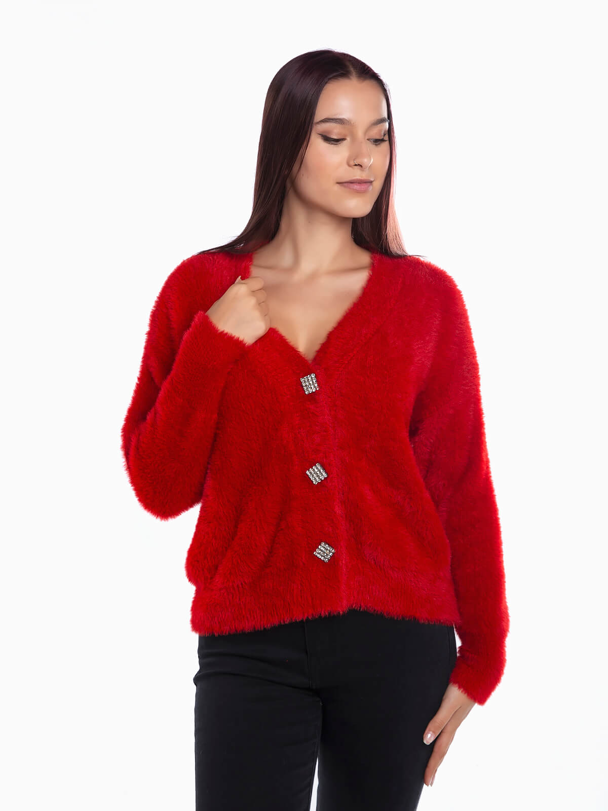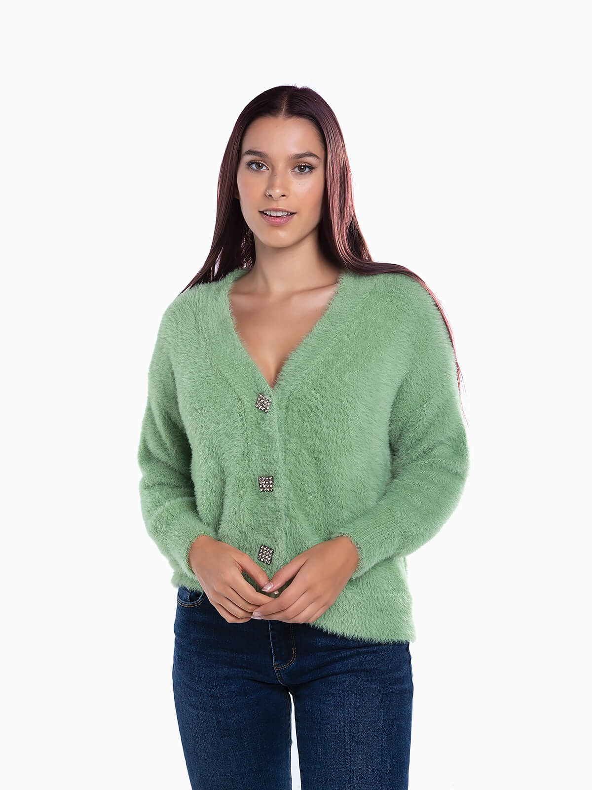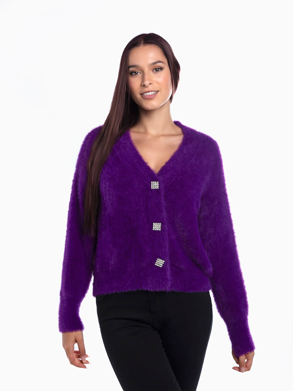 Cardigan com efeito de pelo sintético para senhora. Casaco de malha ultra suave com decote em bico. Acabamentos em nervuras. Aperto de botões.