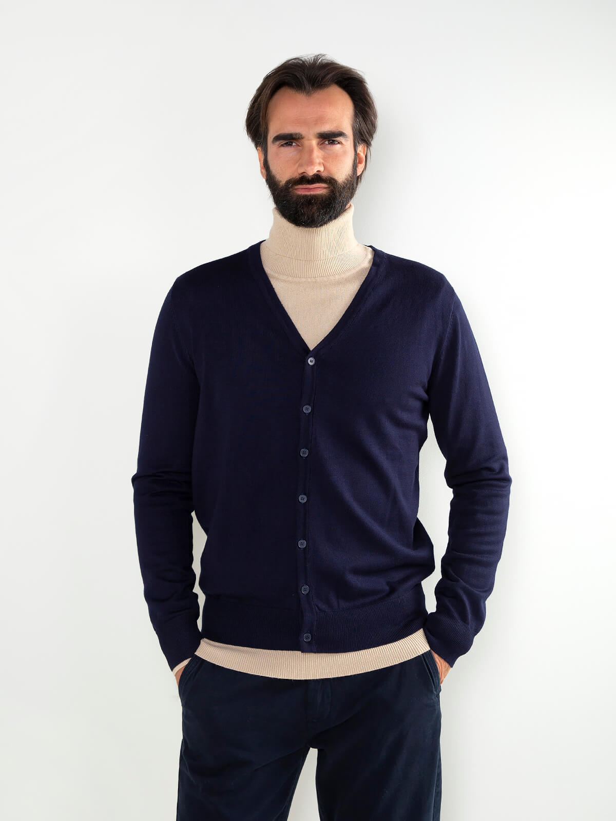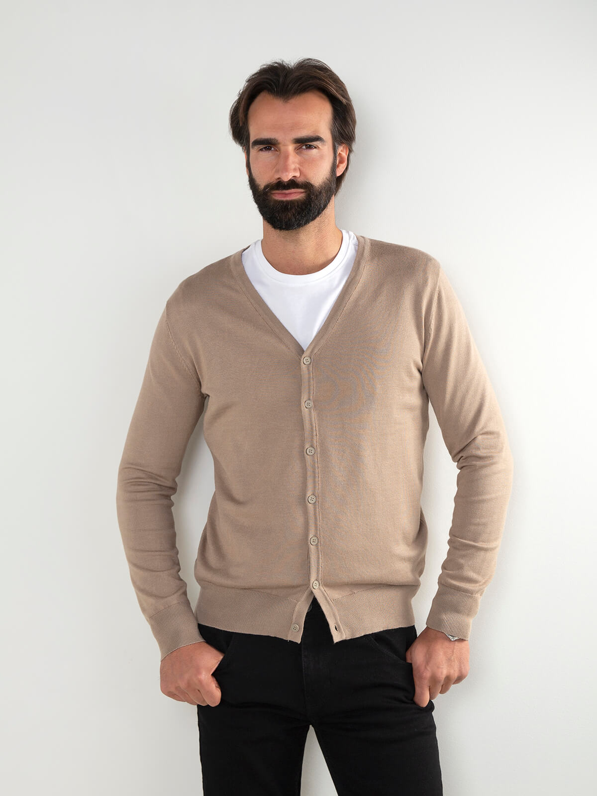 Casaco de malha para homem com gola em V e aperto de botões. Modelo leve, confortável e versátil, ideal para looks clássicos ou mais atuais. Disponível em várias cores.