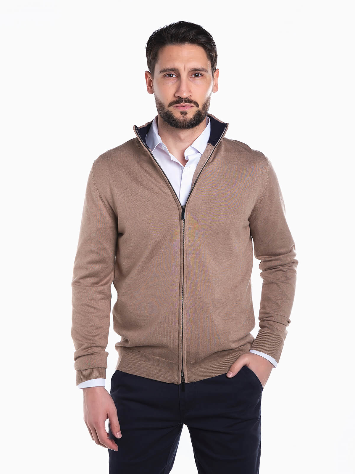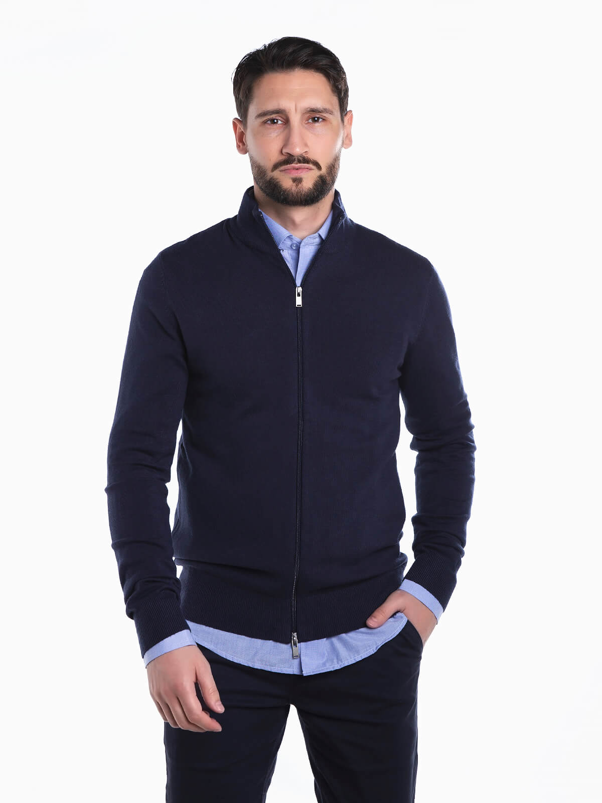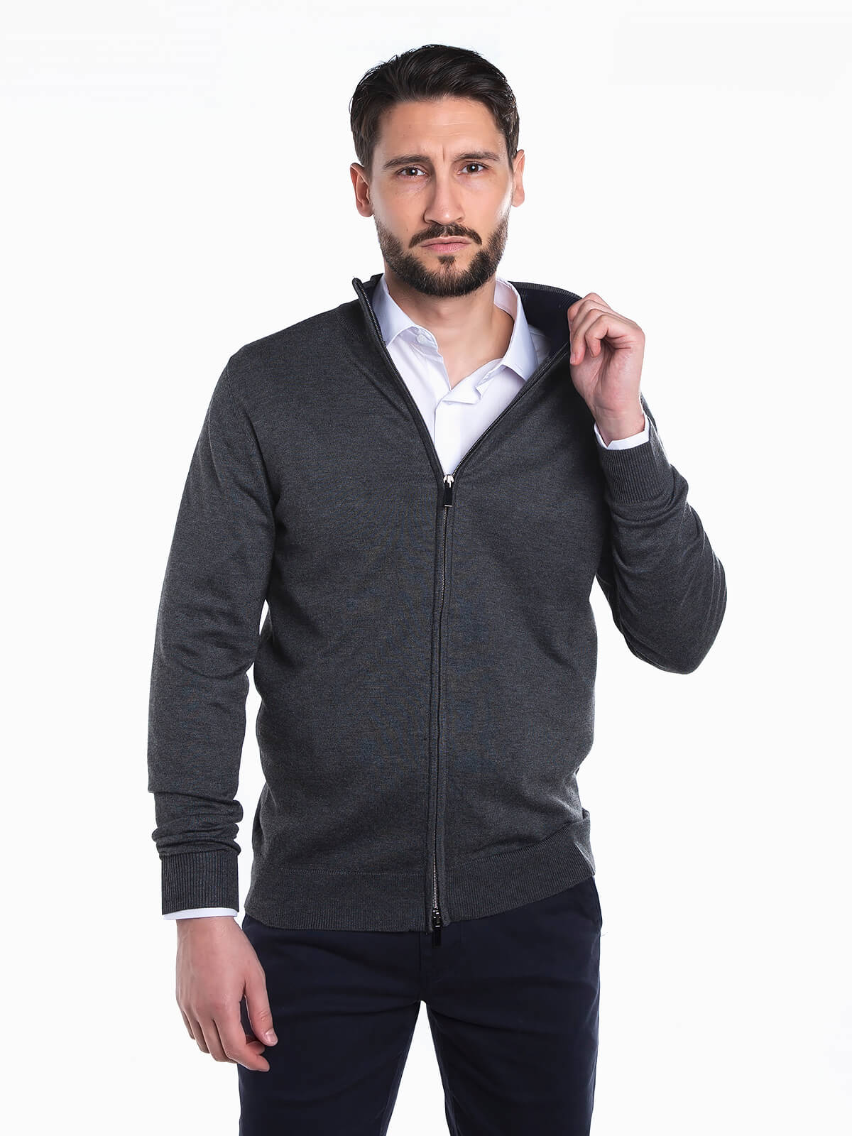 Cardigan com gola subida para homem. Casaco malha justo manga comprida com acabamentos canelados. Aperto fecho zíper.