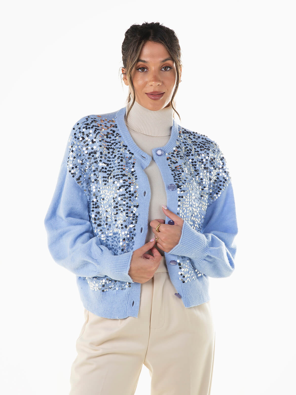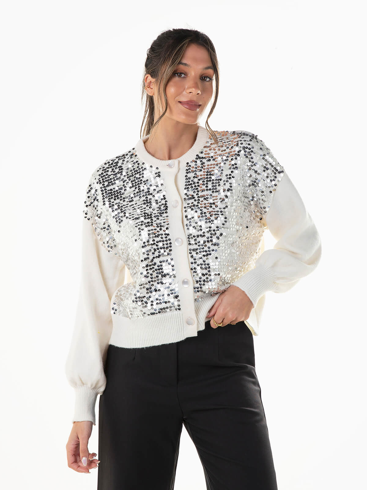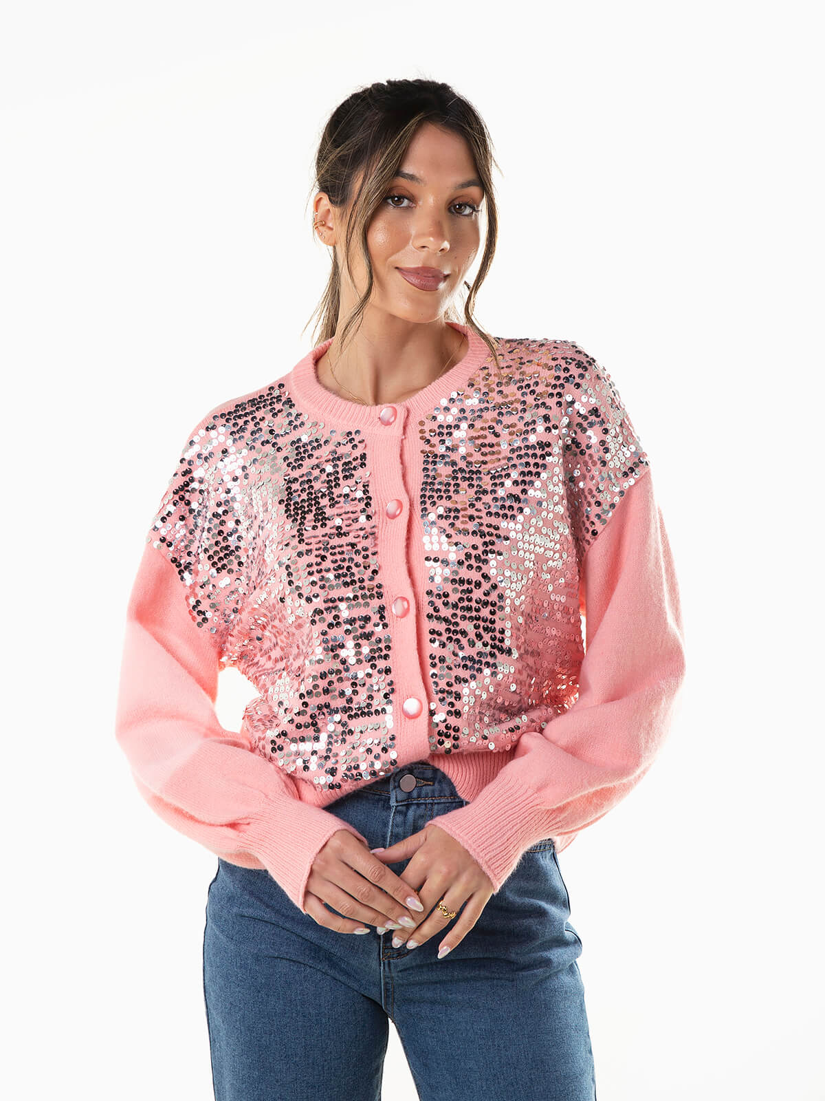 Cardigan com lantejoulas aplicadas para efeito brilhante. Casaco de malha oversize de manga comprida com decote redondo e acabamentos canelados. Aperto de botões.