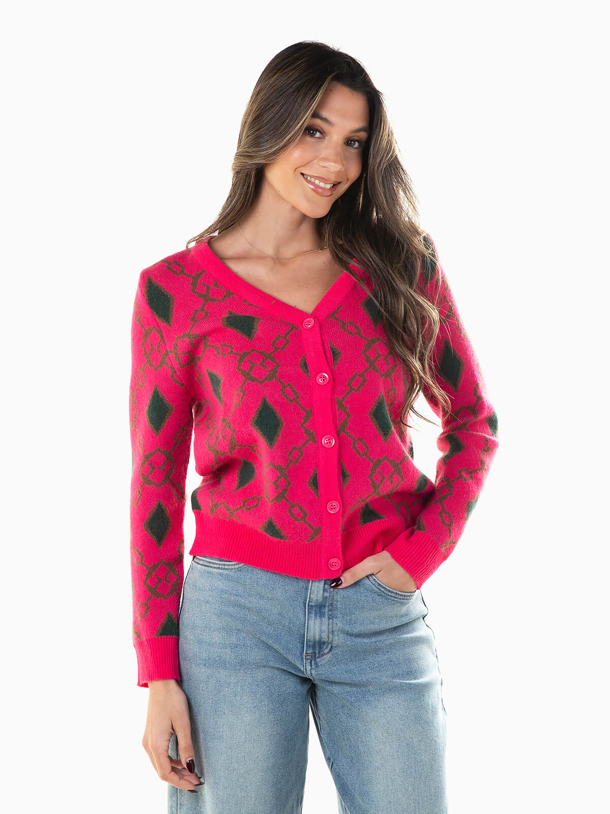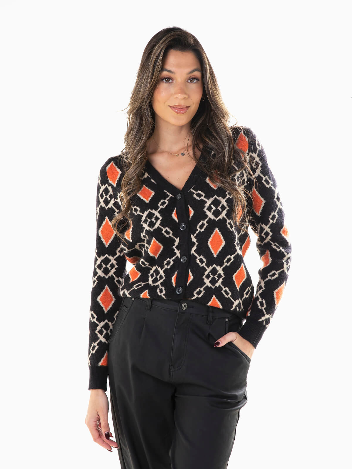 Cardigan com losangos para senhora. Casaco de malha manga comprida com decote em V e acabamentos canelados. Aperto frontal de botões.