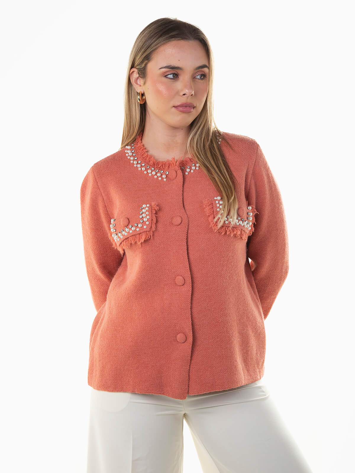 Cardigan com pérolas aplicadas no decote e palas. Casaco de malha de manga comprida com decote redondo e bolsos decorativos. Acabamentos com franjas. Aperto frontal de botões forrados.