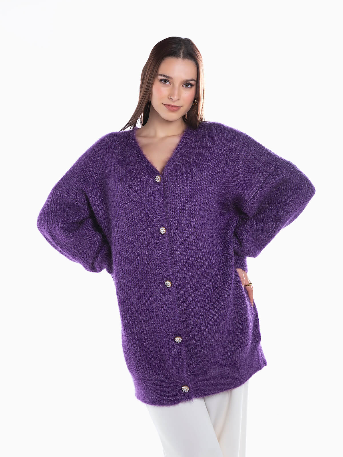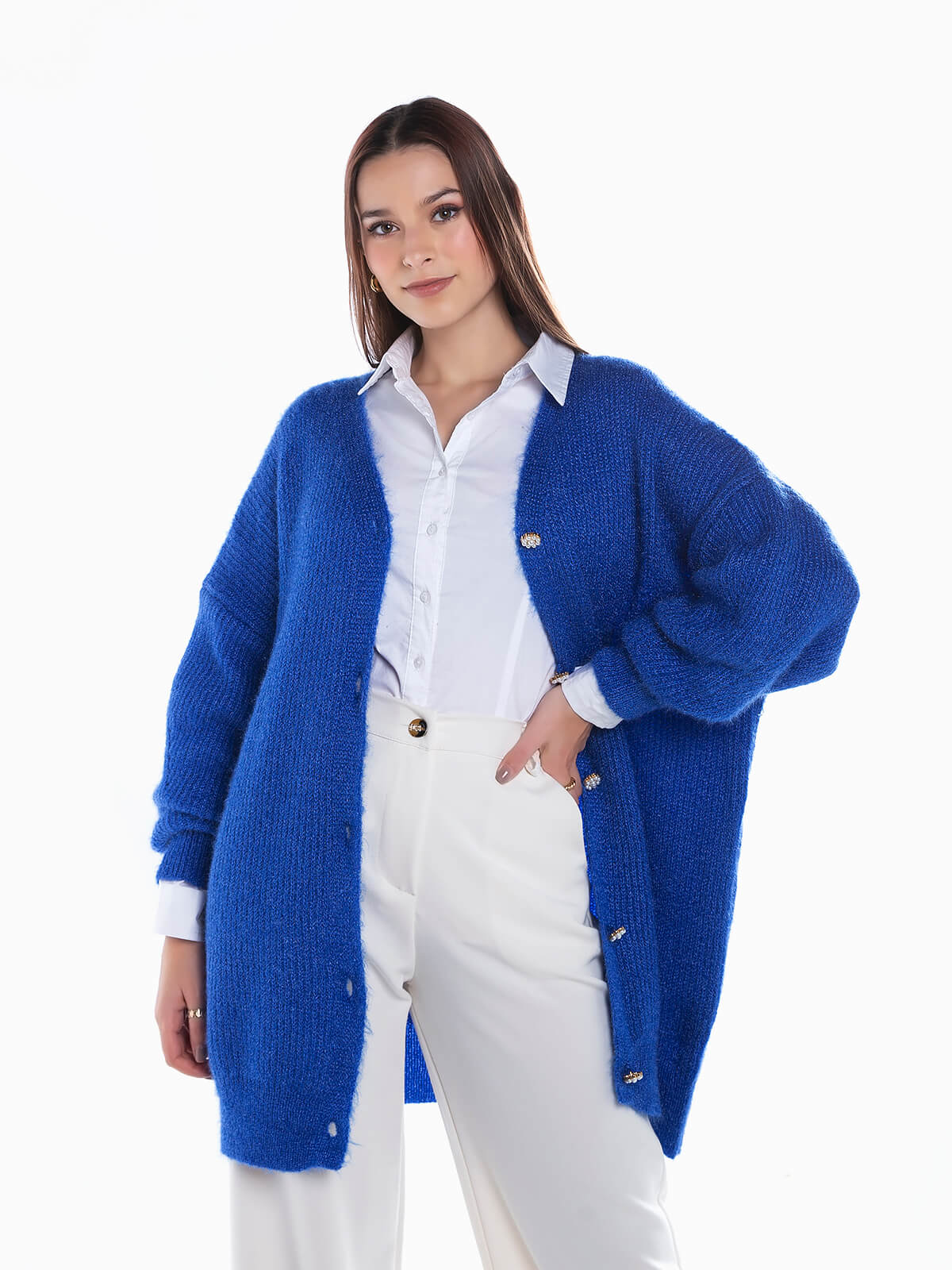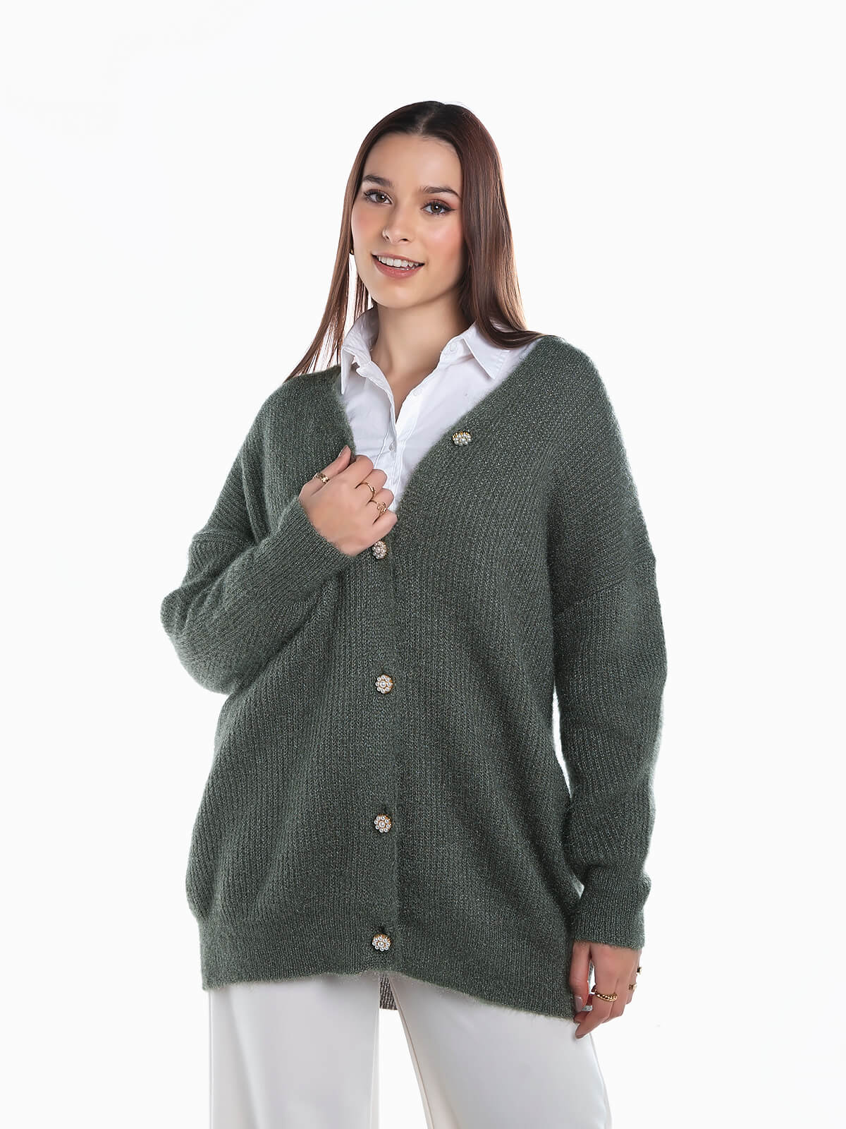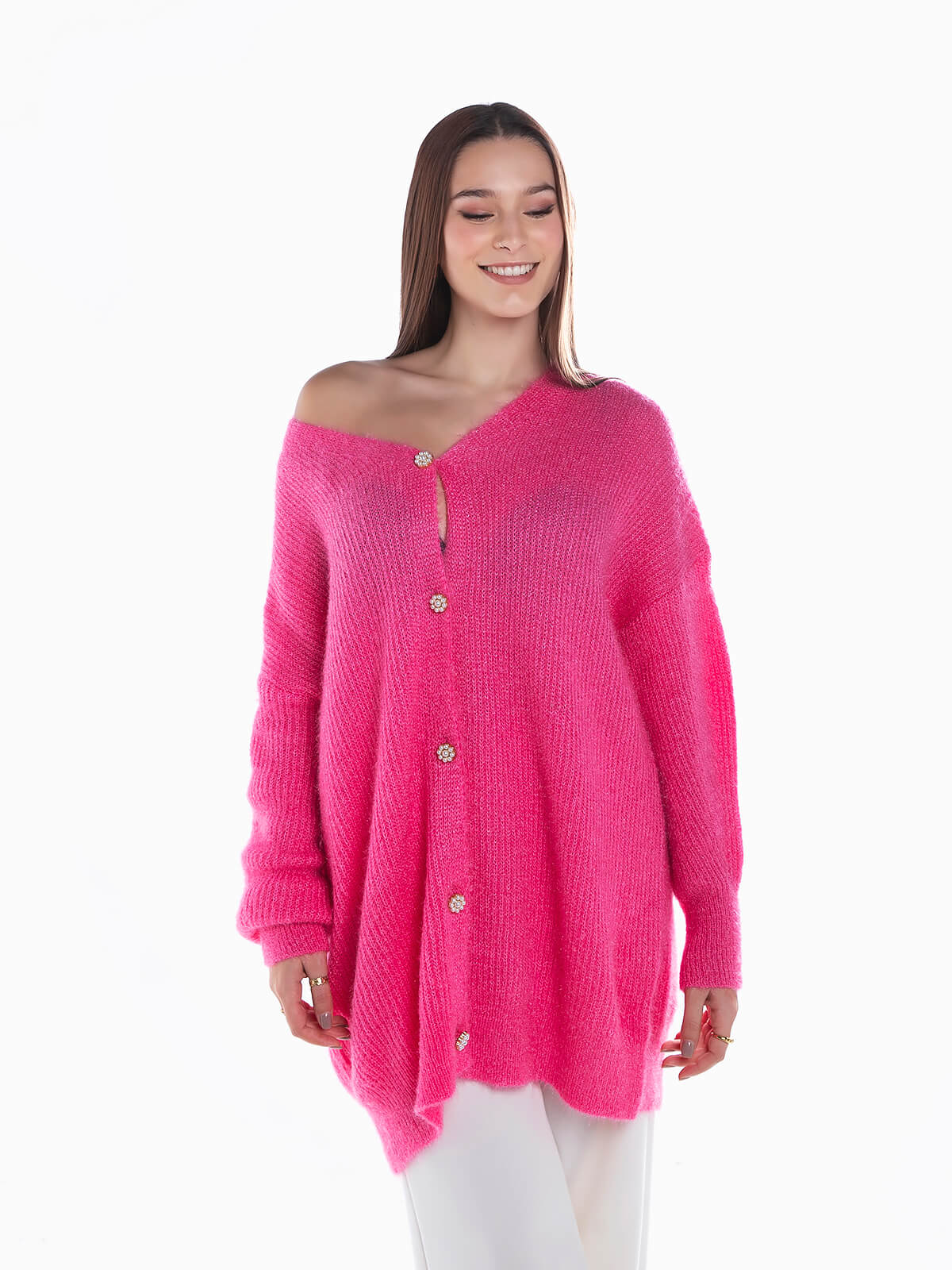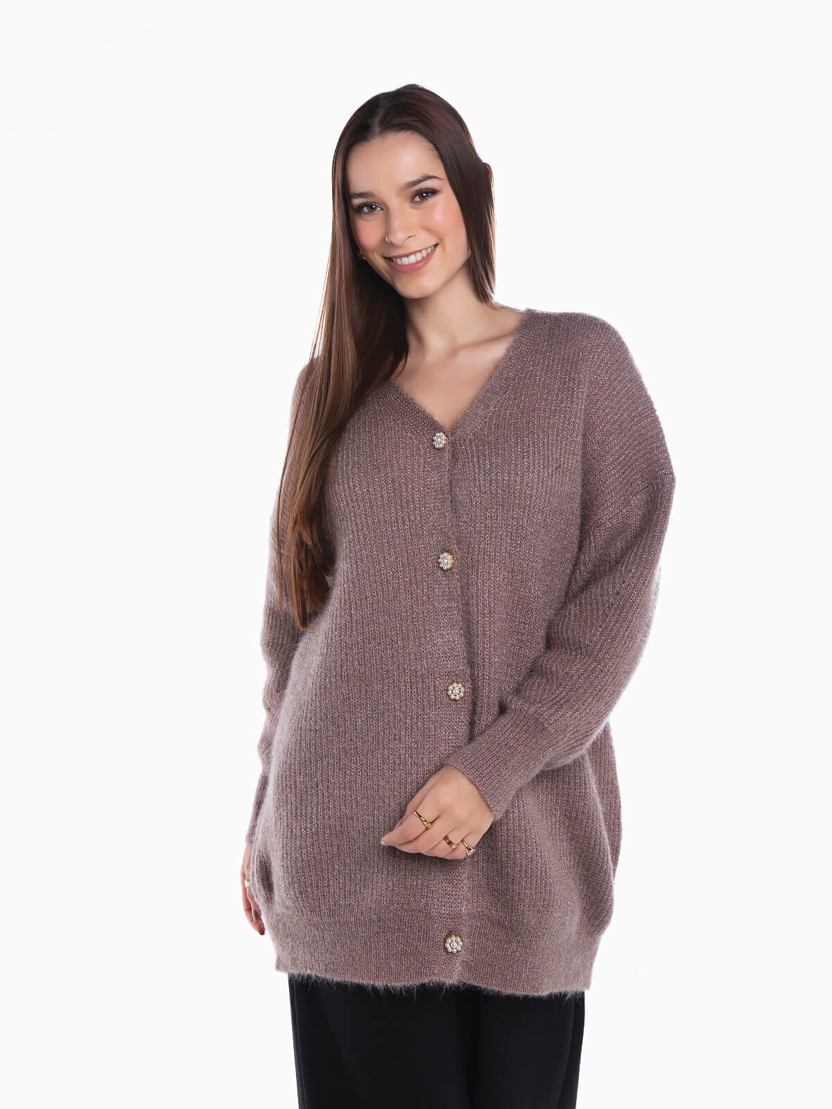 Cardigan comprido em malha com fios lurex para efeito brilhante. Casaco de malha de tato suave com decote em bico. Aperto frontal de botões de pérolas em forma de flor.