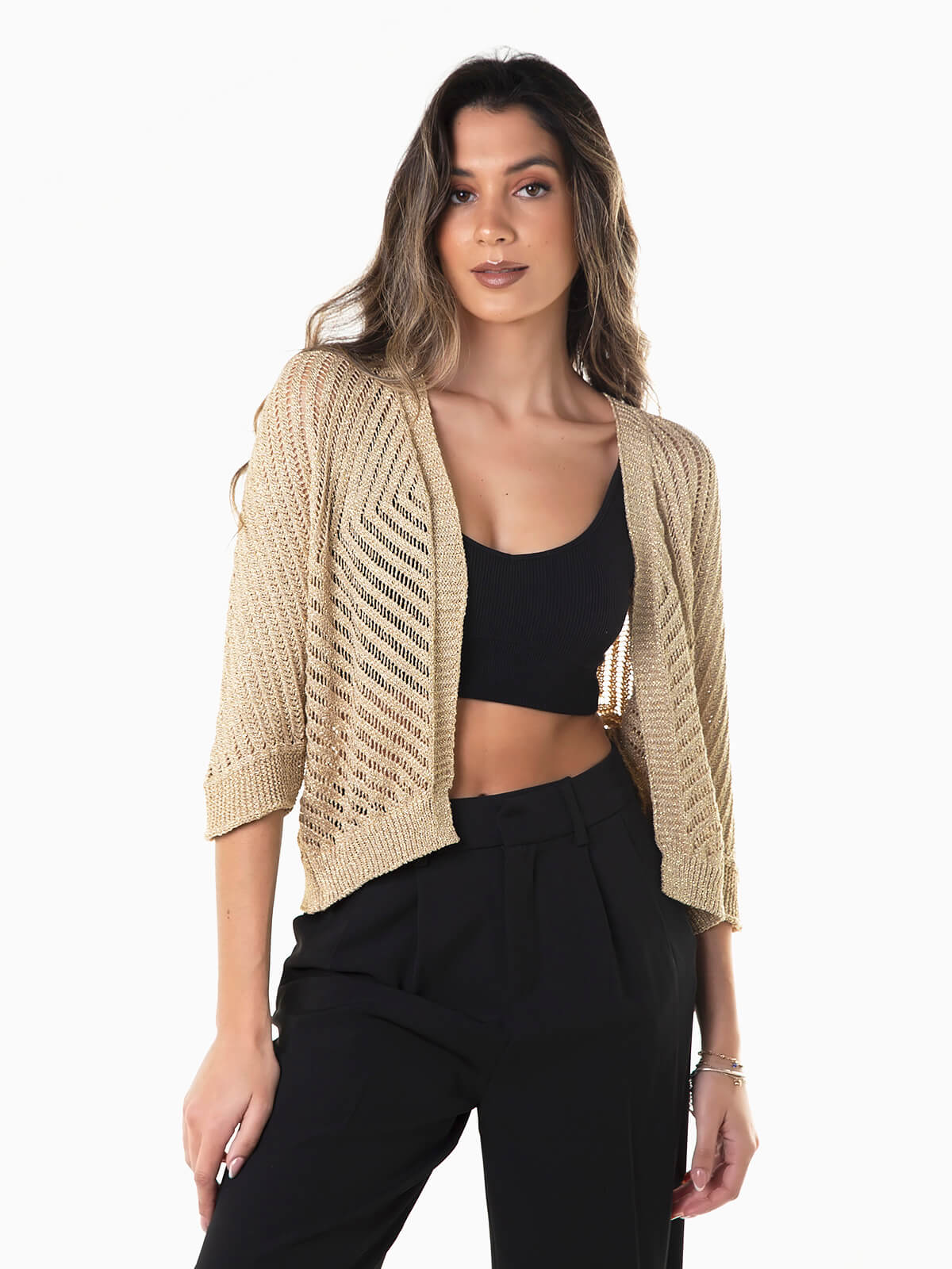 Cardigan dourado em malha rendilhada e fios lurex para efeito brilhante. Casaco aberto de manga 3/4 com acabamentos canelados.