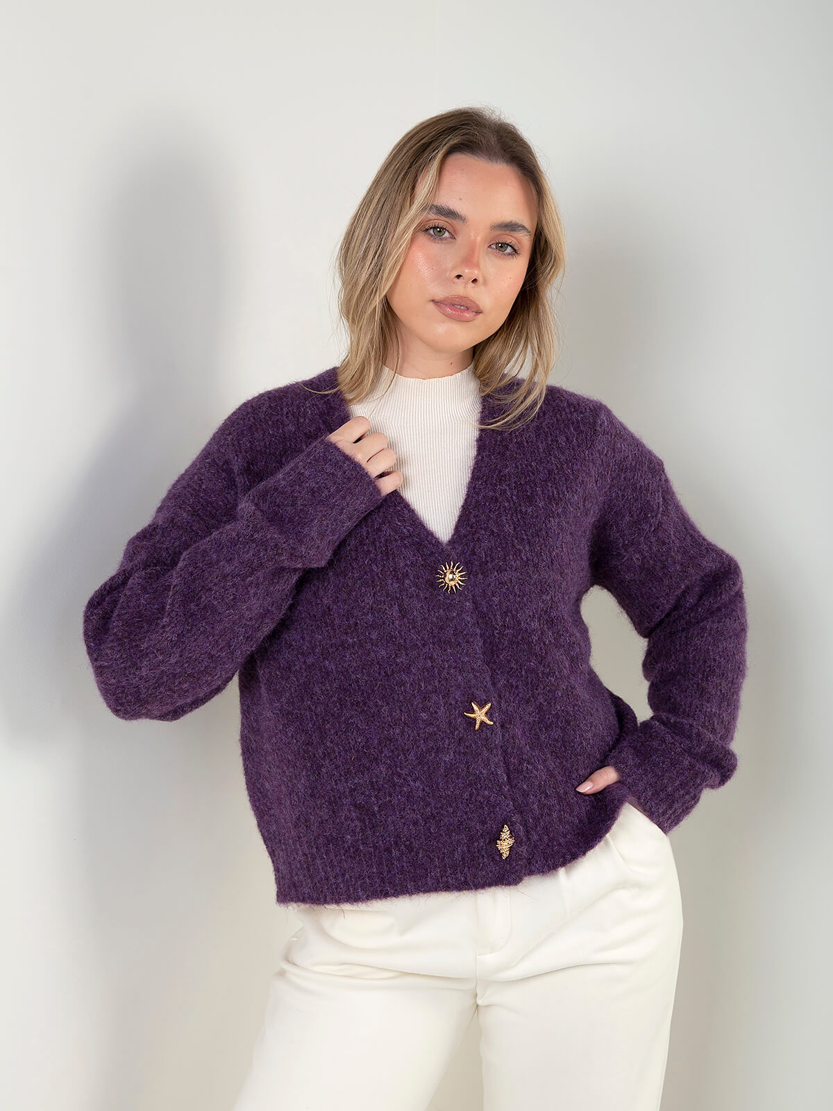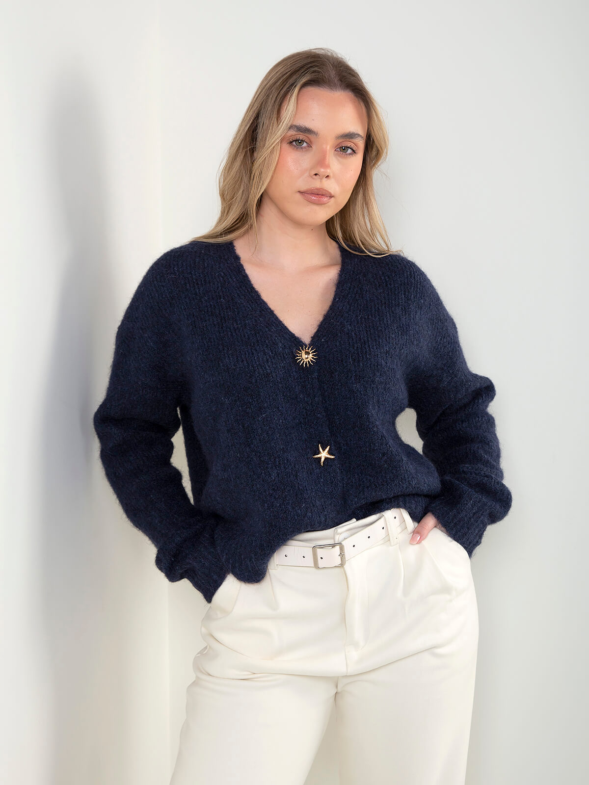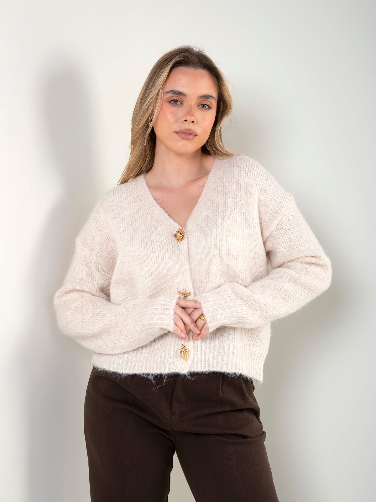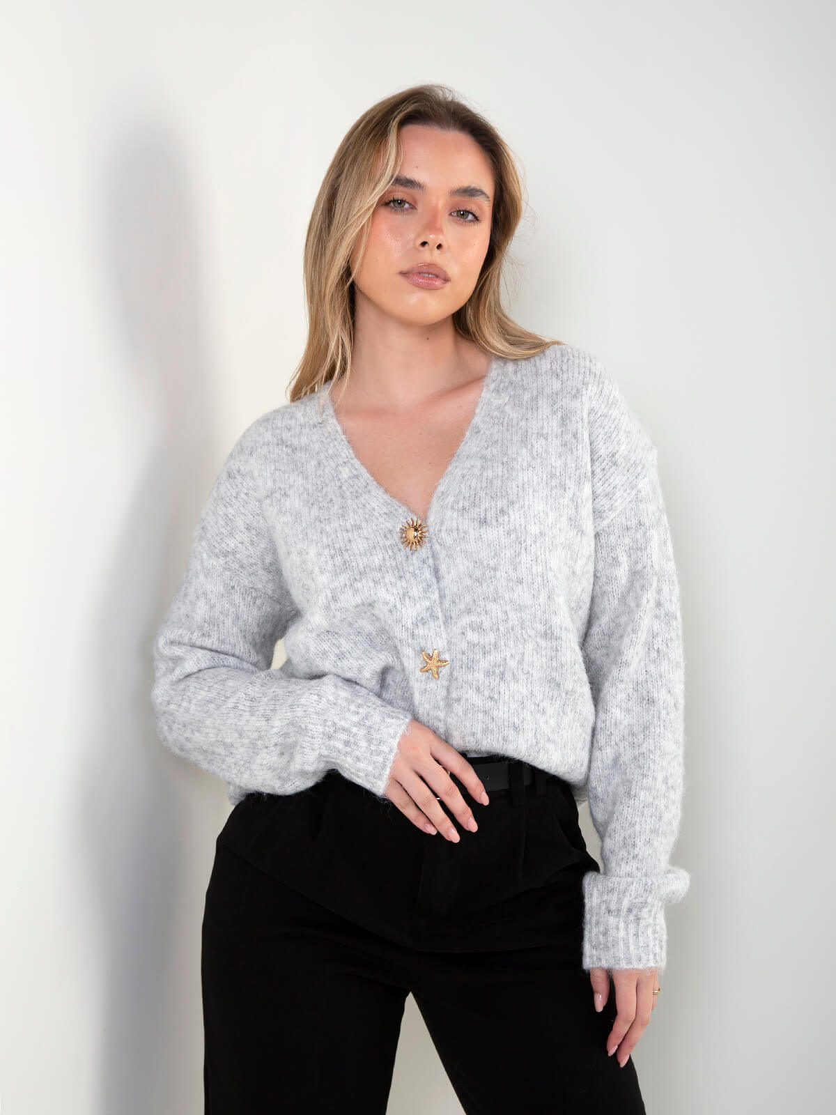Cardigan de malha com decote em V e aplicações metálicas decorativas à frente. Toque suave, mangas compridas e acabamento canelado nos punhos e na base. Fácil de combinar com ganga ou calças de alfaiataria.