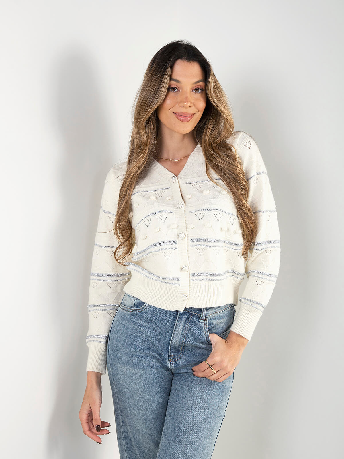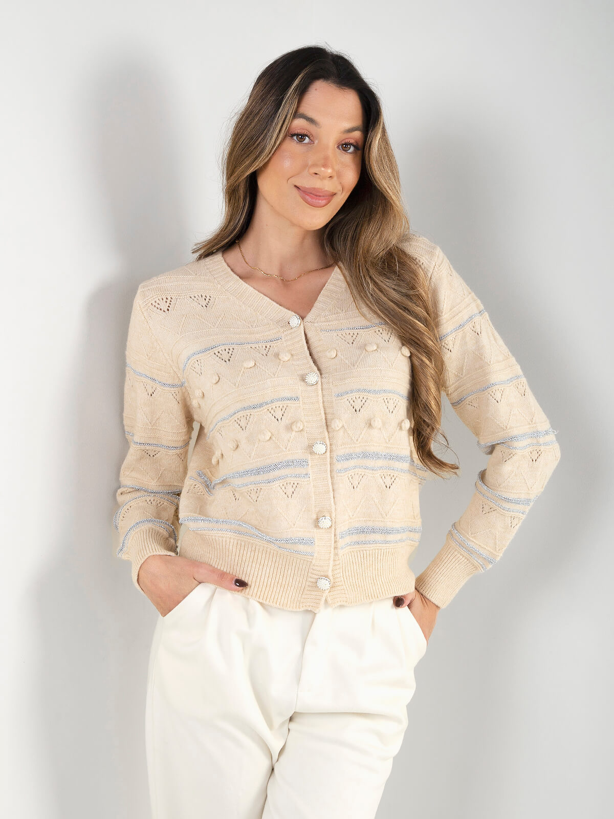 Casaco de malha com padrão texturizado, detalhes em relevo e fios subtis com brilho. Modelo de manga comprida, com decote em V e fecho frontal por botões decorativos. Ideal para looks de meia-estação e inverno.