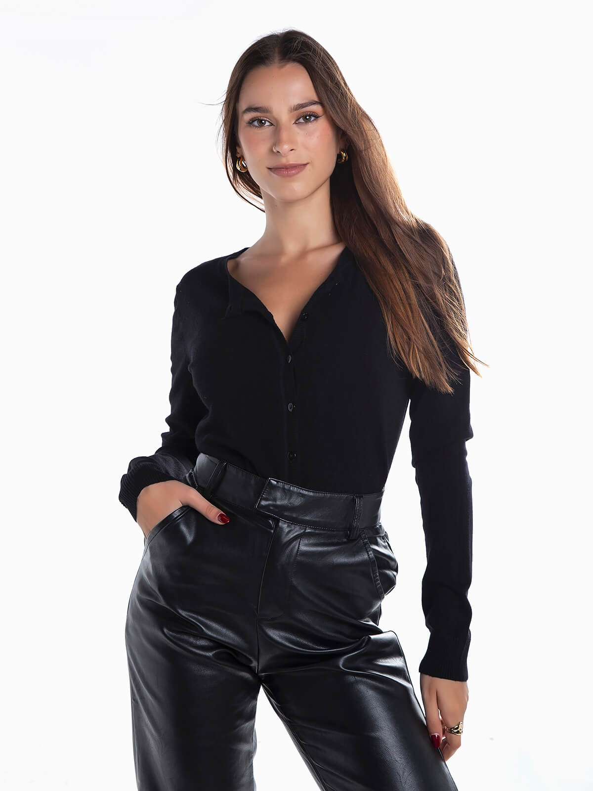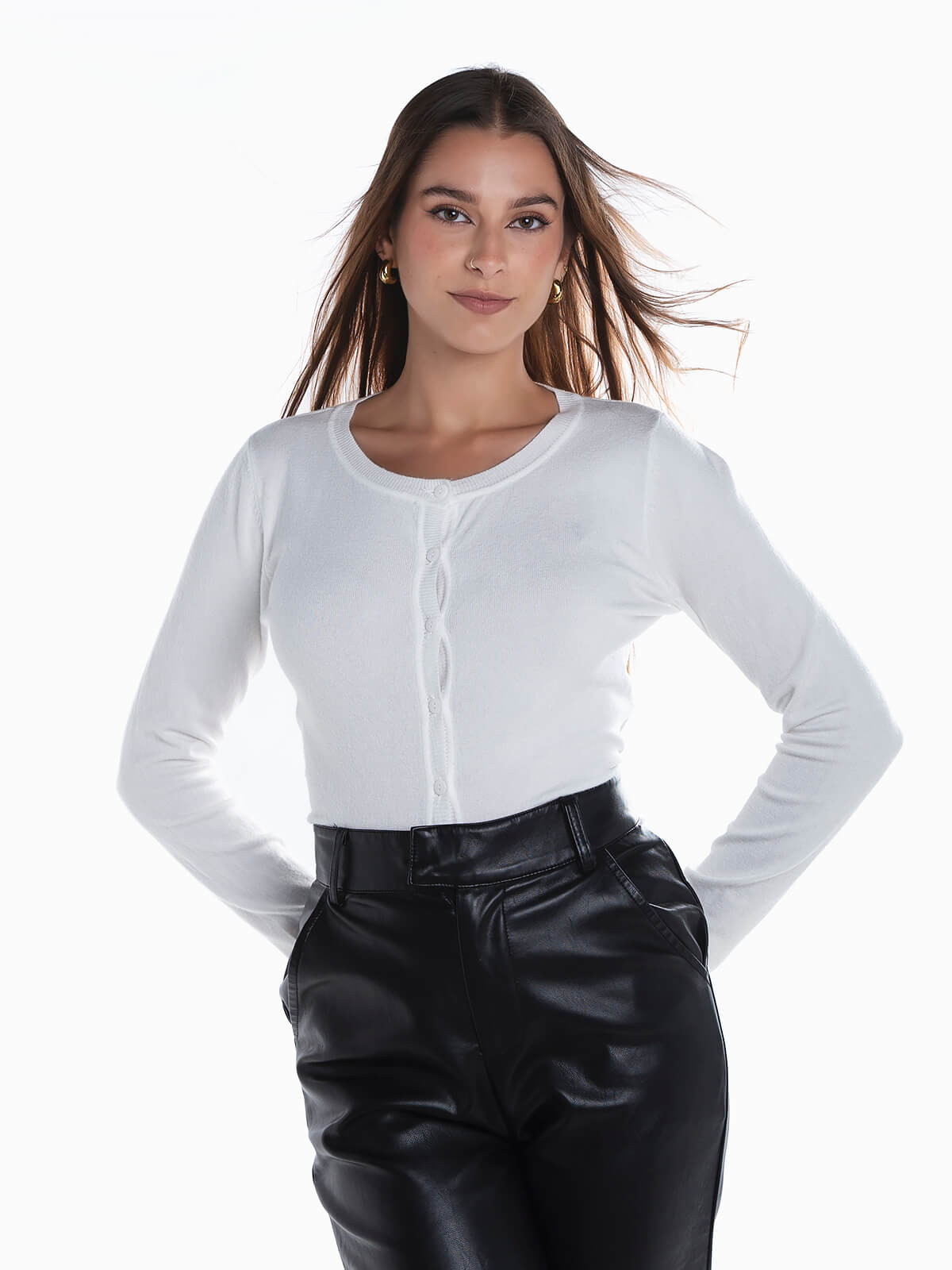 Cardigan liso em malha de toque suave. Casaco malha manga comprida com decote redondo. Acabamentos canelados. Aperto frontal de botões à cor.