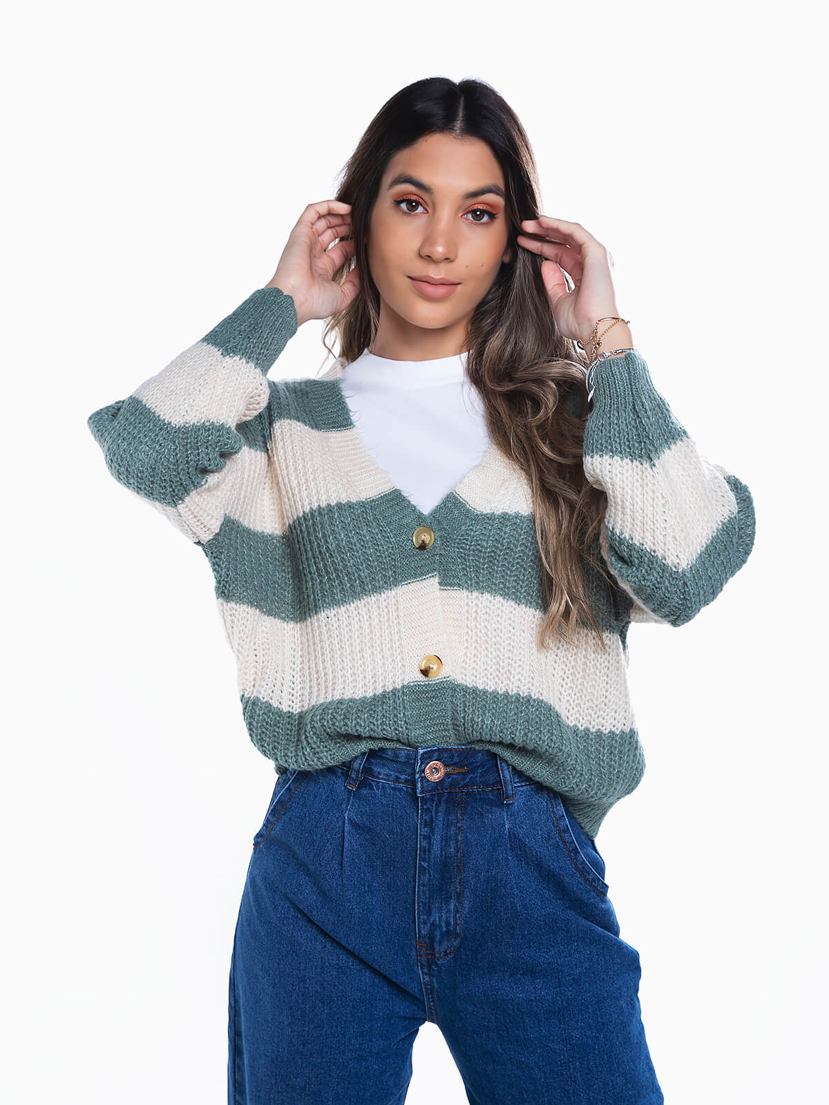 Cardigan de malha bicolor para senhora. Casaco de manga comprida com decote em V. Ombros descaídos. Aperto de botões. Extremidades caneladas.