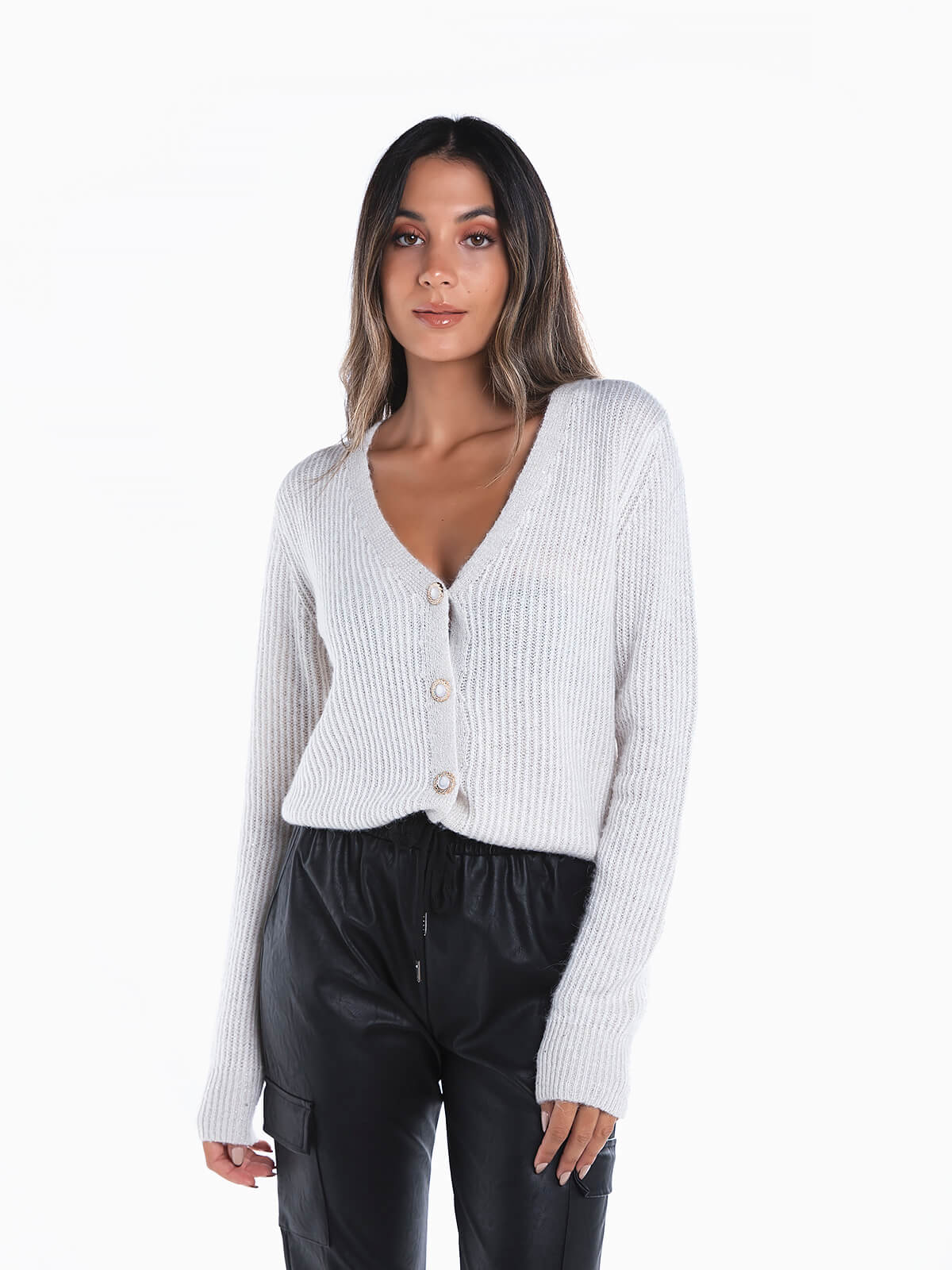 Cardigan em malha brilhante com decote em V para senhora. Casaco de malha manga comprida com pormenor de lantejoulas. Aperto frontal de botões.