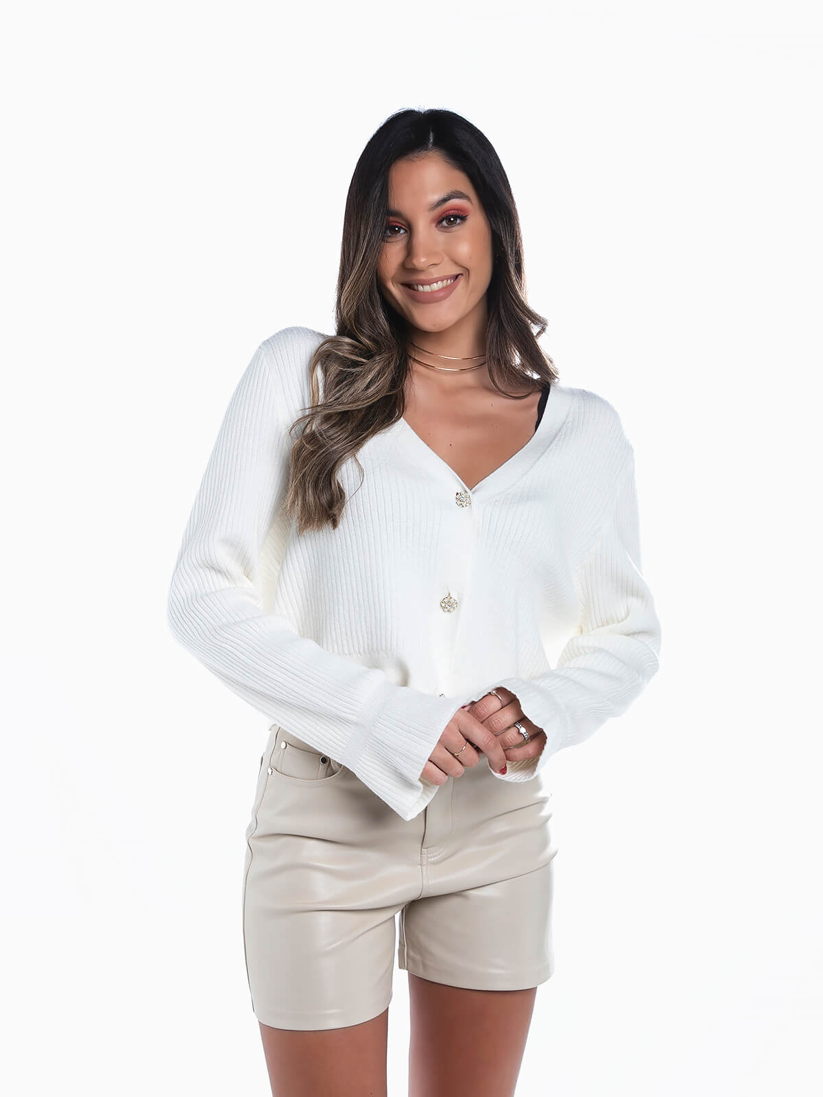 Cardigan de malha canelada com aperto de botões de pérolas. Casaco de malha de manga comprida com decote em bico. Punhos acabados em folho.