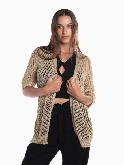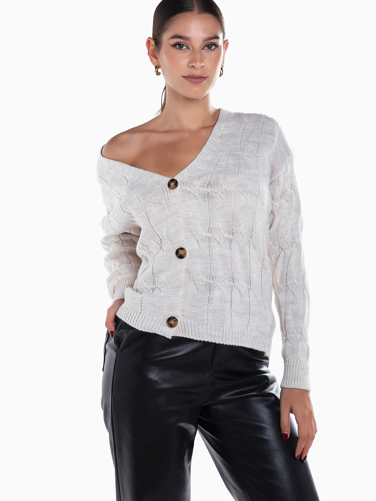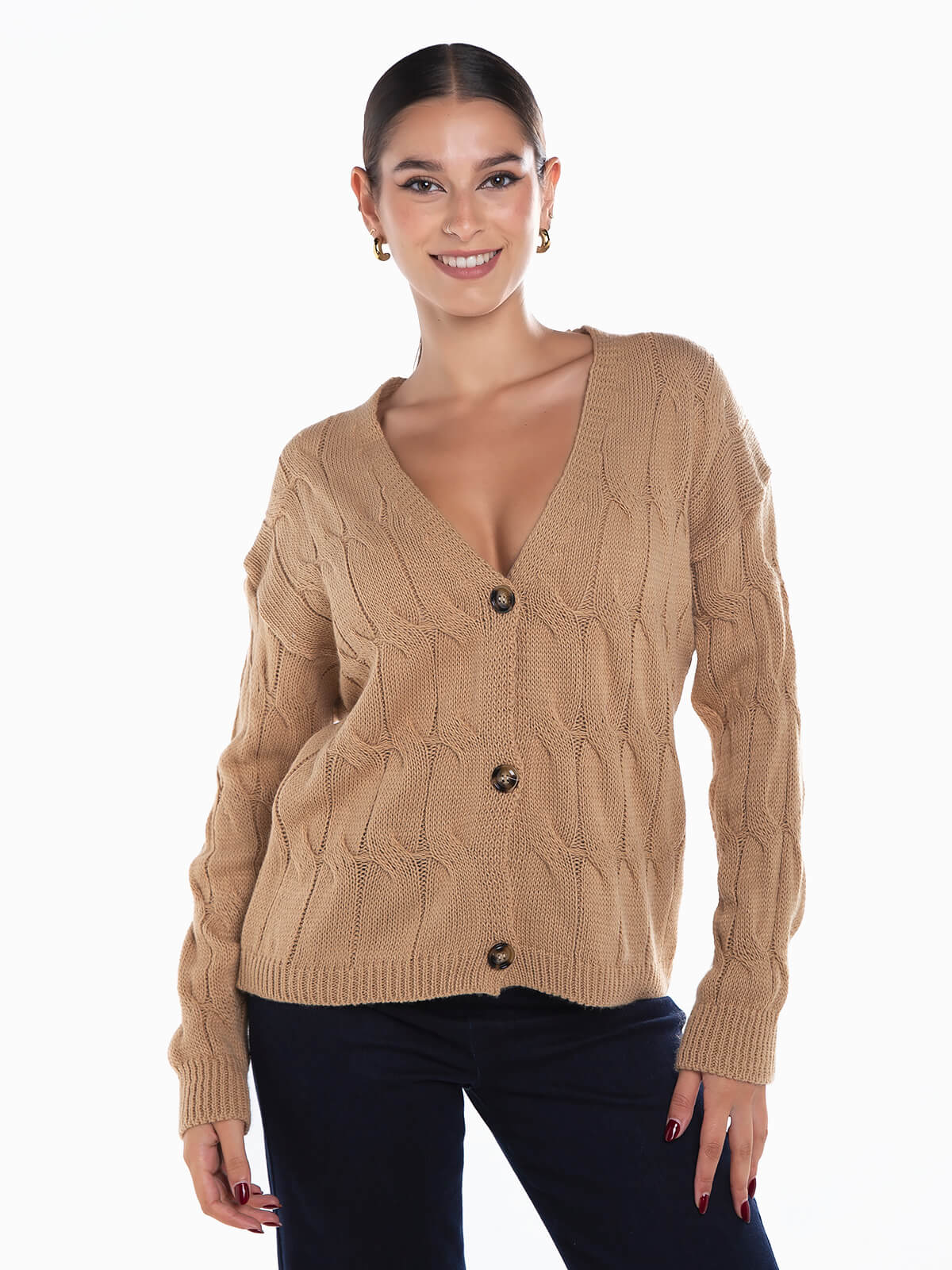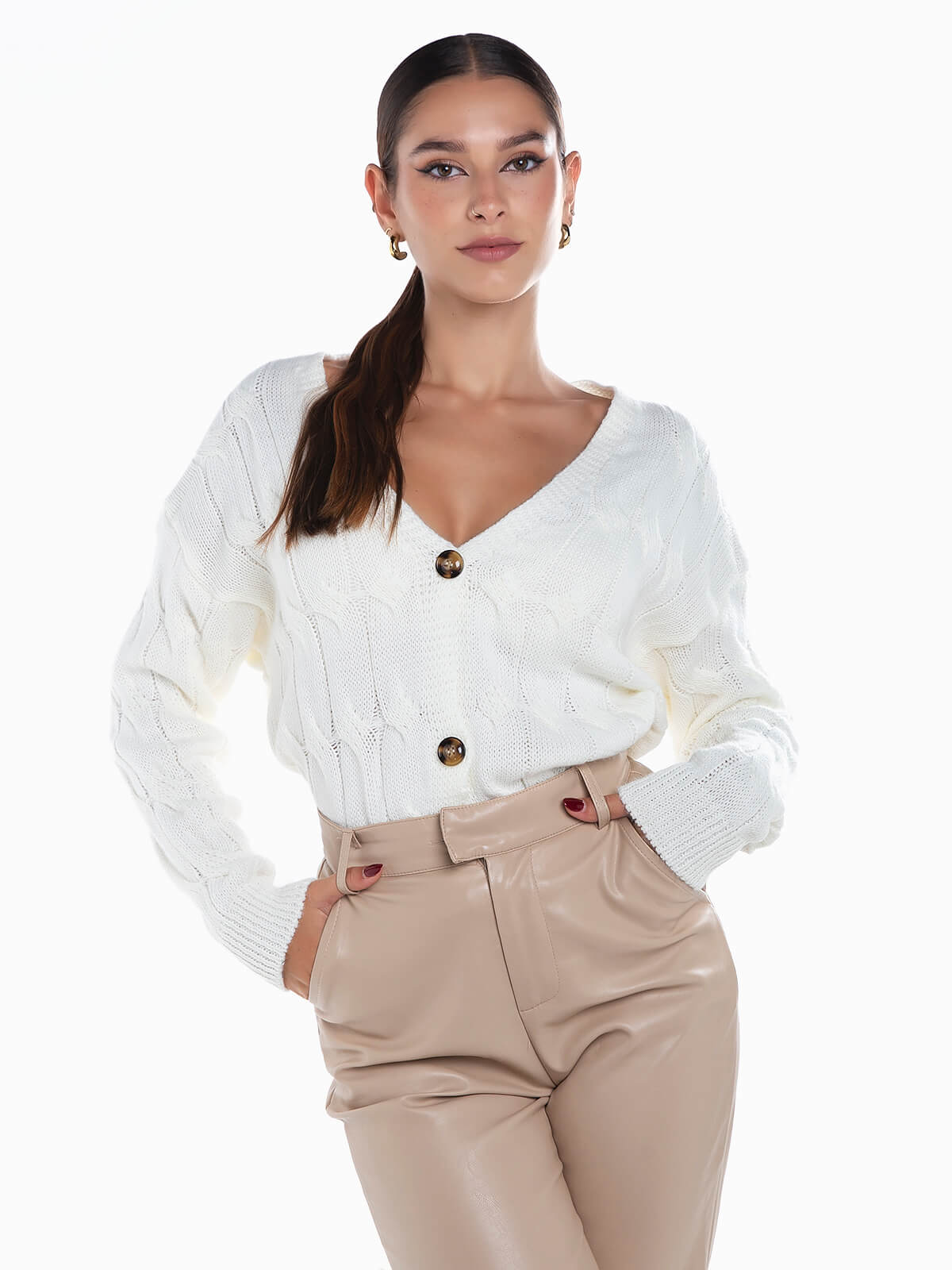 Cardigan em malha entrançada com decote em V. Casaco malha manga comprida com acabamentos canelados. Aperto frontal de botões.
