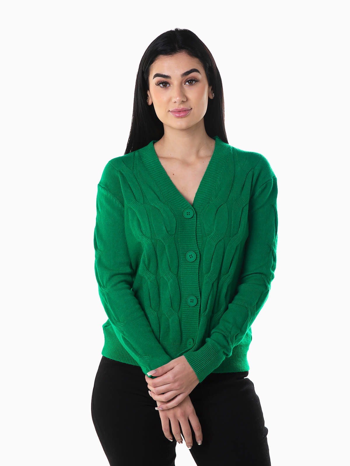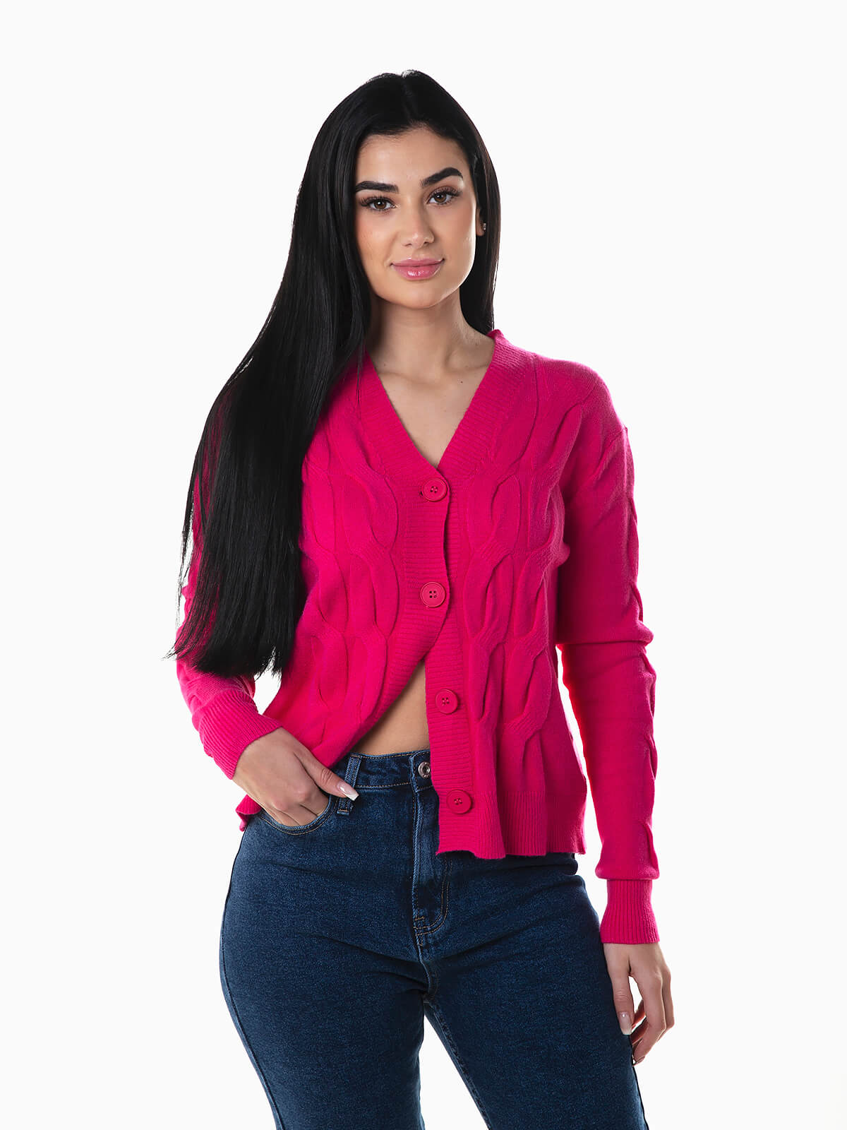 Cardigan malha entrançada mistura de viscose para maior conforto e respirabilidade. Casaco malha manga comprida com decote em bico. Acabamentos canelados. Aperto de botões.