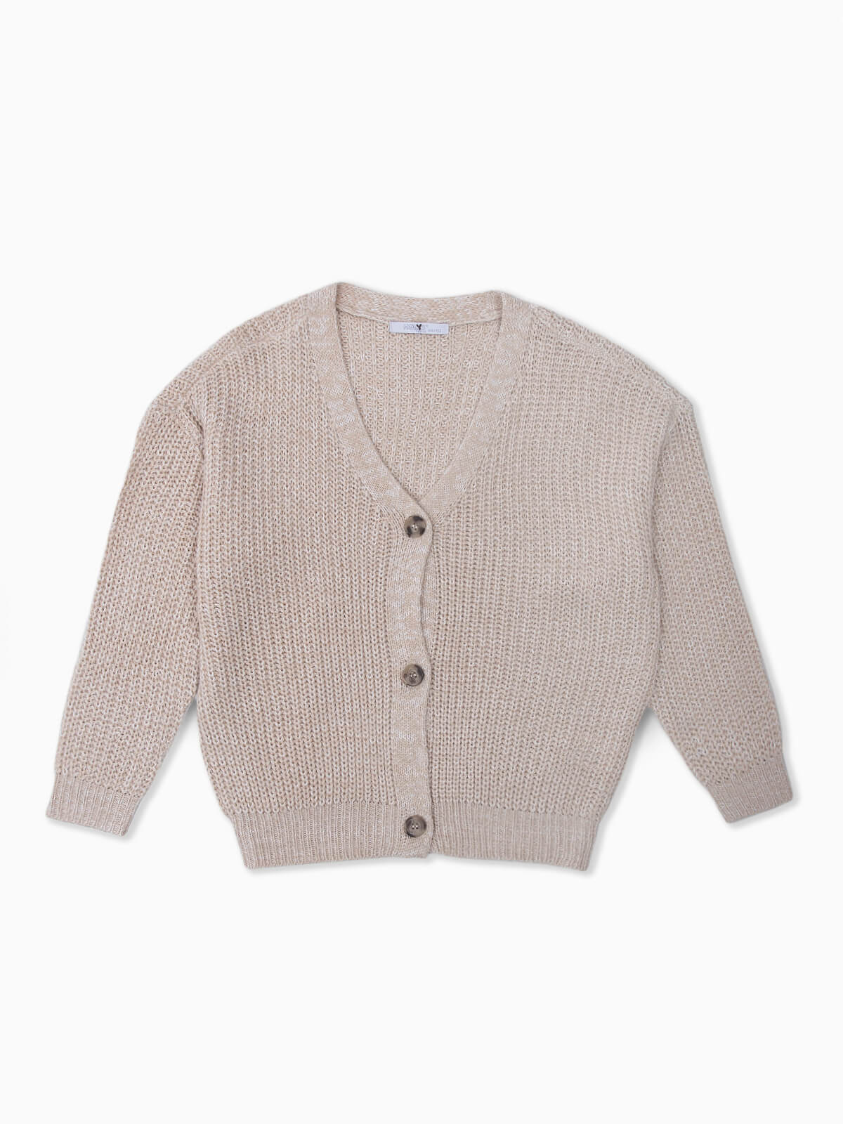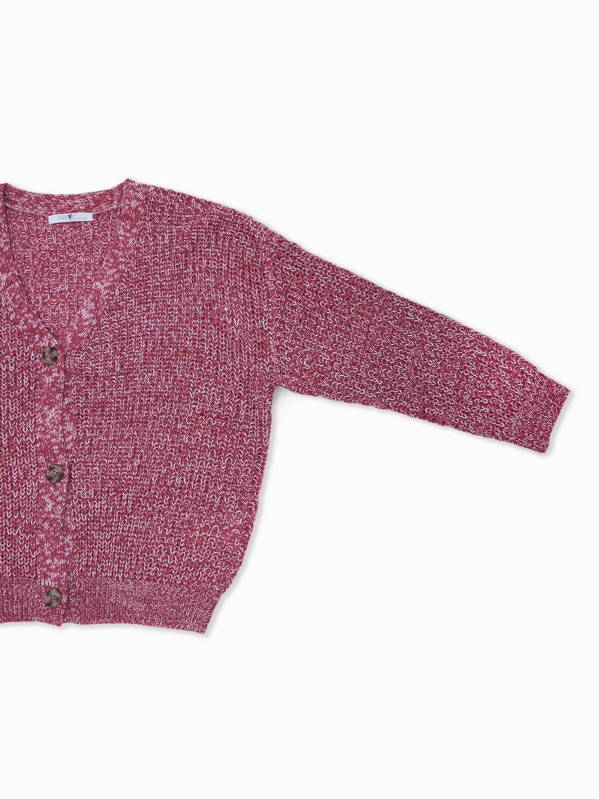 Cardigan de malha mesclada para menina. Casaco de malha manga comprida com decote em bico. Aperto de botões.