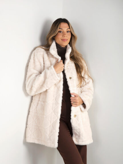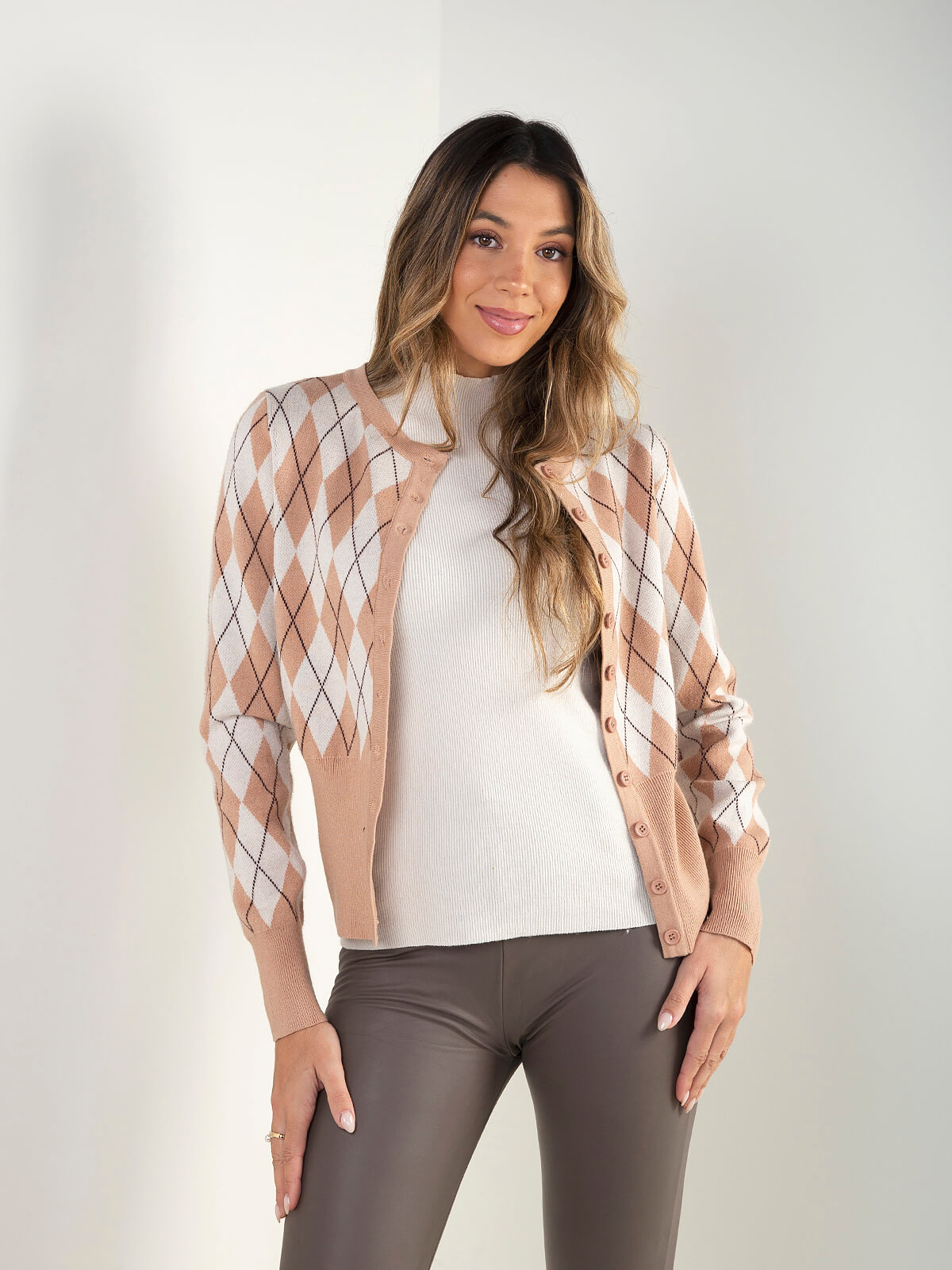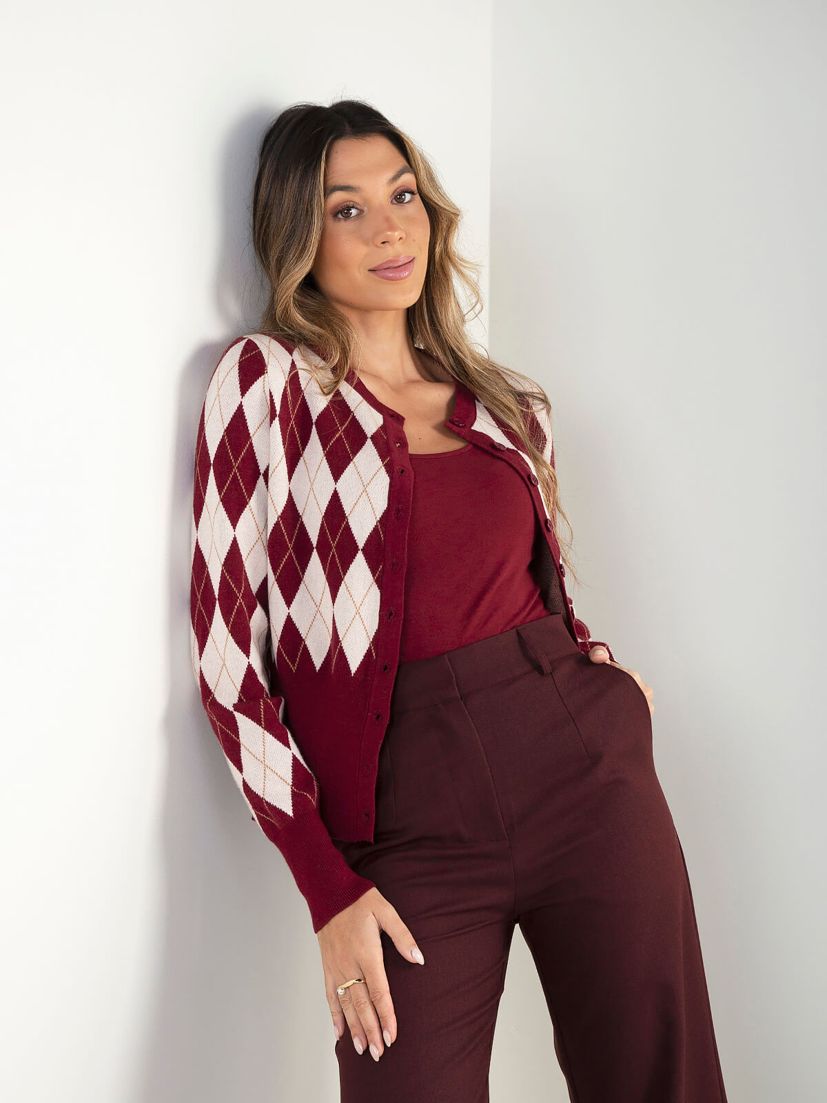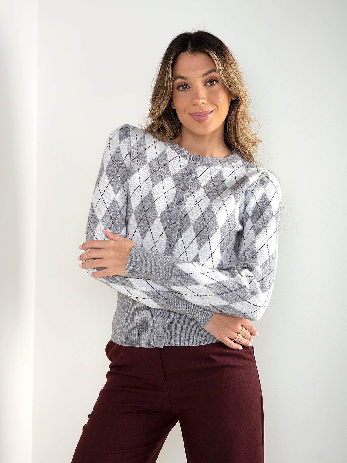 Cardigan em malha macia com padrão losangos e decote redondo, disponível em várias cores. Modelo clássico com botões frontais e punhos canelados. Ideal para looks em camadas.
