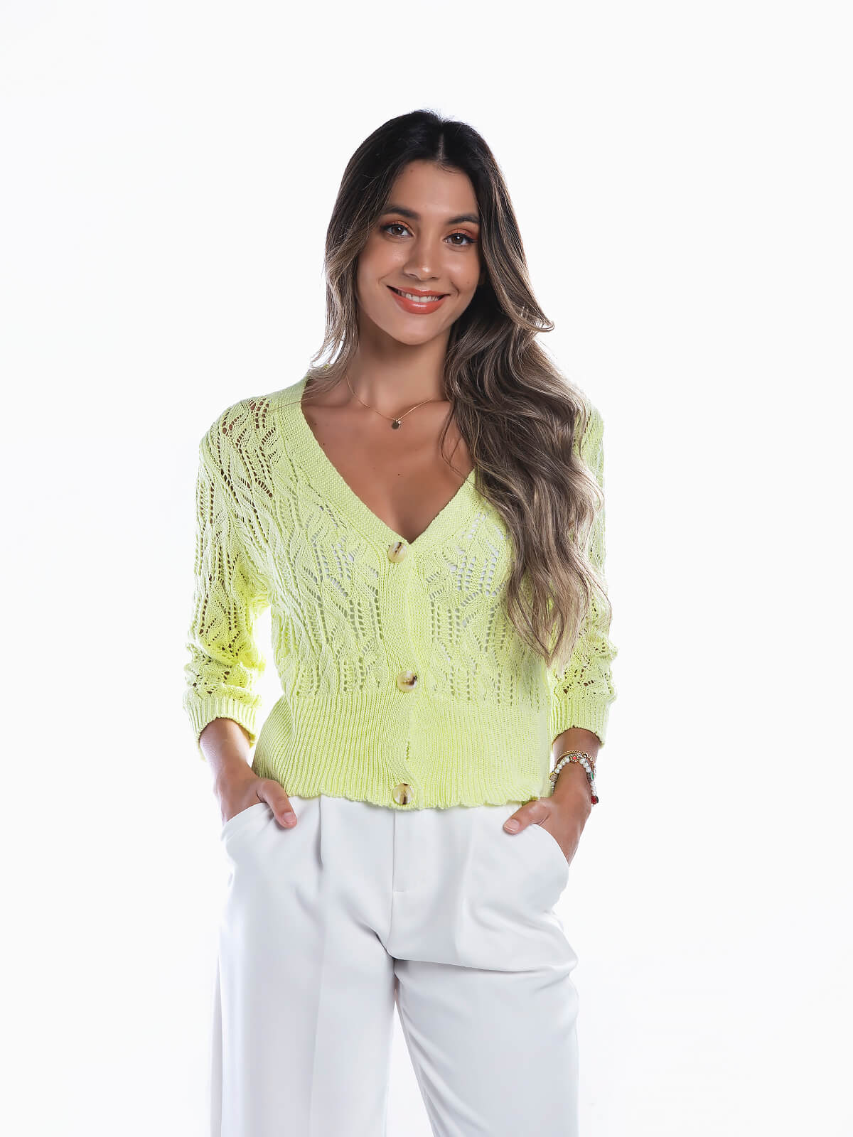 Cardigan verde claro em malha rendilhada para senhora. Casaco de malha com decote em bico. Extremidades caneladas. Aperto de botões.