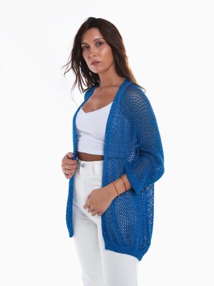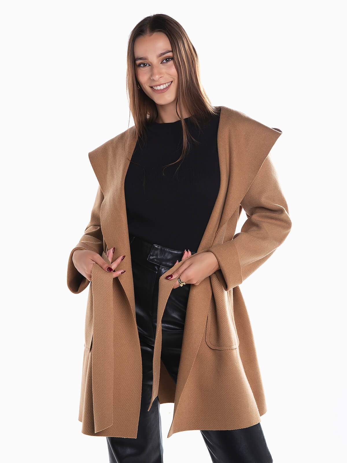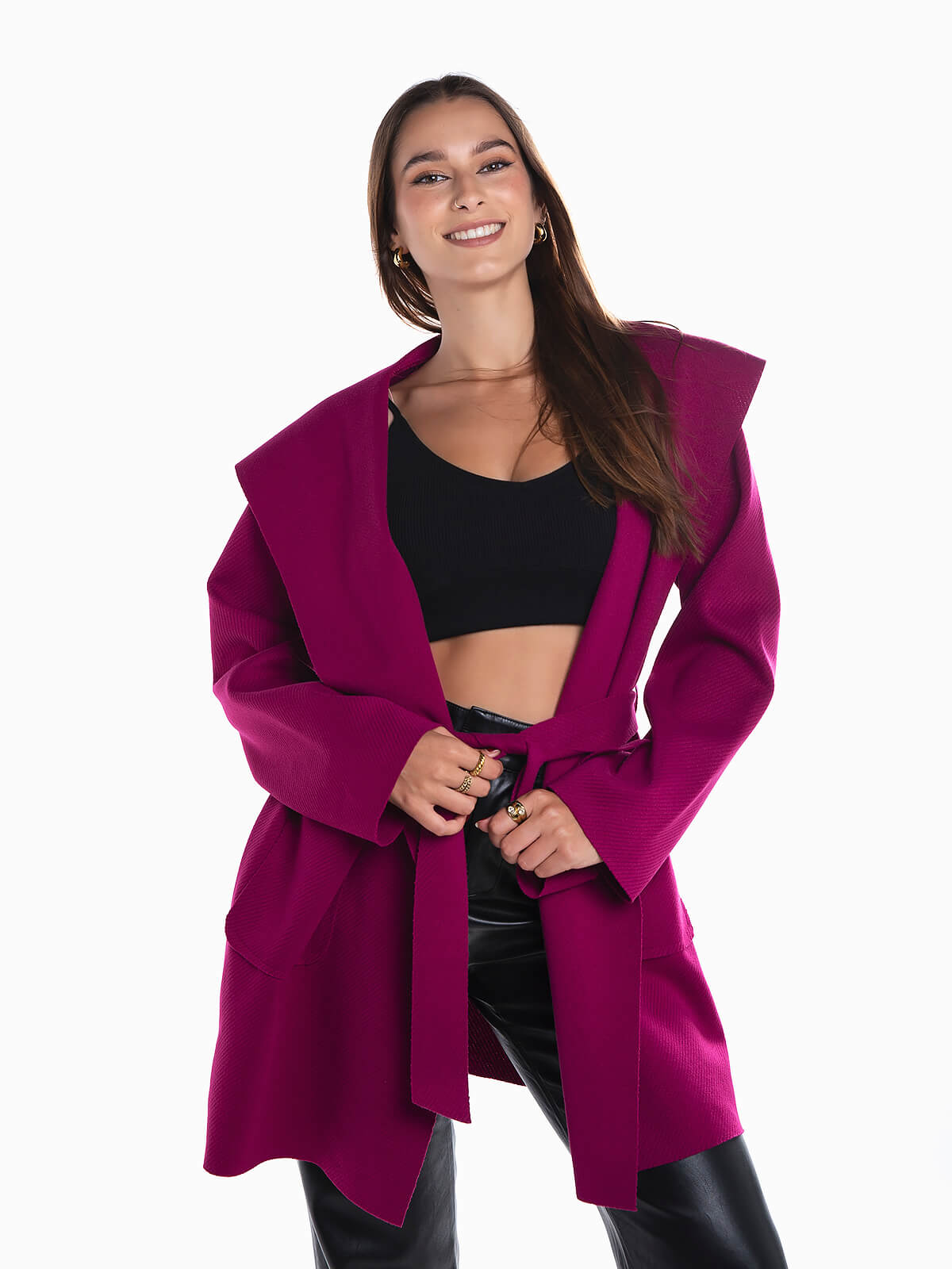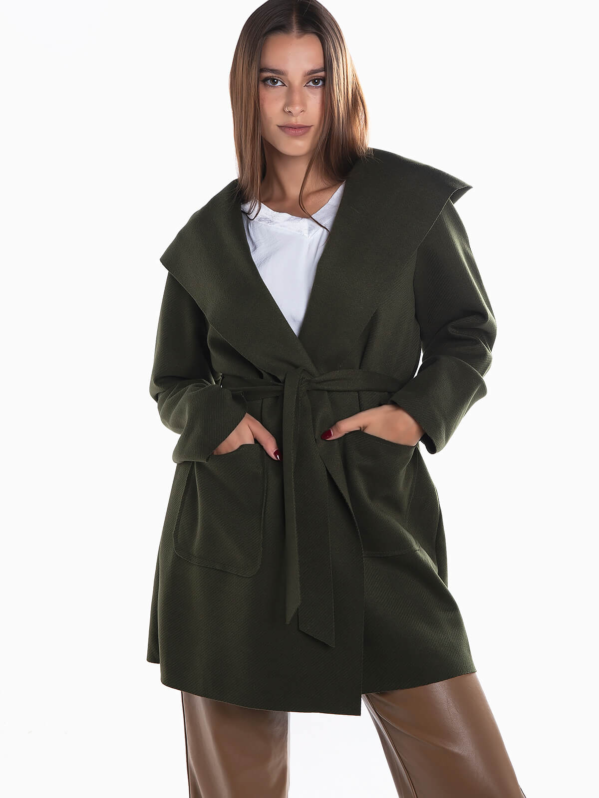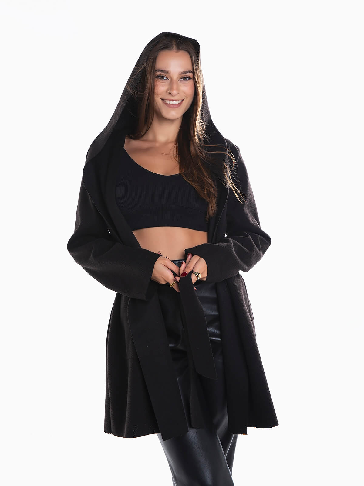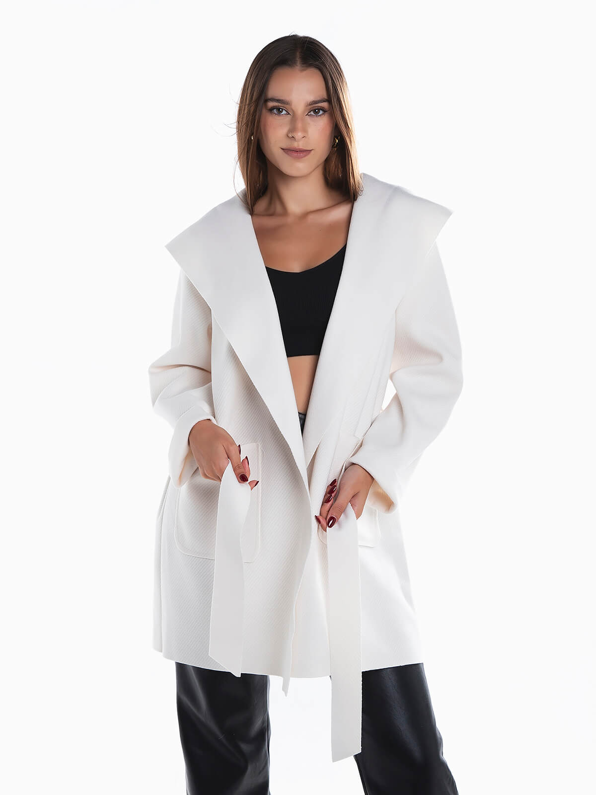 Casaco aberto com capuz e cinto para ajustar. Casaco canelado em fazenda com 2 bolsos quadrados.