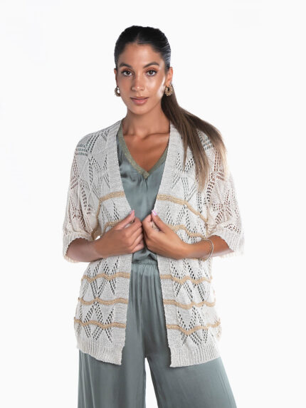 Casaco em malha de ponto aberto com fios lurex para efeito brilhante. Casaco aberto com manga 3/4.