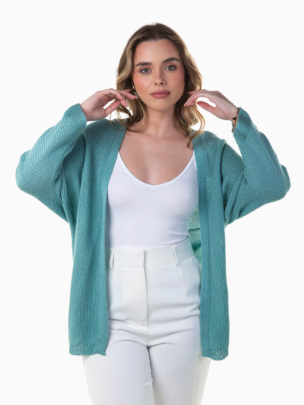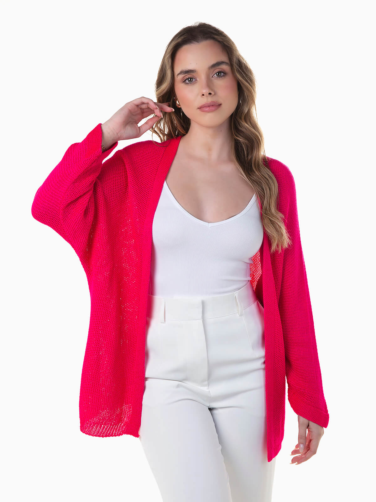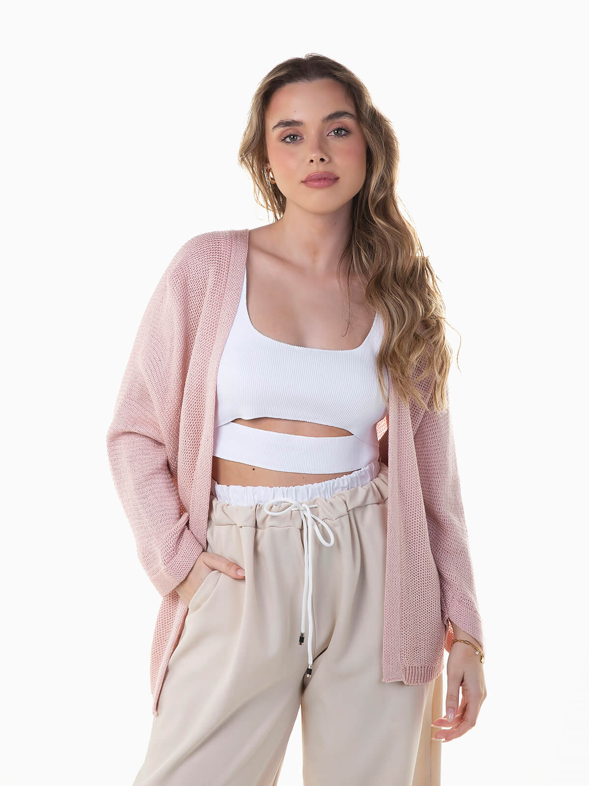 Casaco aberto em malha fina rendilhada para senhora. Casaco de manga comprida.