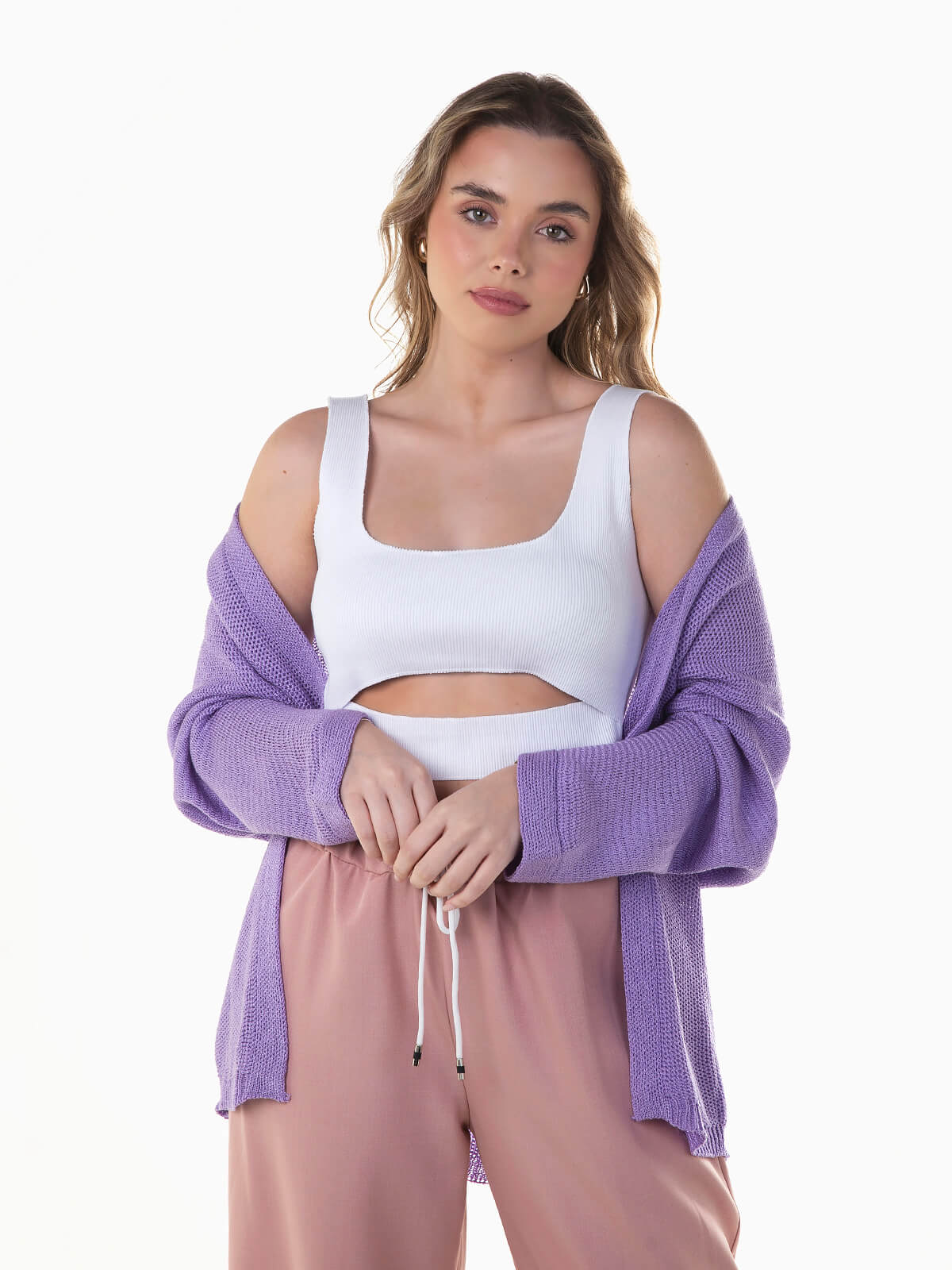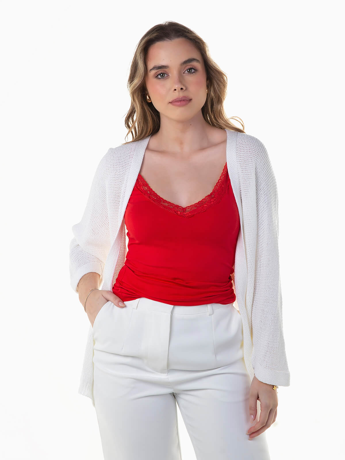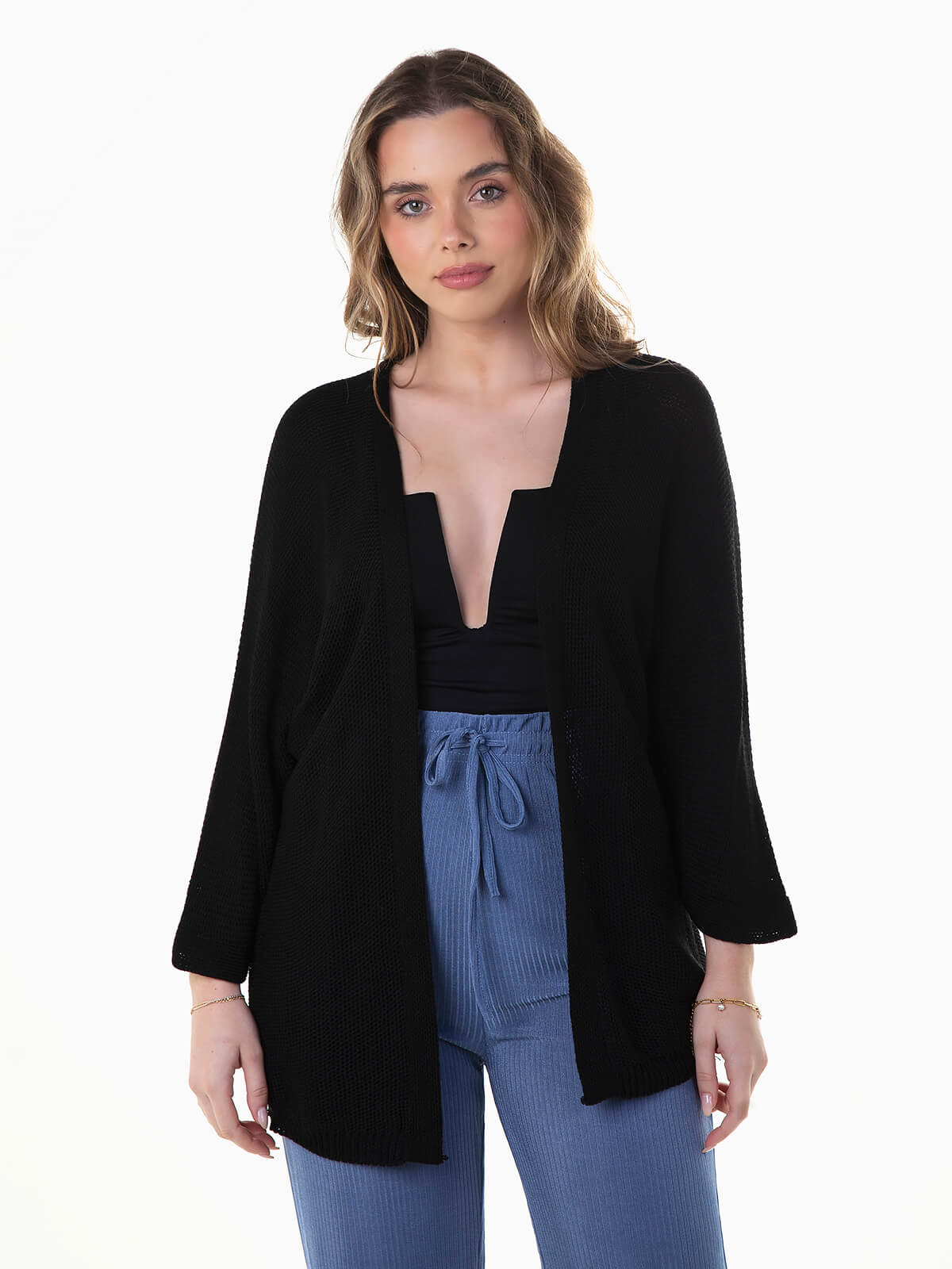 Casaco aberto em malha fina rendilhada para senhora. Casaco de manga comprida.