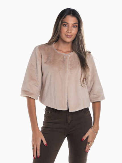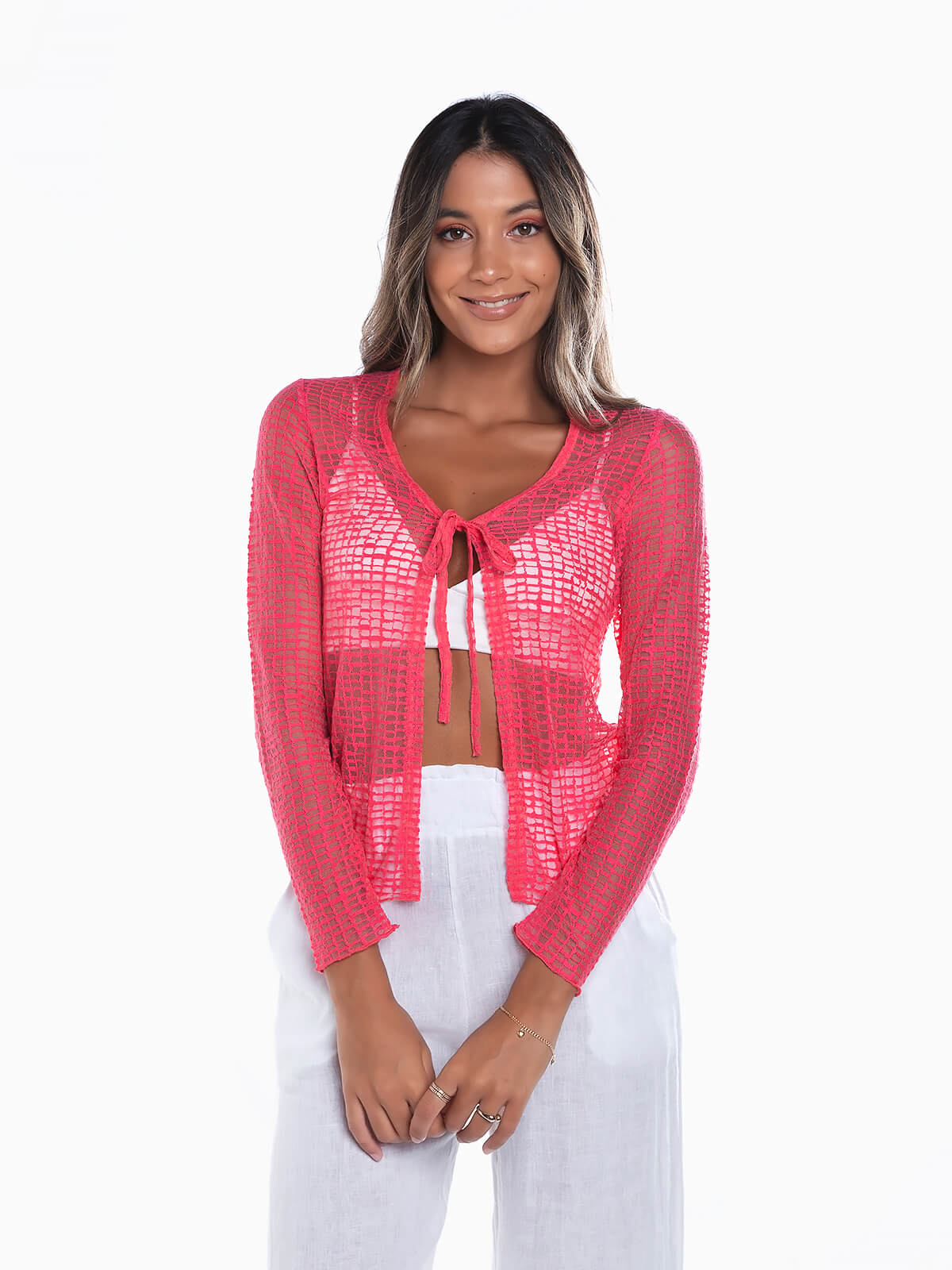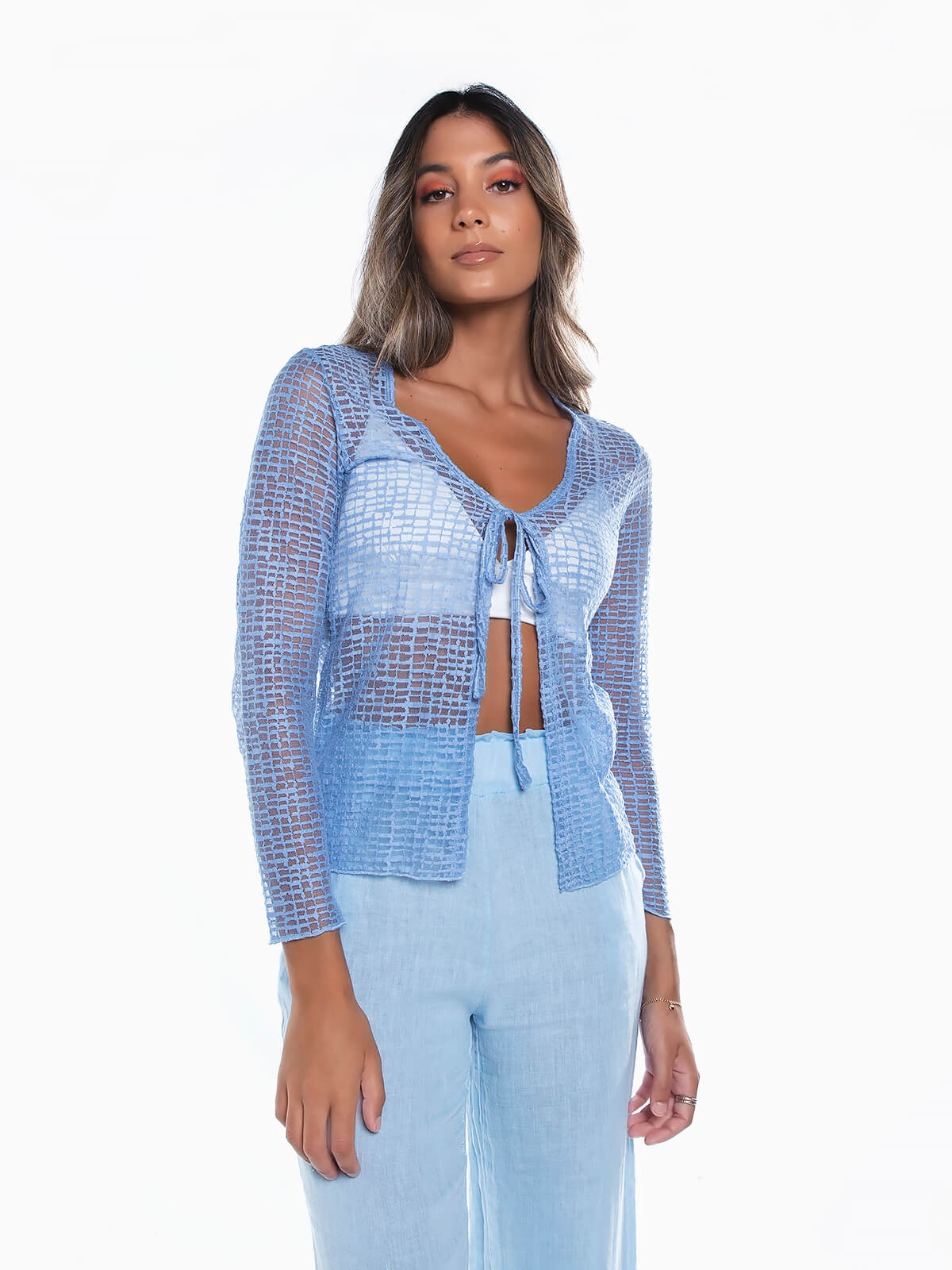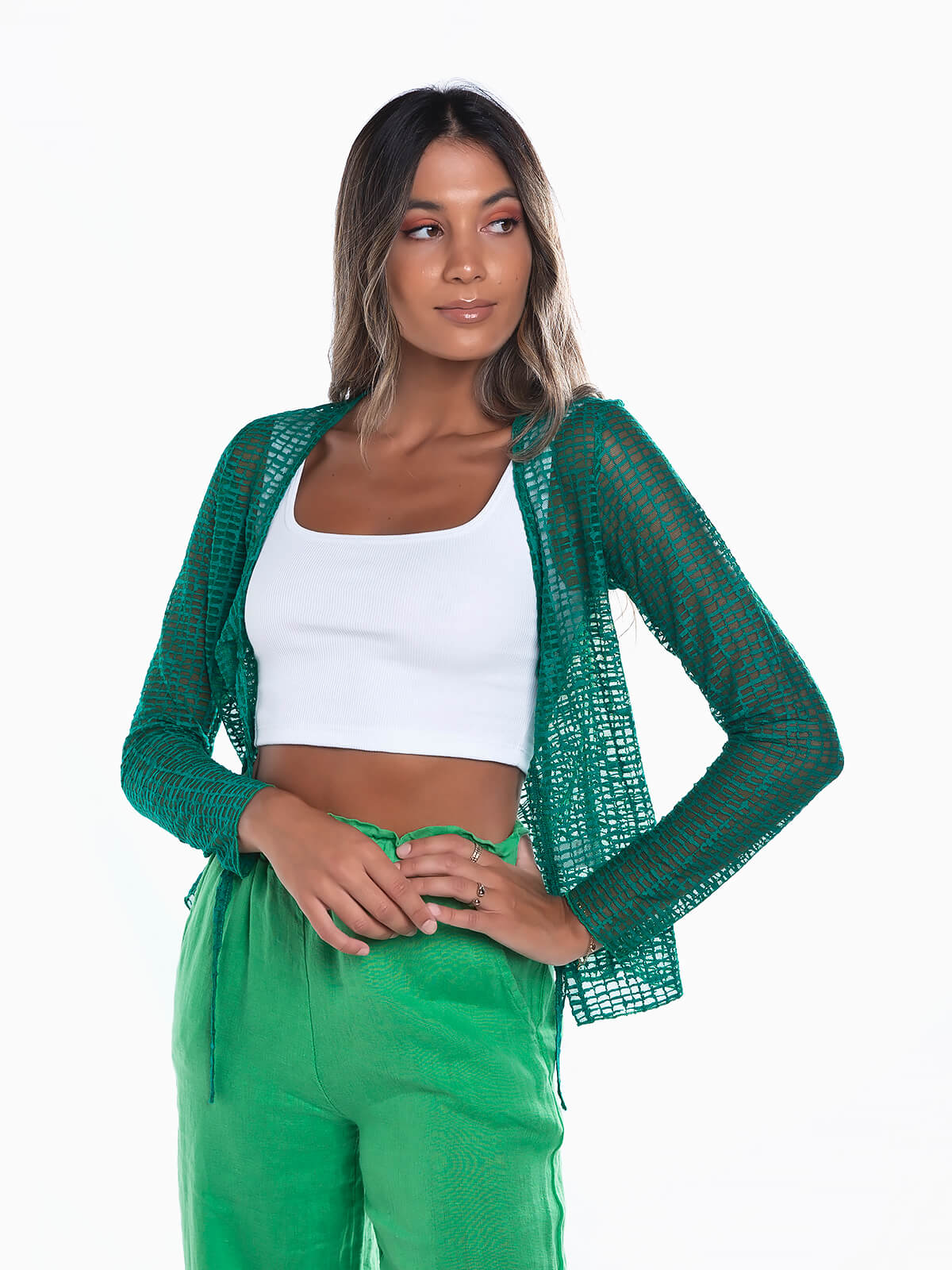 Casaco aberto transparente para senhora. Casaco em renda com aperto de cordão para laço. Manga comprida.