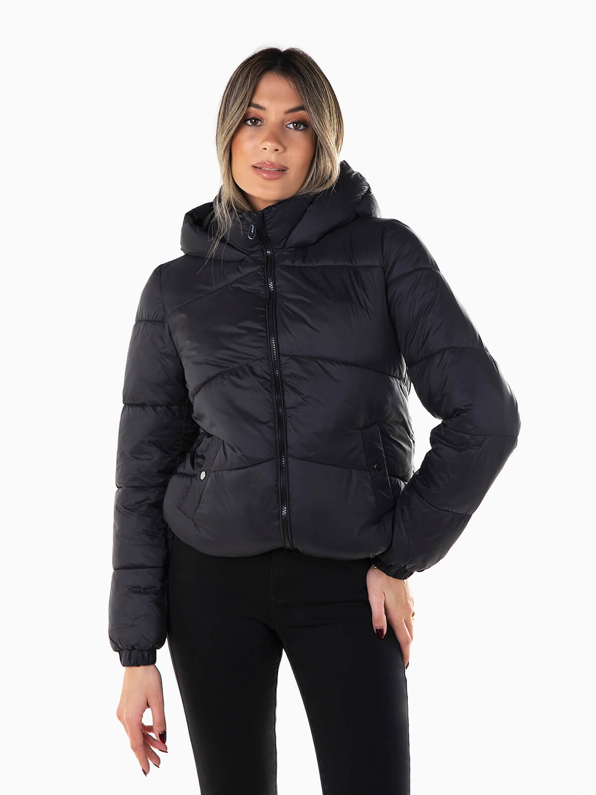 Casaco acolchoado impermeável para senhora. Blusão manga comprida com gola alta e punhos elásticos. 2 bolsos. Base com elástico para ajustar. Aperto fecho zíper.