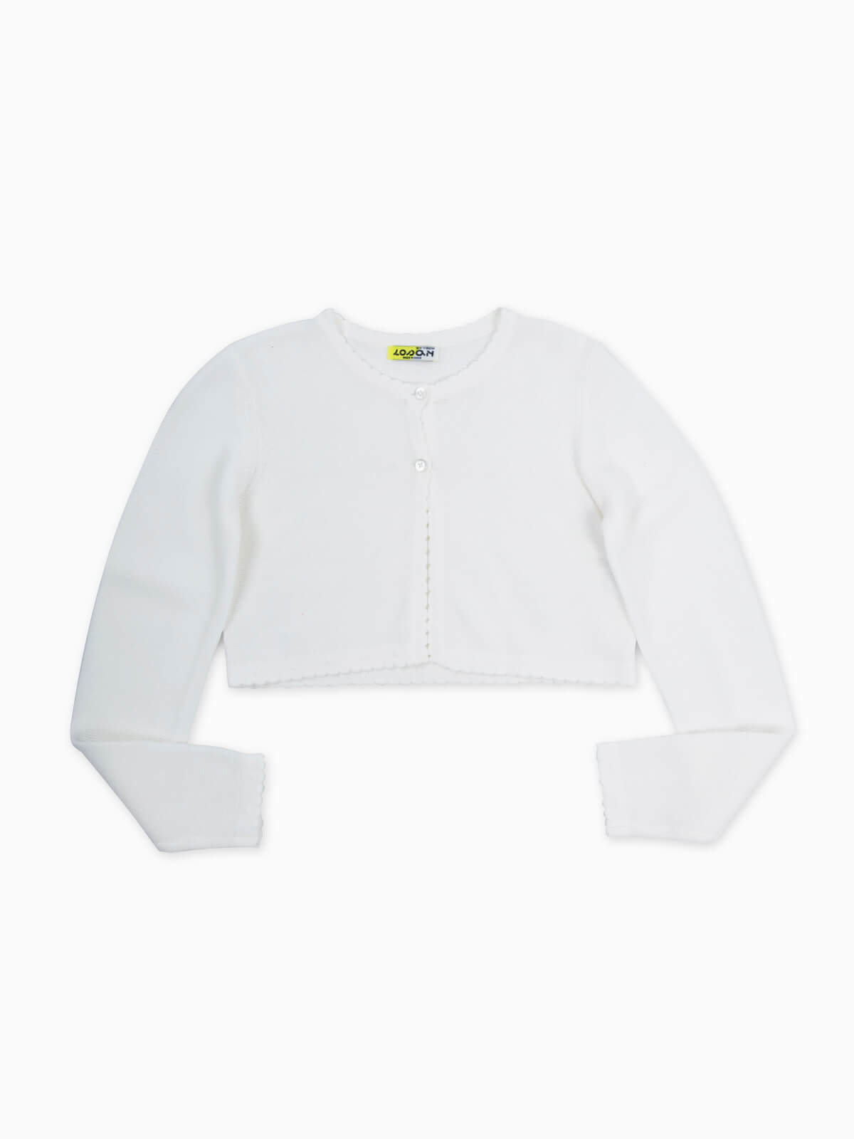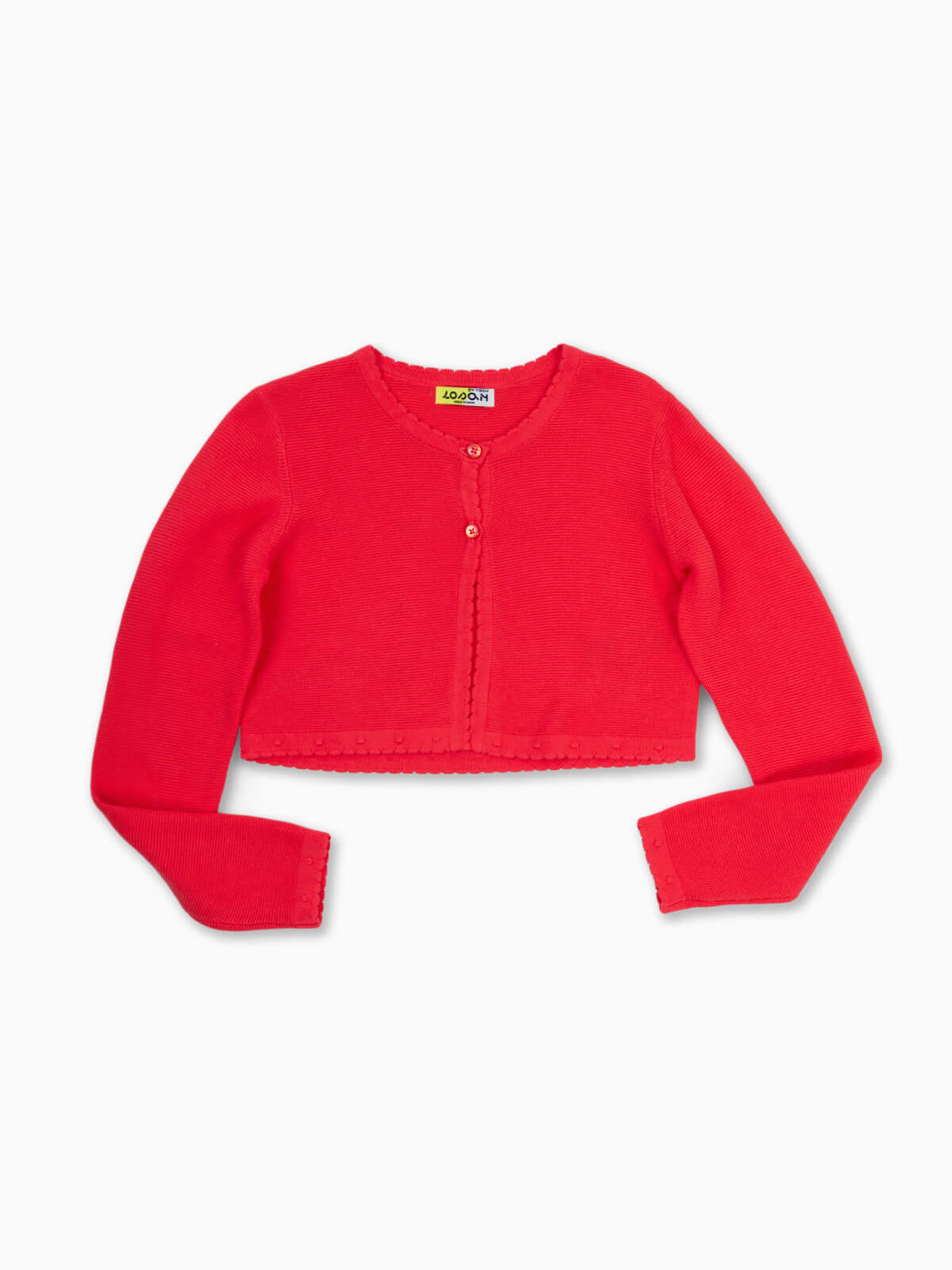 Casaco bolero em malha com textura para menina. Casaco curto com decote redondo. Manga comprida. Aperto frontal de dois botões.