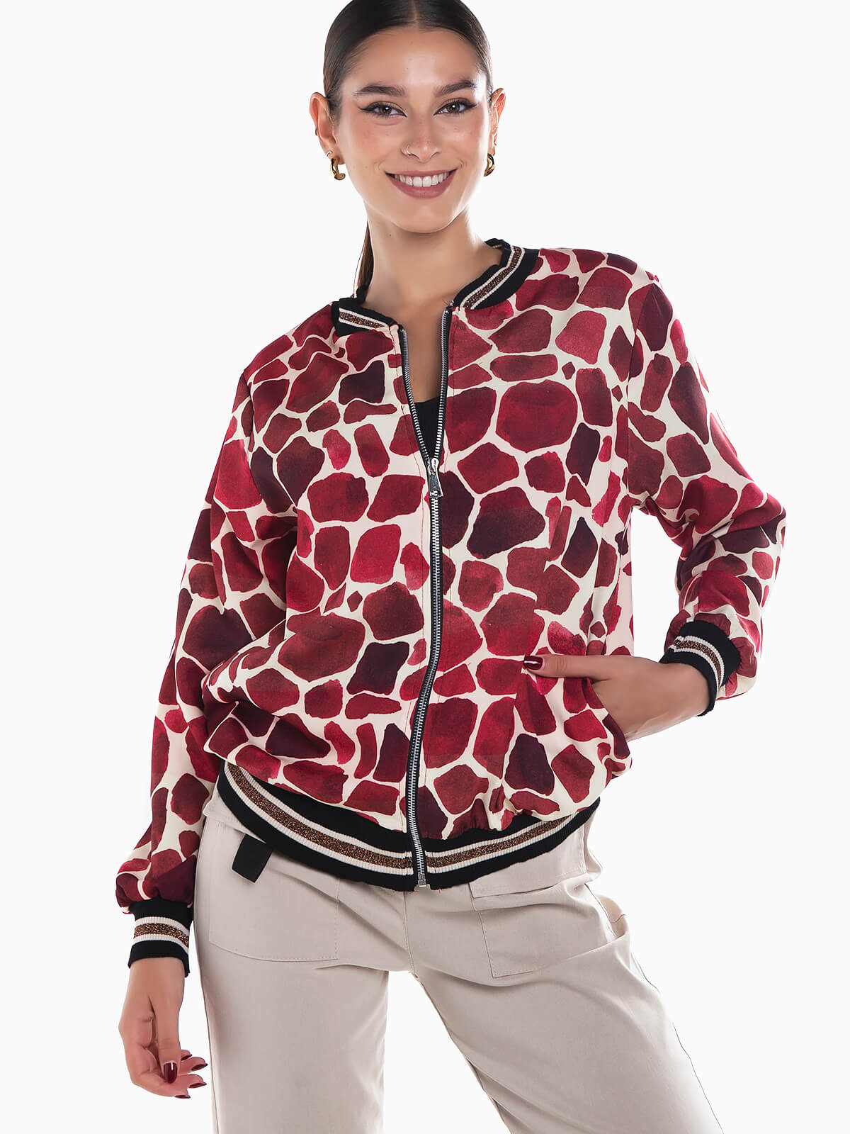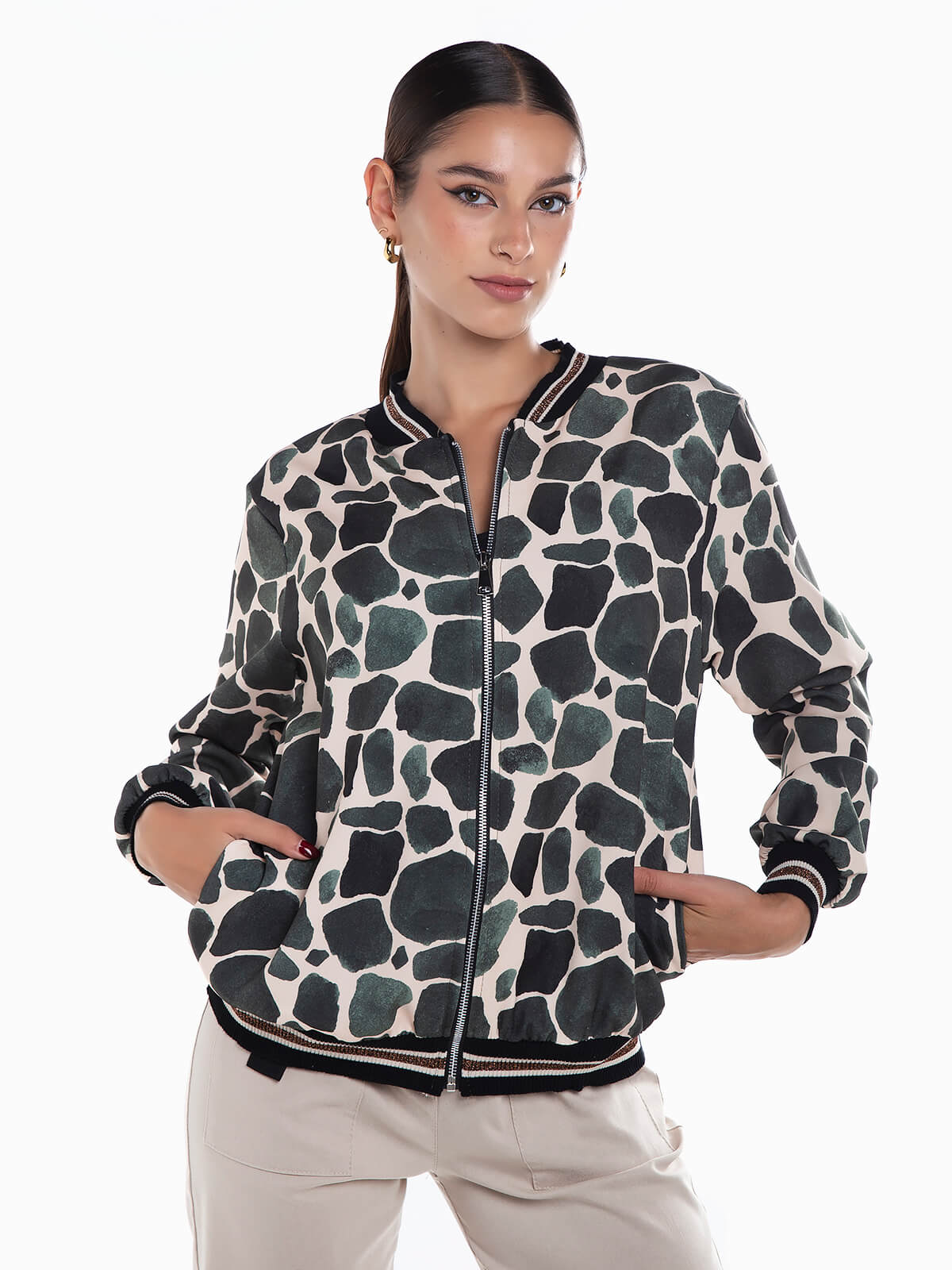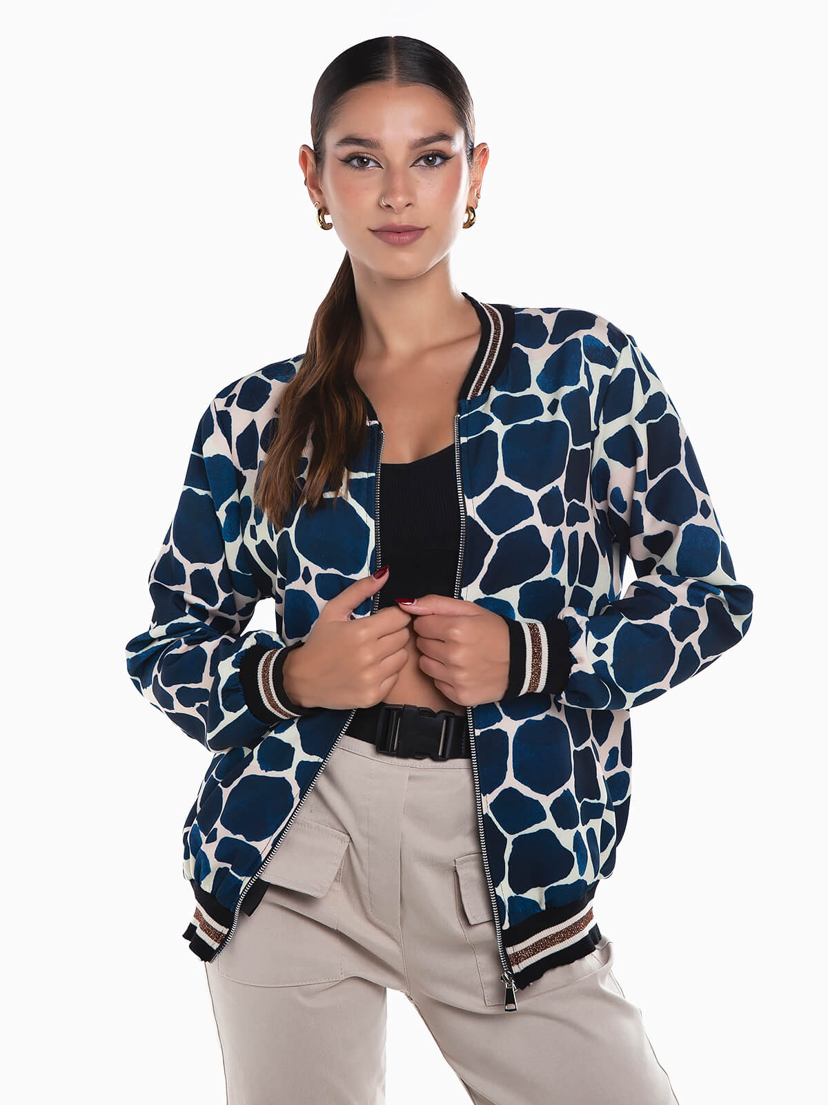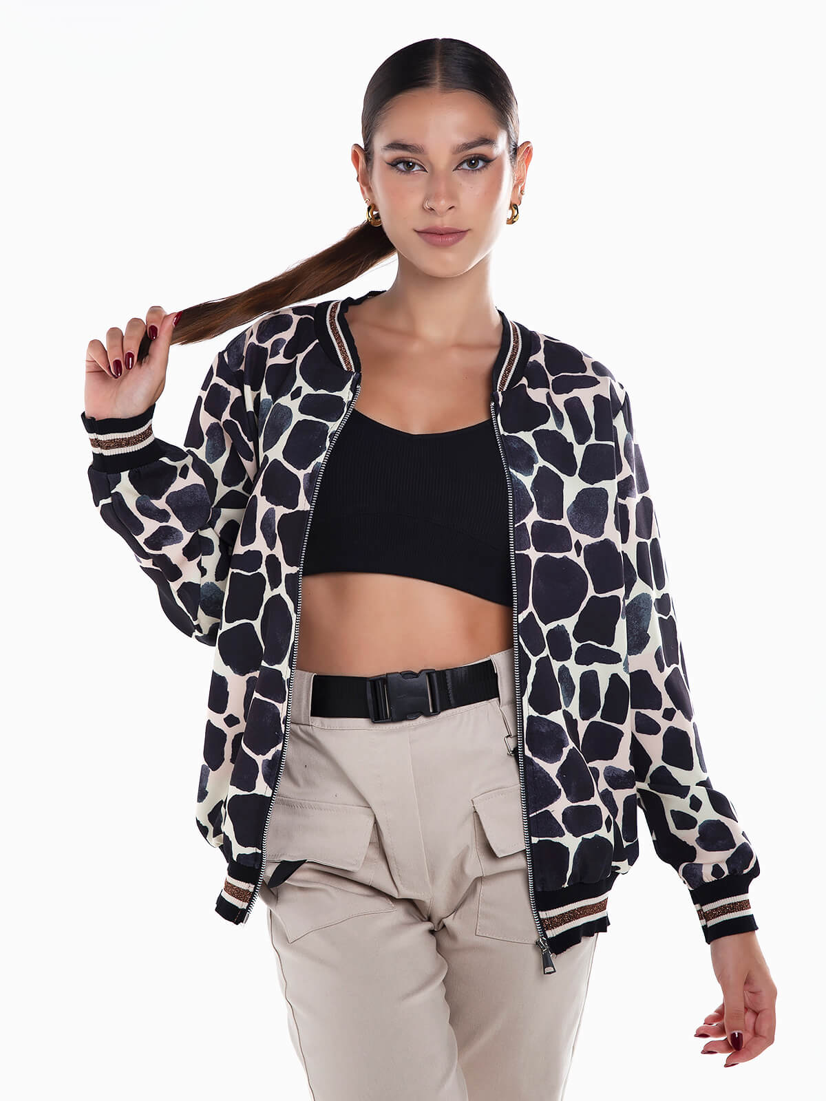 Casaco bomber com animal print para senhora. Casaco manga comprida com acabamentos elásticos brilhantes. Decote redondo. Aperto frontal de fecho zíper.