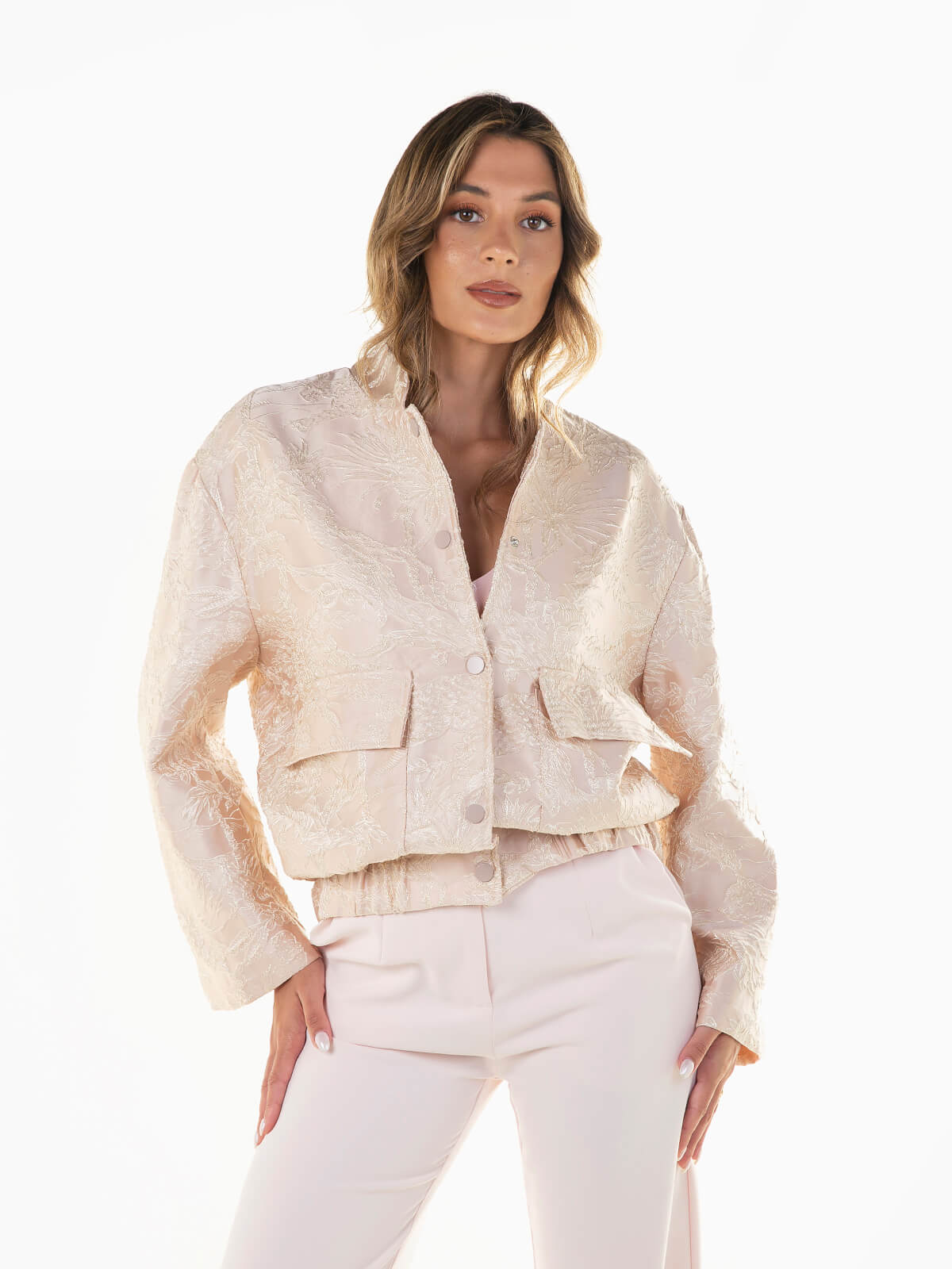 Casaco bomber com bordado floral em relevo. Modelo forrado com gola subida, fecho frontal e bolsos com pala, disponível em várias cores. Aperto frontal de botões. Uma peça com personalidade que alia a estrutura de um bomber à delicadeza do detalhe floral — ideal para looks marcantes e femininos.
