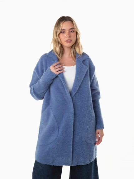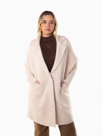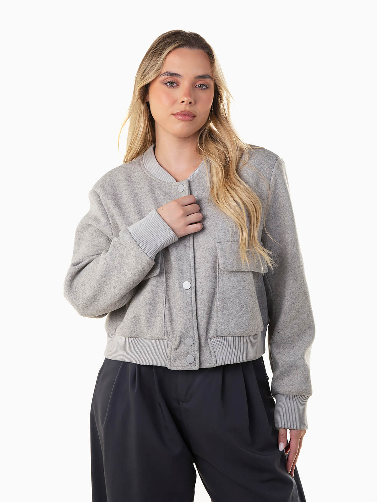 Casaco bomber em tecido tipo fazenda, com gola redonda e fecho frontal de botões de pressão. Modelo com dois bolsos frontais de pala e acabamentos canelados nos punhos e na bainha.