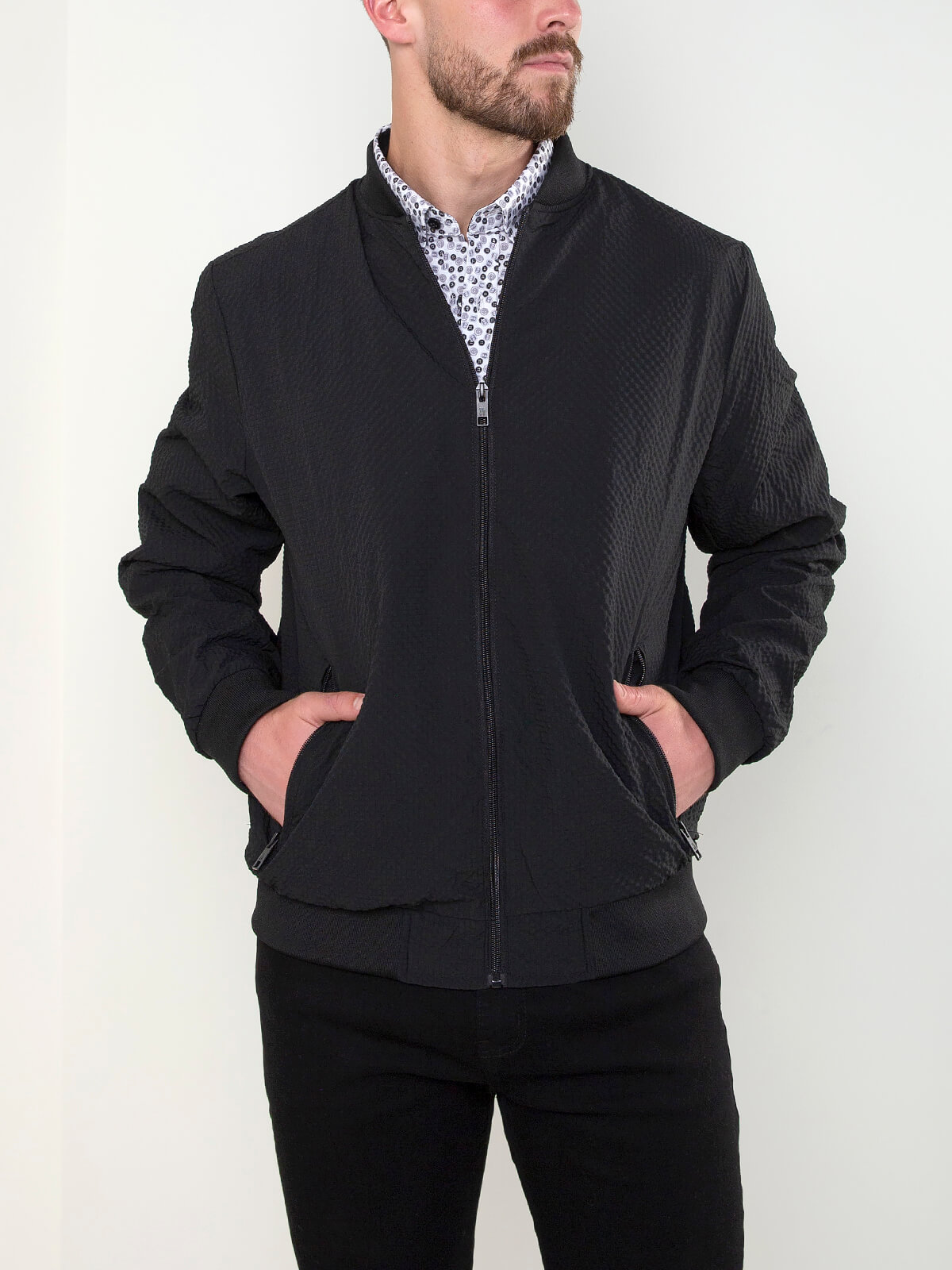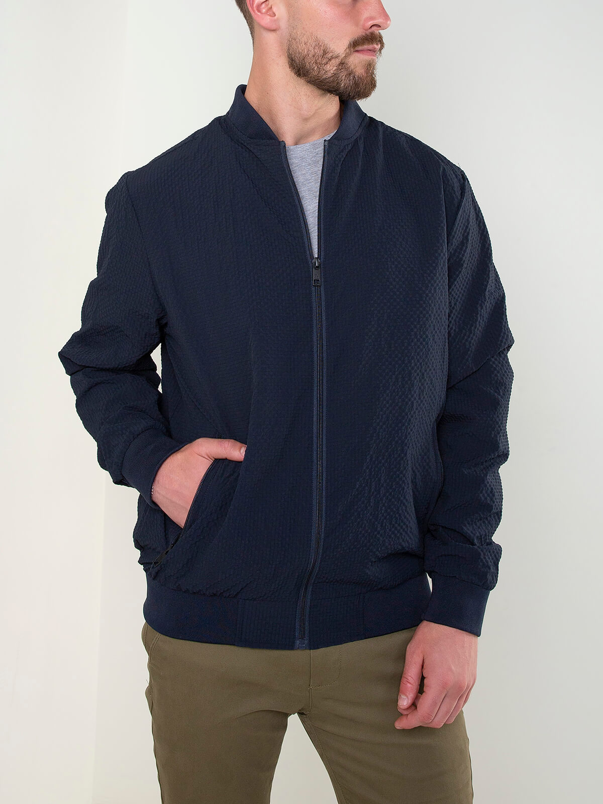 Casaco bomber estruturado de manga comprida com interior forrado. Bomber leve para homem com acabamentos elásticos. 2 bolsos e 1 interior. Aperto de fecho zíper.