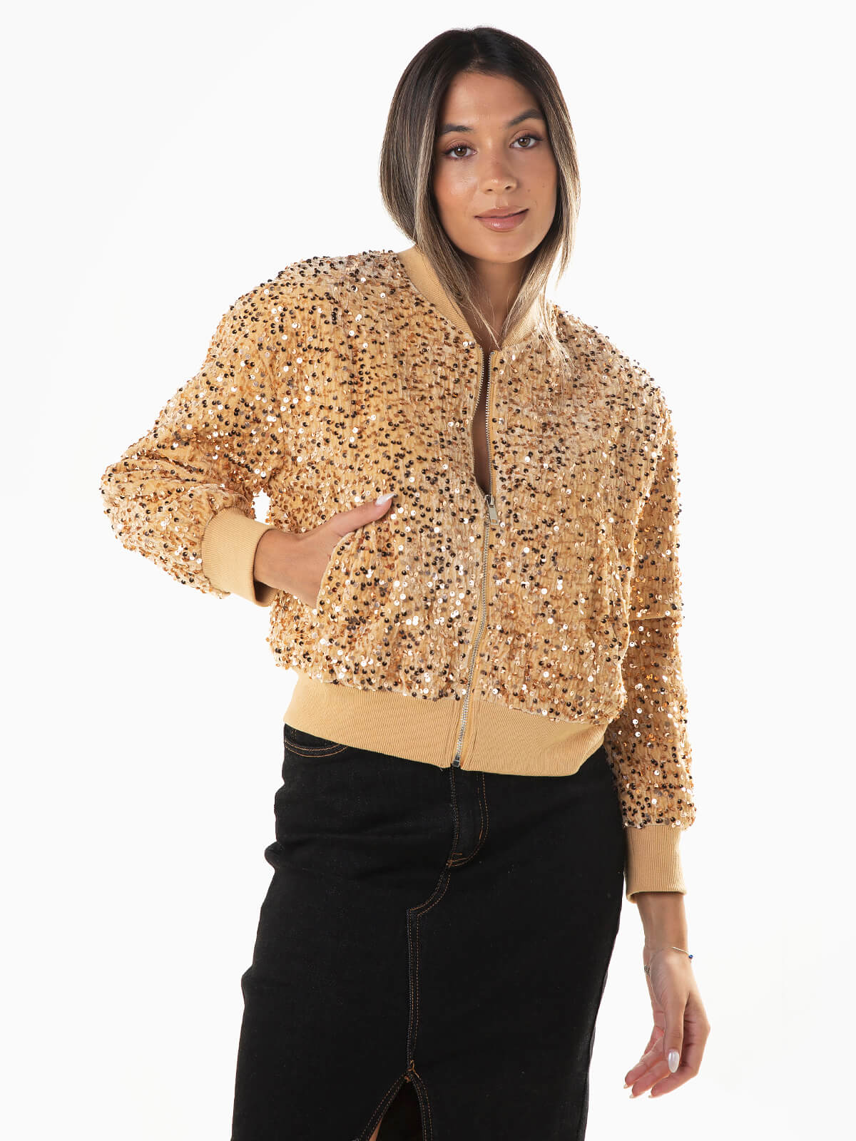Casaco bomber bege com lantejoulas e 2 bolsos. Bomber bege aveludado com extremidades elásticas e aperto fecho zíper.