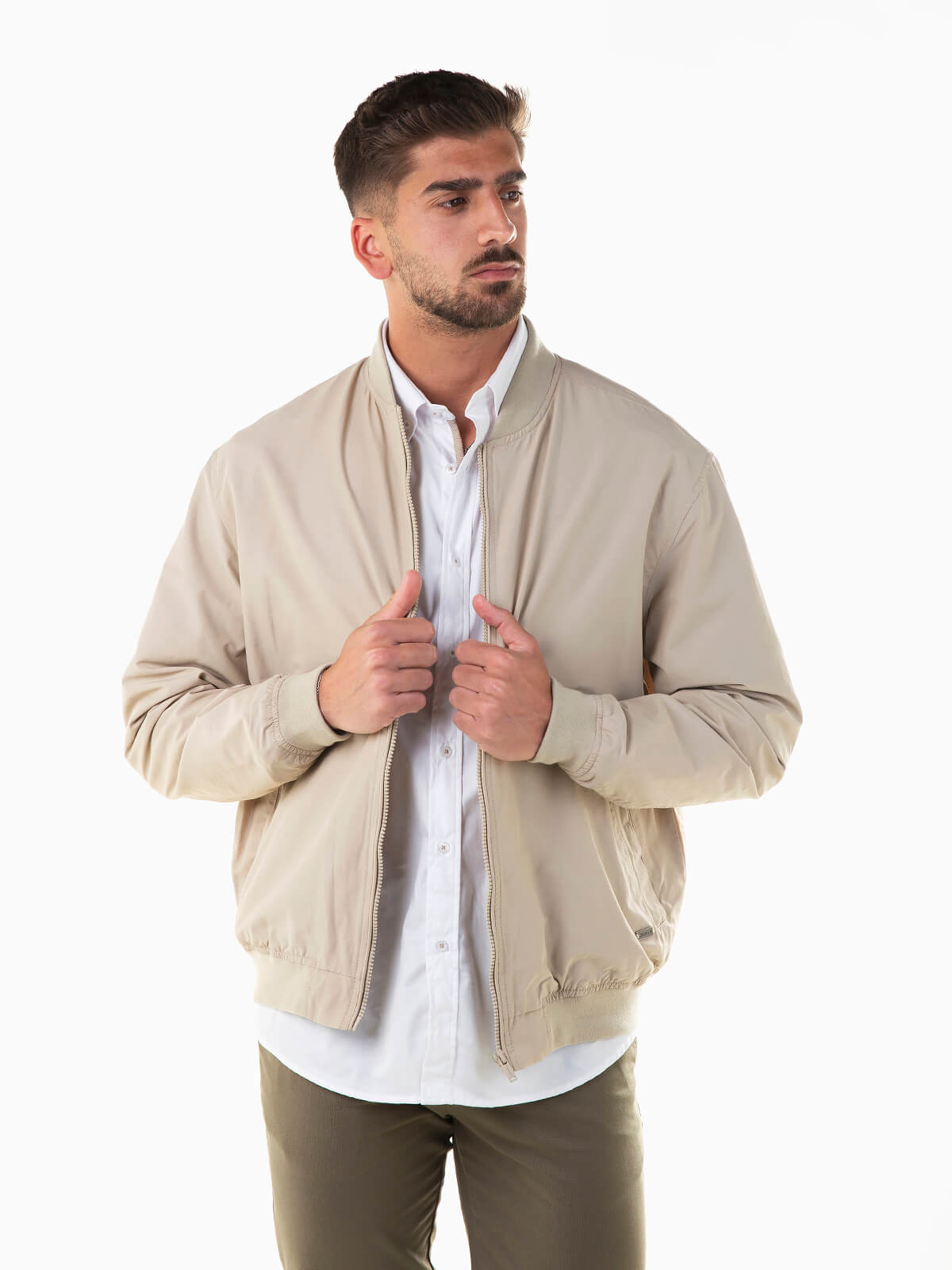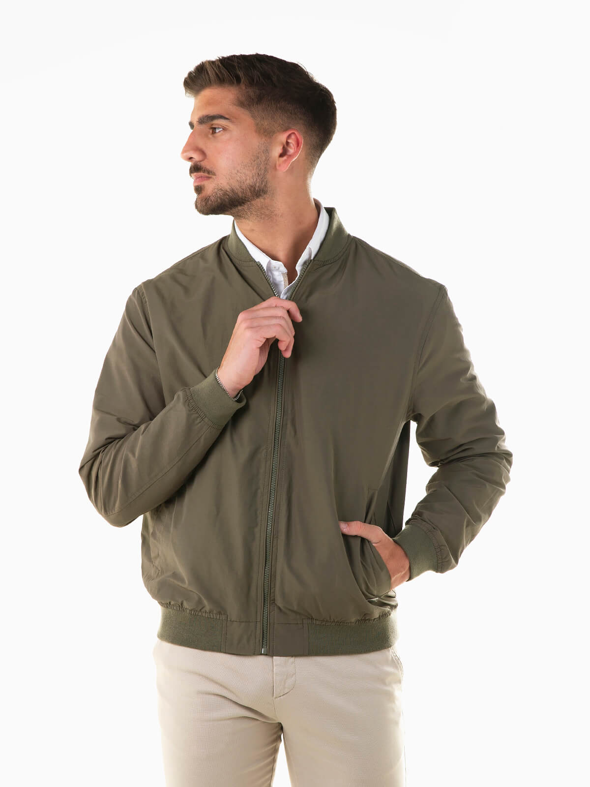 Casaco bomber leve de algodão para homem. Bomber manga comprida com extremidades em malha elástica. Interior forrado. 2 bolsos e 1 interior.