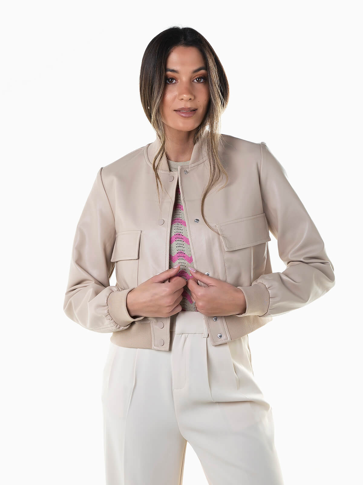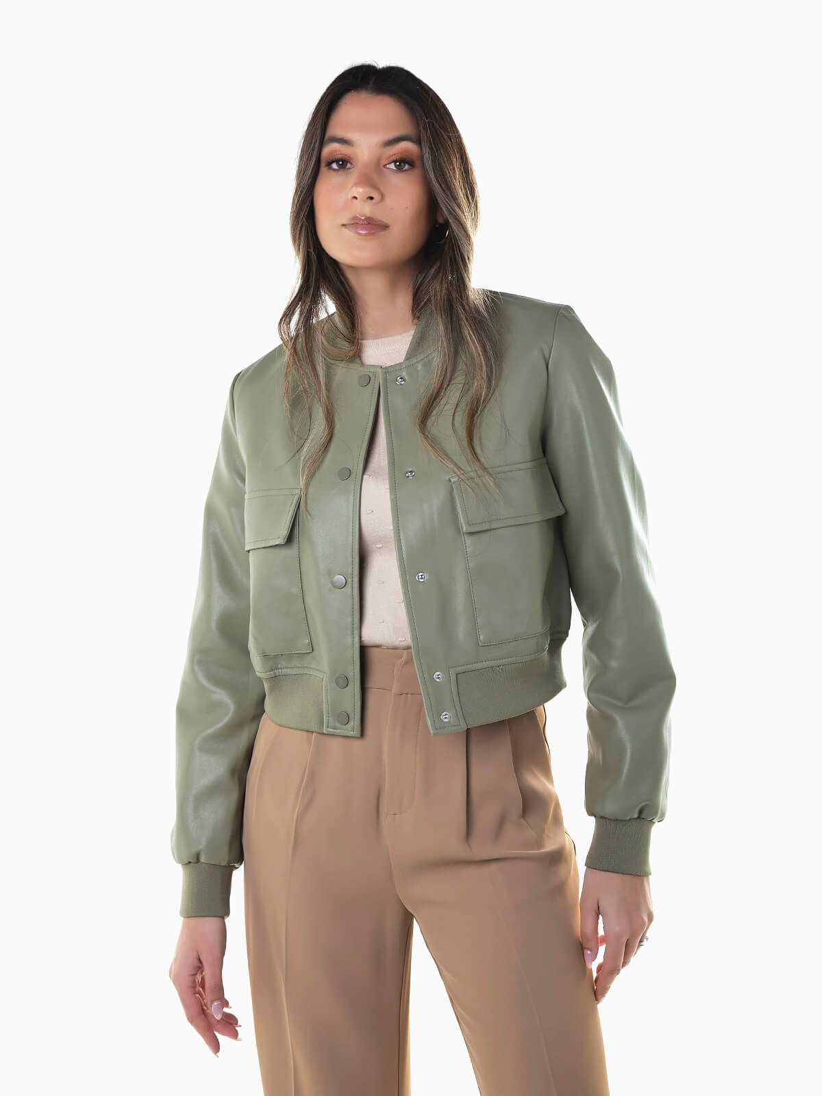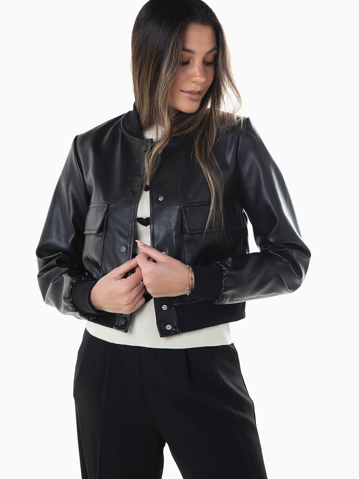 Casaco bomber efeito pele para senhora. Blusão manga comprida com acabamentos em malha. Gola subida. Interior forrado. 2 bolsos. Aperto de botões.