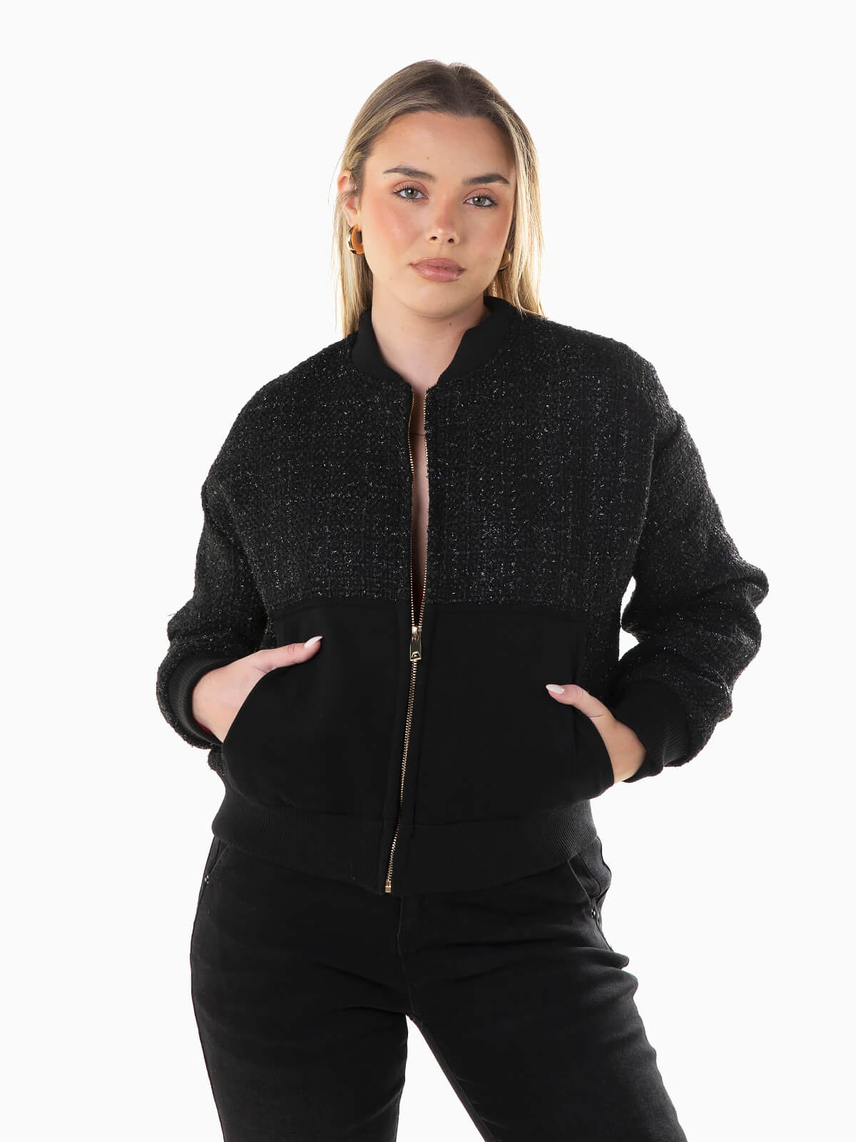 Casaco bomber em tweed para mulher. Bomber manga comprida com interior forrado com acabamentos canelados. Bolso canguro. Aperto frontal de fecho zíper.