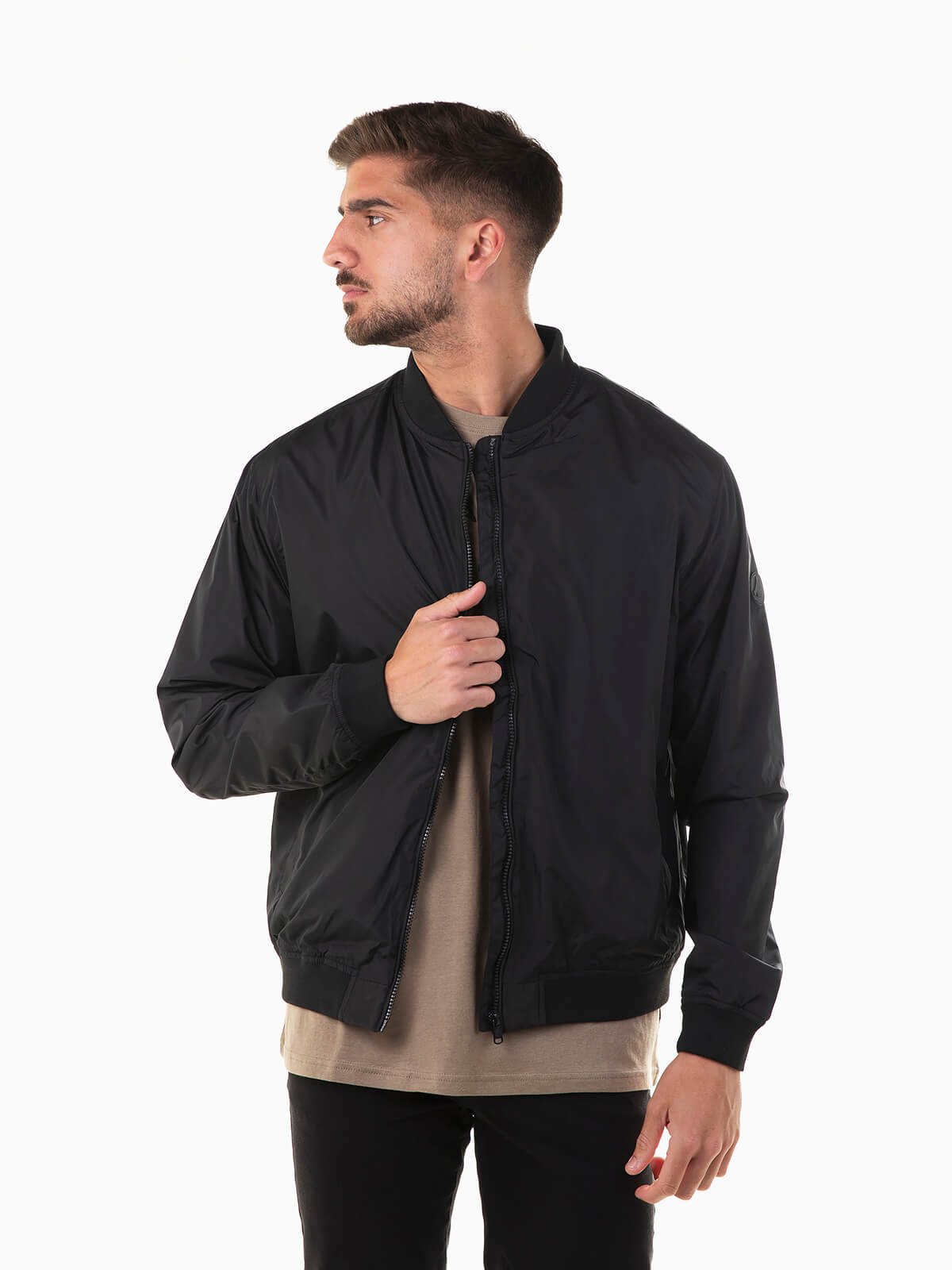 Casaco bomber preto com proteção para chuva ligeira. Bomber manga comprida com 2 bolsos. Acabamentos elásticos. Aperto de fecho zíper.